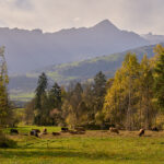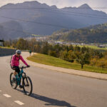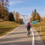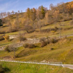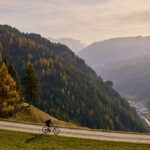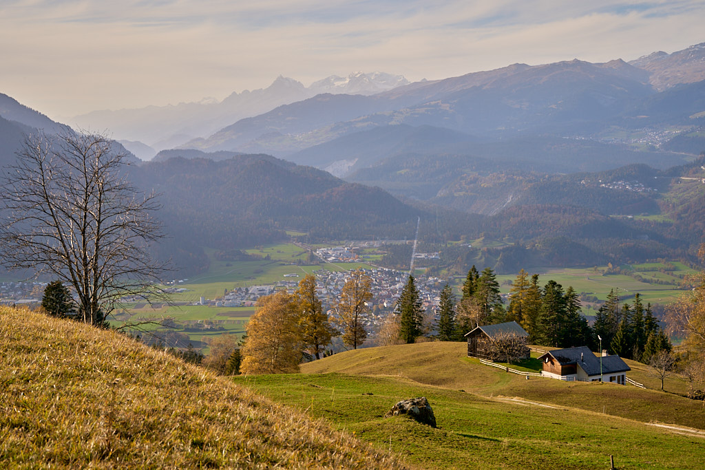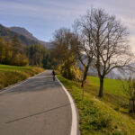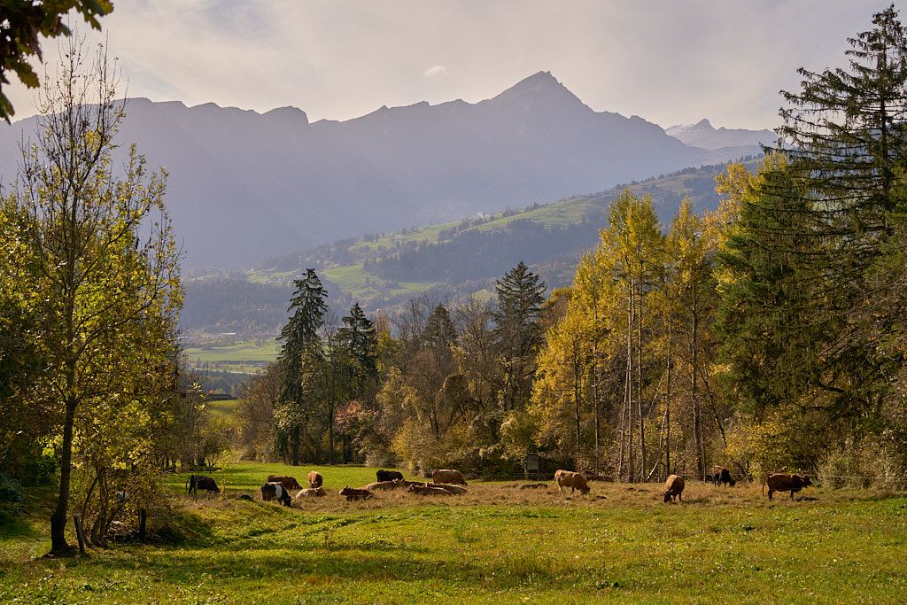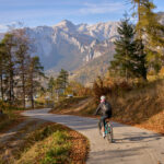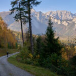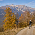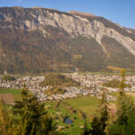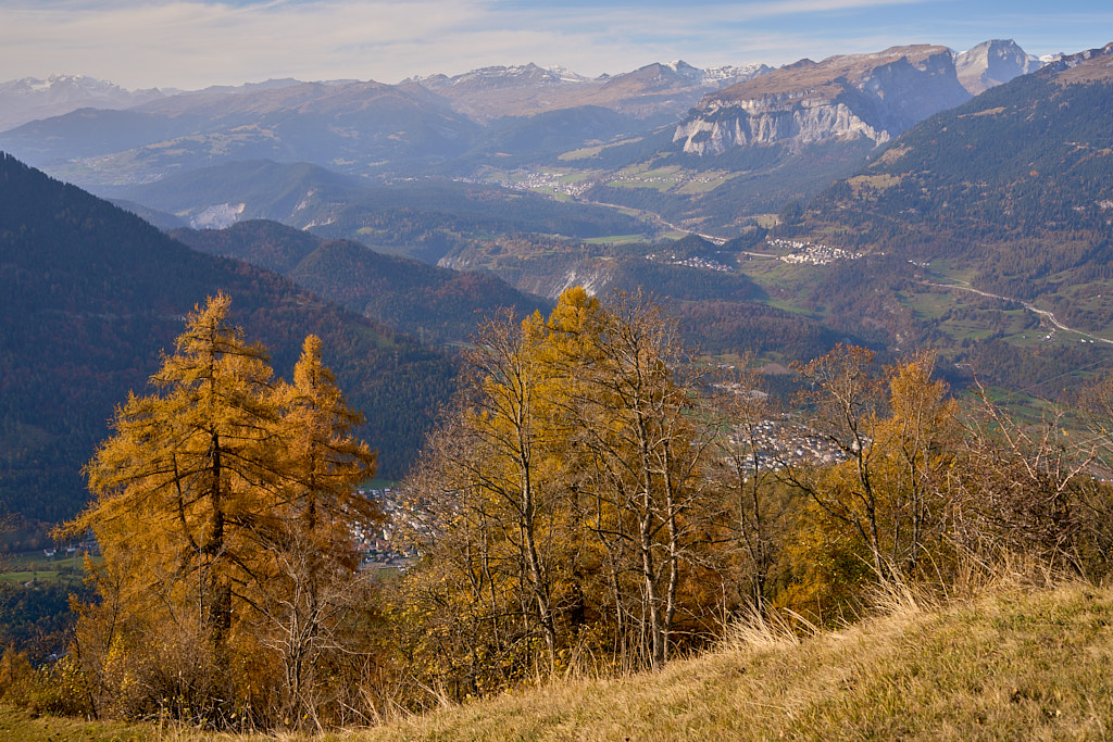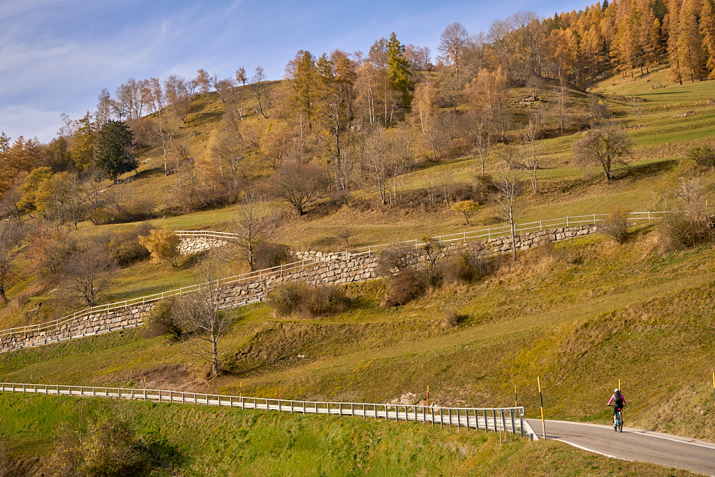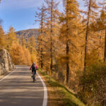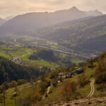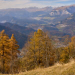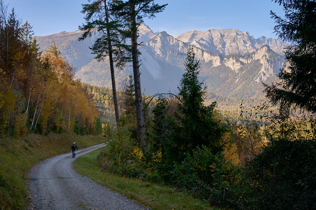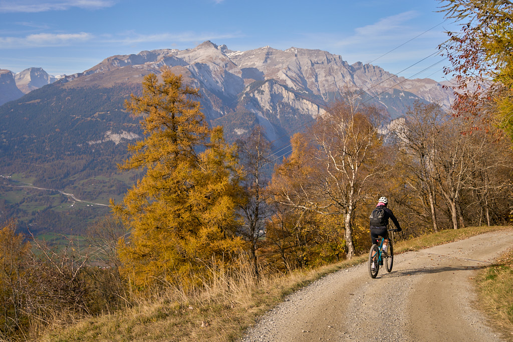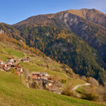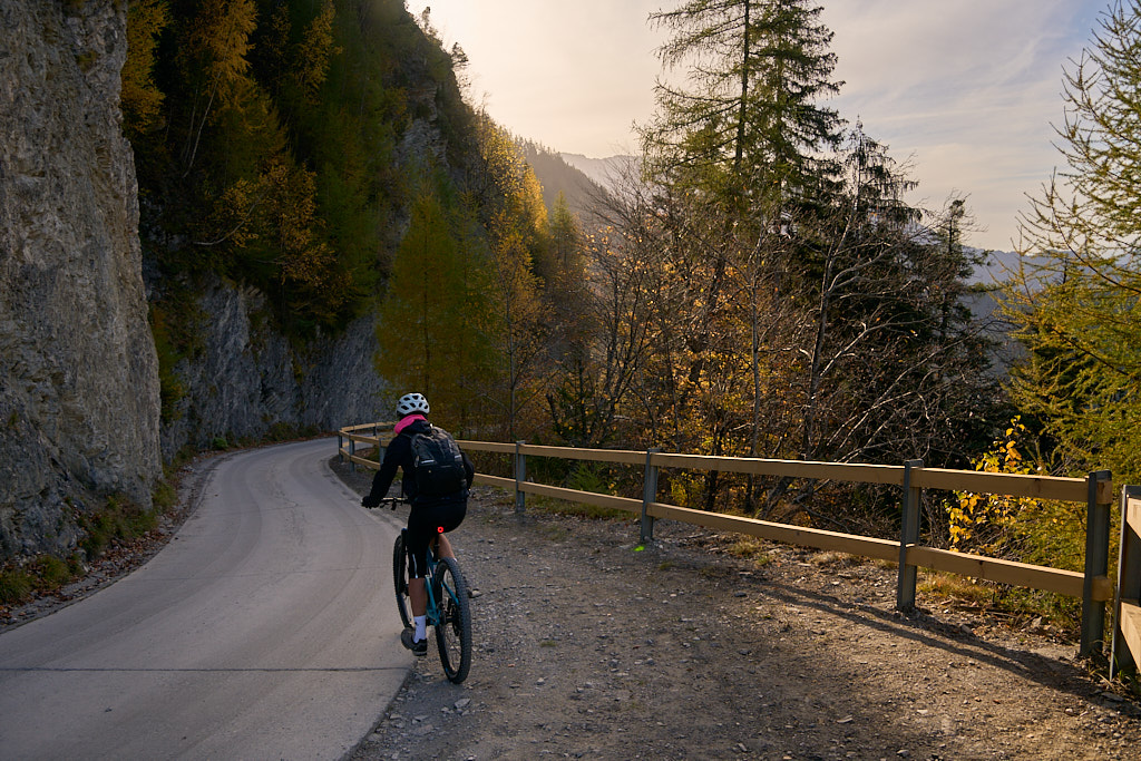 In Tomils begann der lange Aufstieg in vielen Schleifen nach Feldis. Während dies im Sommer eine schweisstreibende Etappe ist, wurde uns jetzt gerade einmal angenehm warm beim Fahren. Über dem Dorf Scheid auf halber Höhe erreichten wir Lärchenwälder, die immer noch gelb leuchteten und bei denen noch nicht alle Nadeln abgefallen waren. Wenig später kamen wir zum höchsten Punkt der Tour und erblickten erstmals Feldis vor dem eindrücklichen Panorama der Ringelspitzkette, die wir neulich von Bad Ragaz aus vergeblich gesucht hatten.