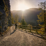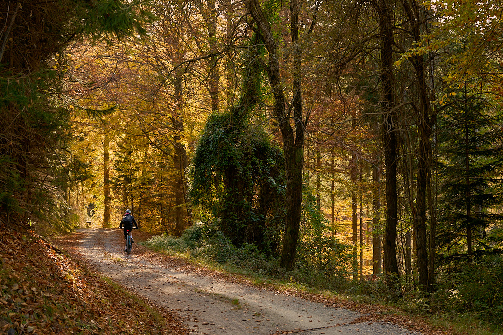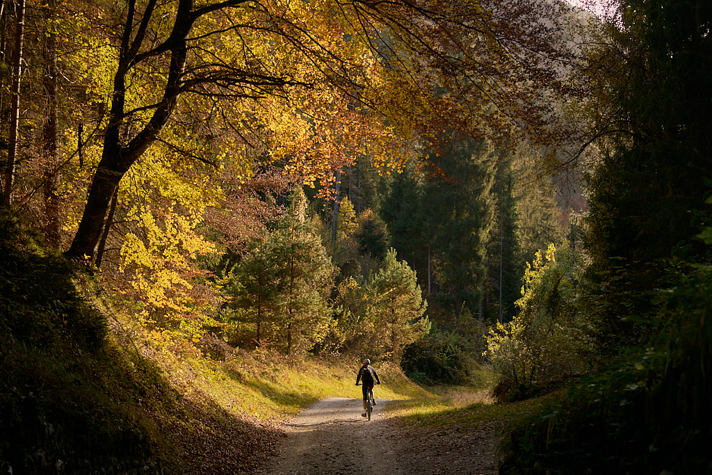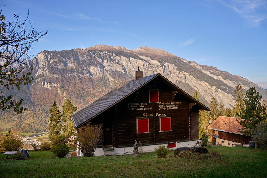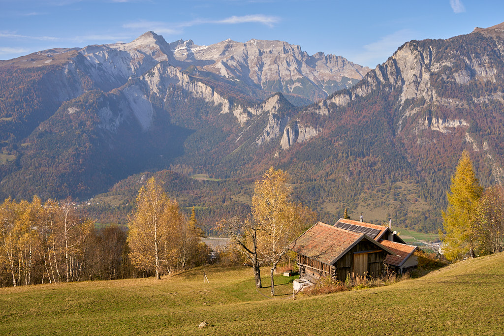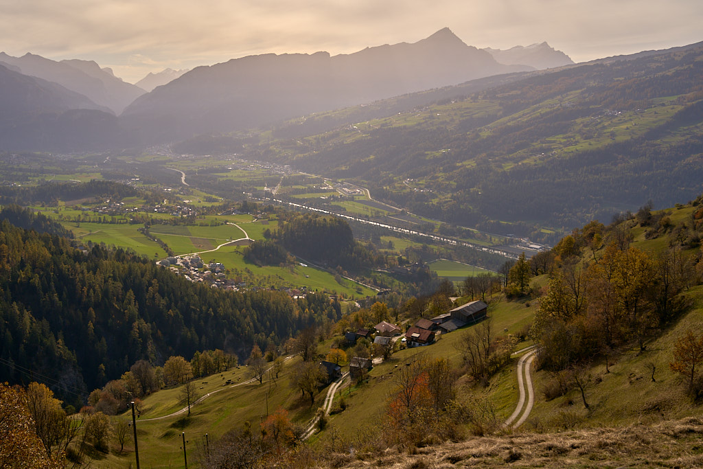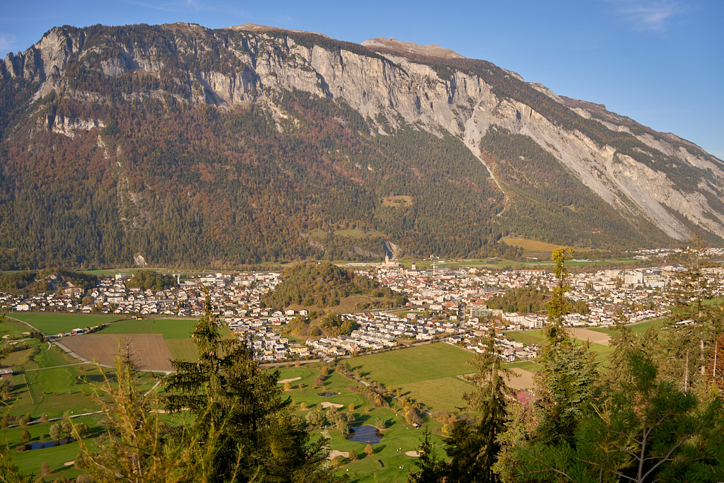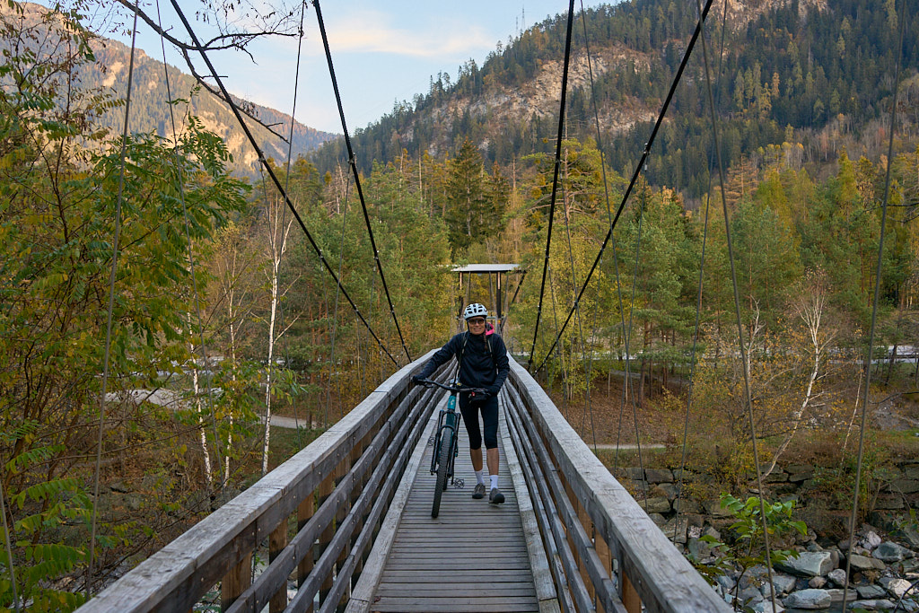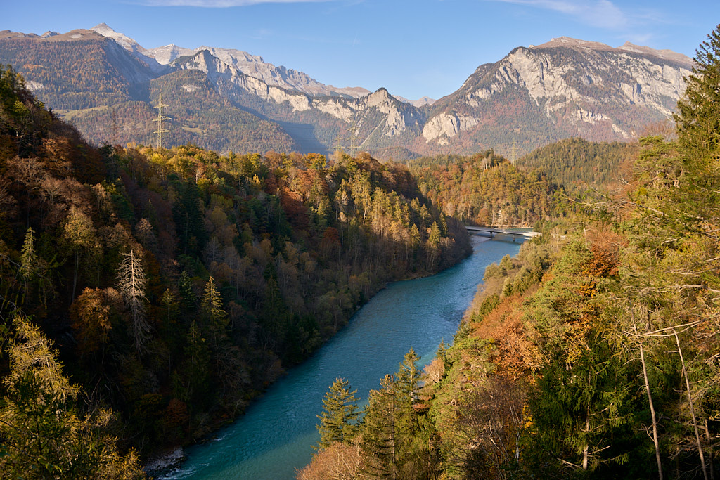 Bei der Kirche Sontga Frena und dem benachbarten „Chalet Verena” holte uns die Sonne wieder ein. Sie verschwand jedoch weiter unten wieder hinter den Bergen, als wir auf den Polenweg durch die Rheinschlucht bei Bonaduz stiessen. Weiter südlich auf dem Weg nach Rothenbrunnen kam sie wieder hinter dem Heinzenberg hervor und bescherte uns einen herrlich leuchtenden herbstlichen Laubwald.