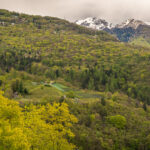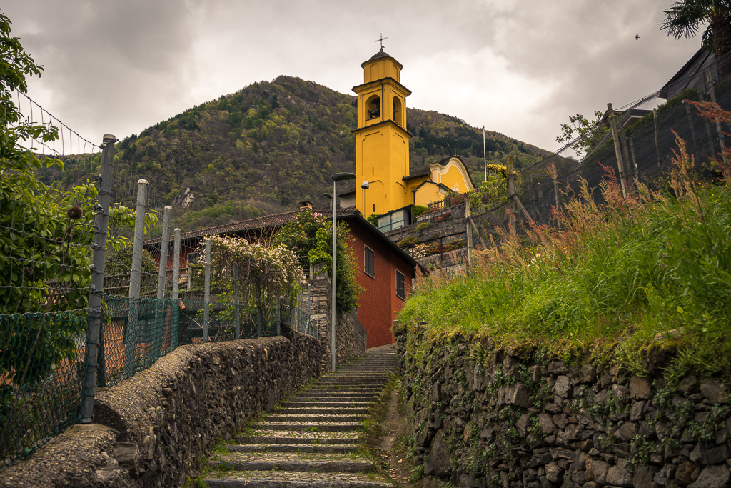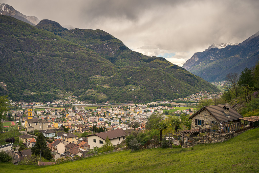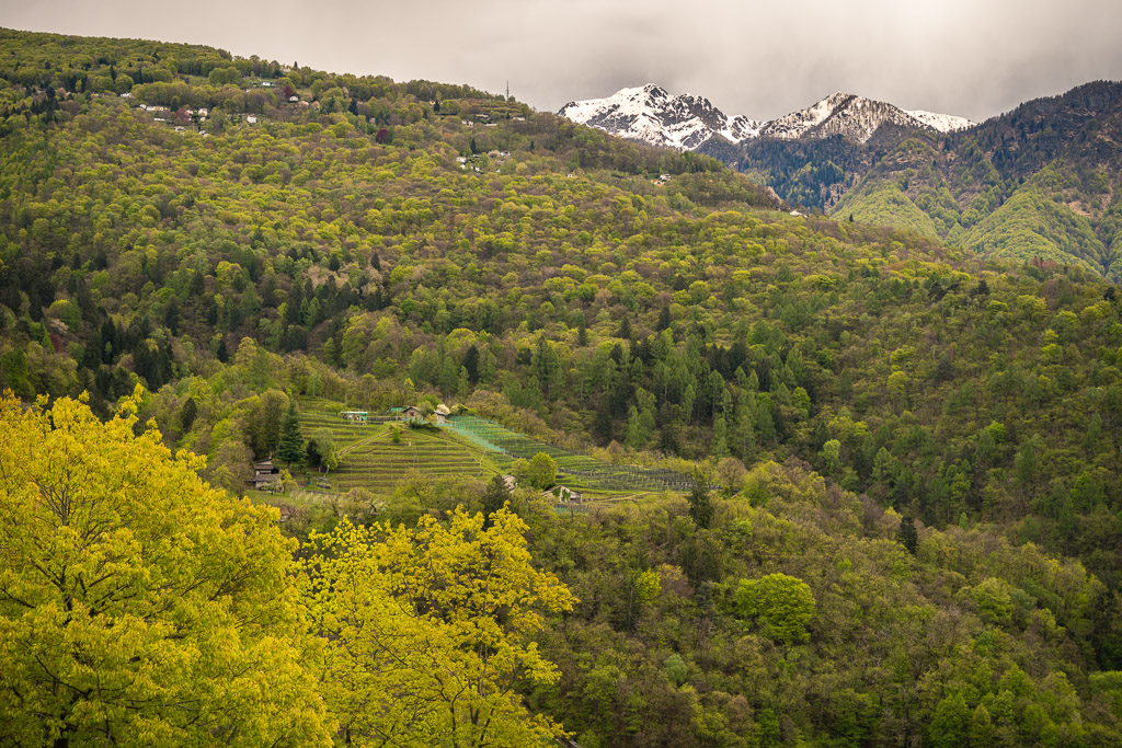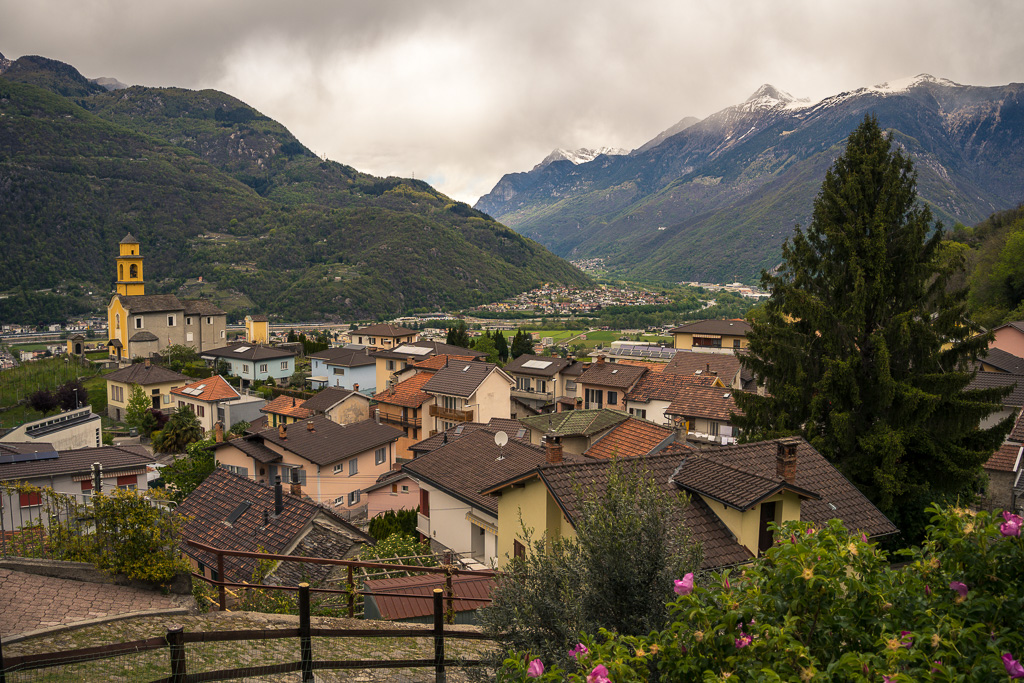 Vom Bahnhof stiegen wir durch (mit der Höhe zunehmend idyllischer und luxuriöser werdende) Wohnsiedlungen hoch, wobei wir den weiss-roten Markierungen und Wanderwegweisern auf steilen Steintreppen und durch kleine Seitengassen folgten. Zunehmend eindrücklich auch die Aussicht auf den dichtbesiedelten Norden Bellinzonas und die Berge dahinter. An einer schönen Kirche vorbei erreichten wir bei Artore den höchsten Punkt unseres Spaziergangs.