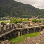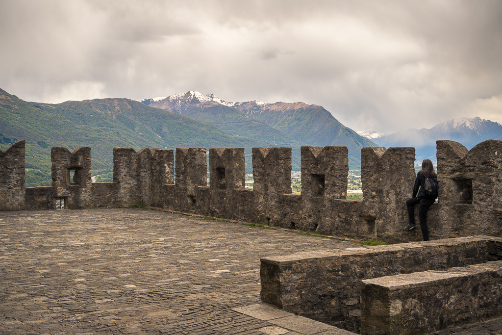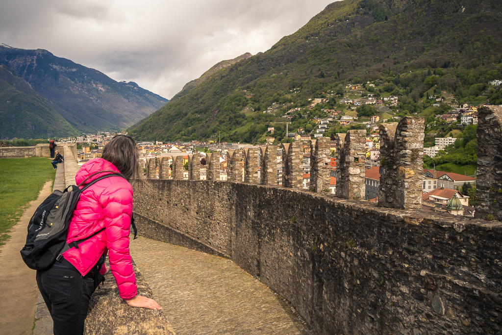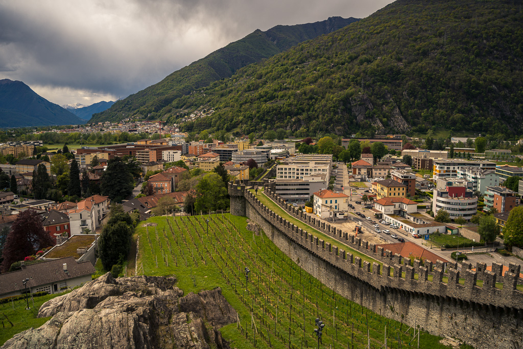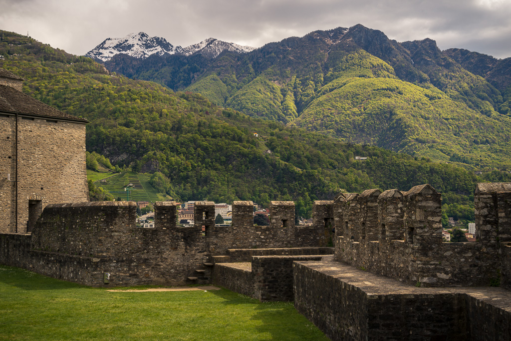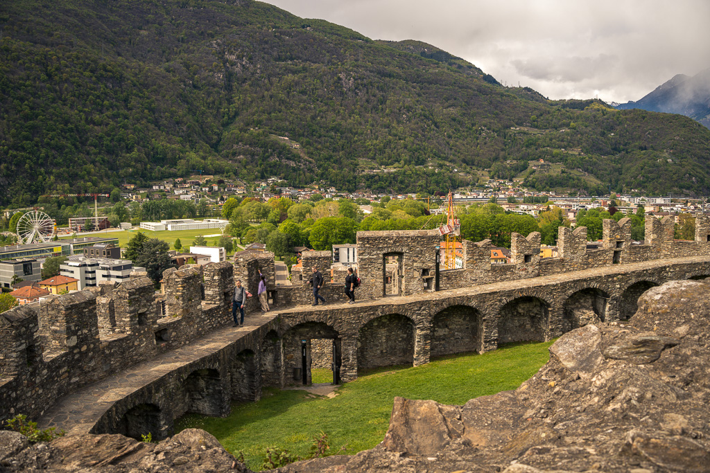 Neben der Altstadt lag unsere dritte und letzte Burg, das Castel Grande. Im Gegensatz zu den anderen Anlagen zuvor handelte es sich hier um eine veritable Festung auf einem alleinstehenden Hügel, zu der ein Aufzug von der Altstadt aus hinaufführte. Hier gab es Terrassen mit Festungsmauern auf mehreren Stufen zu sehen, mitsamt der abwechslungsreichen Ausblicke über die Stadt in verschiedene Richtungen.