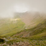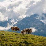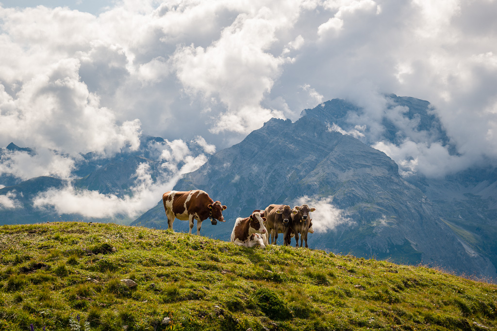 Über Kuhweiden auf dem breiten Grasrücken in Richtung des schon von der Bergstation aus sichtbaren Gipfels vom Piz Darlux. Liegengebliebene Wegweiser am Wegrand deuten darauf hin, dass eine Schneeschuhtour im Winter auf gleichem Weg hinaufführt. Auf dem Gipfel steht ein Steinmann mit Gipfelbuch.