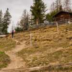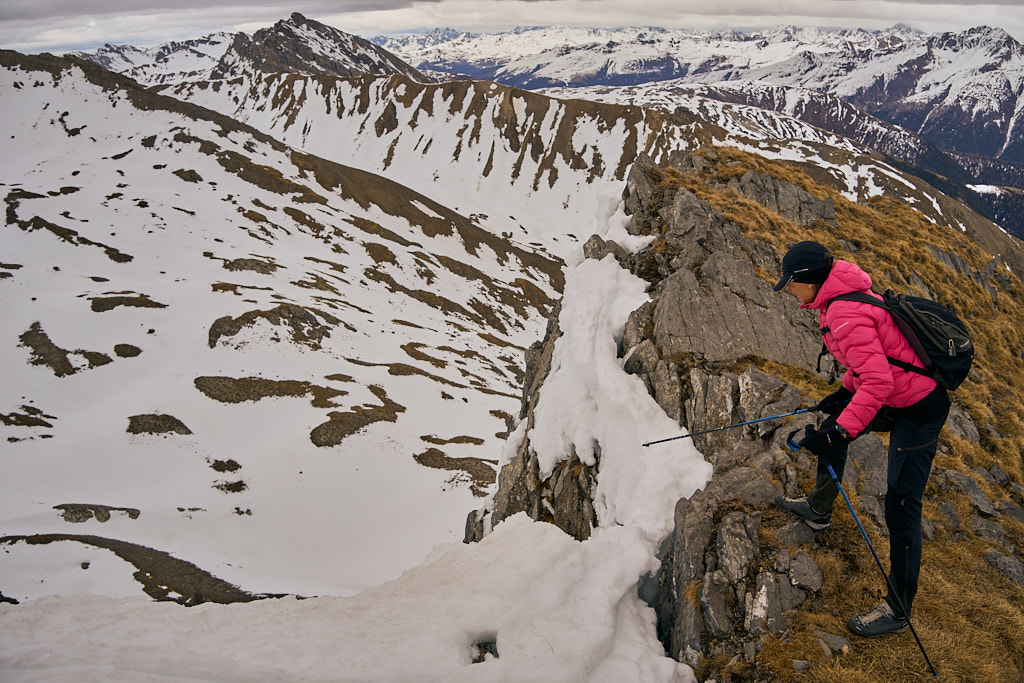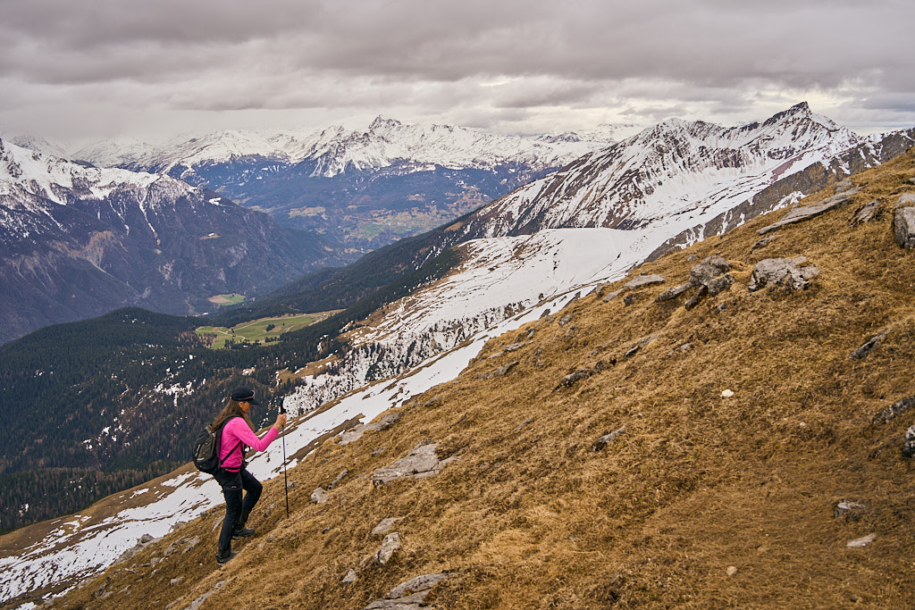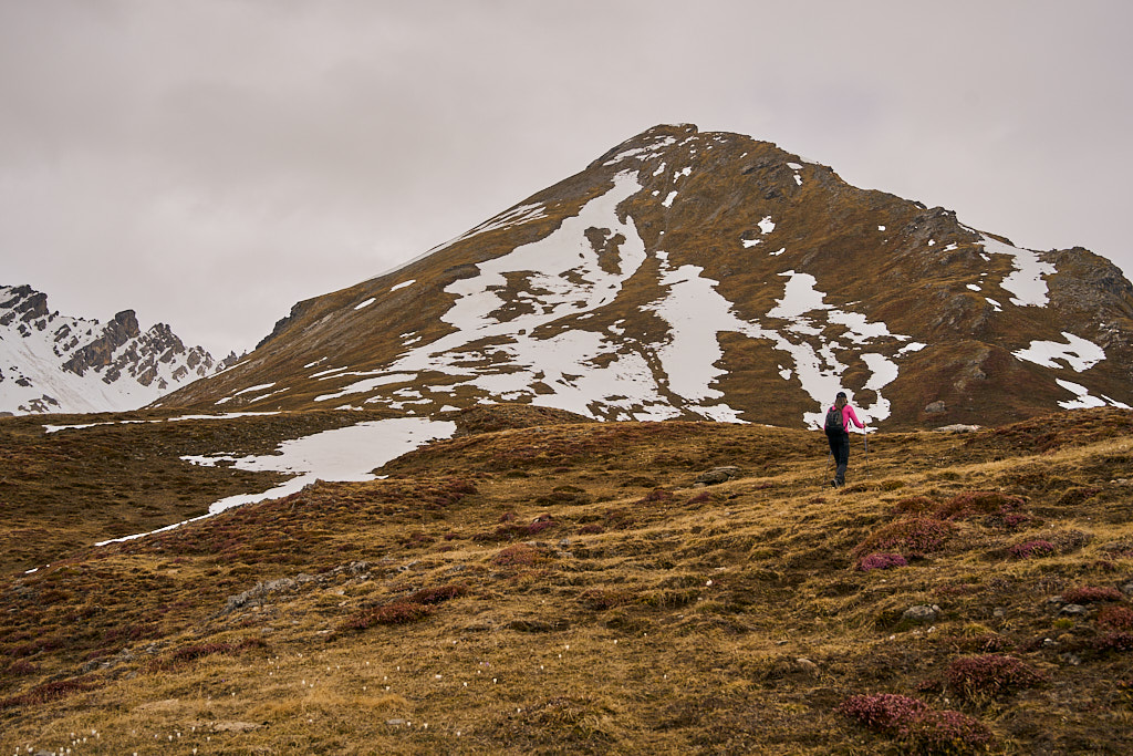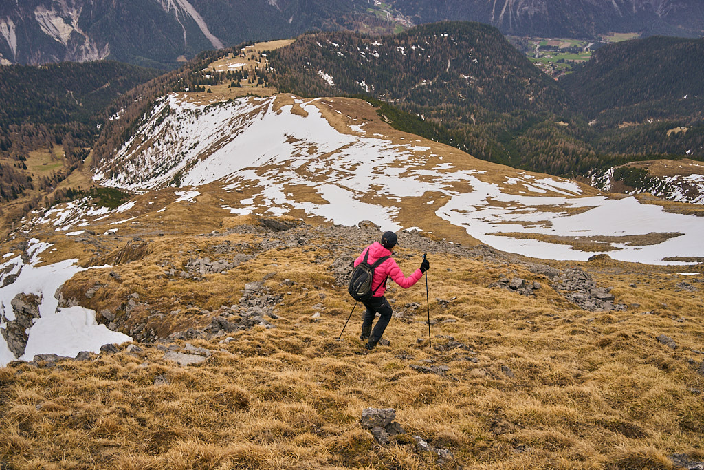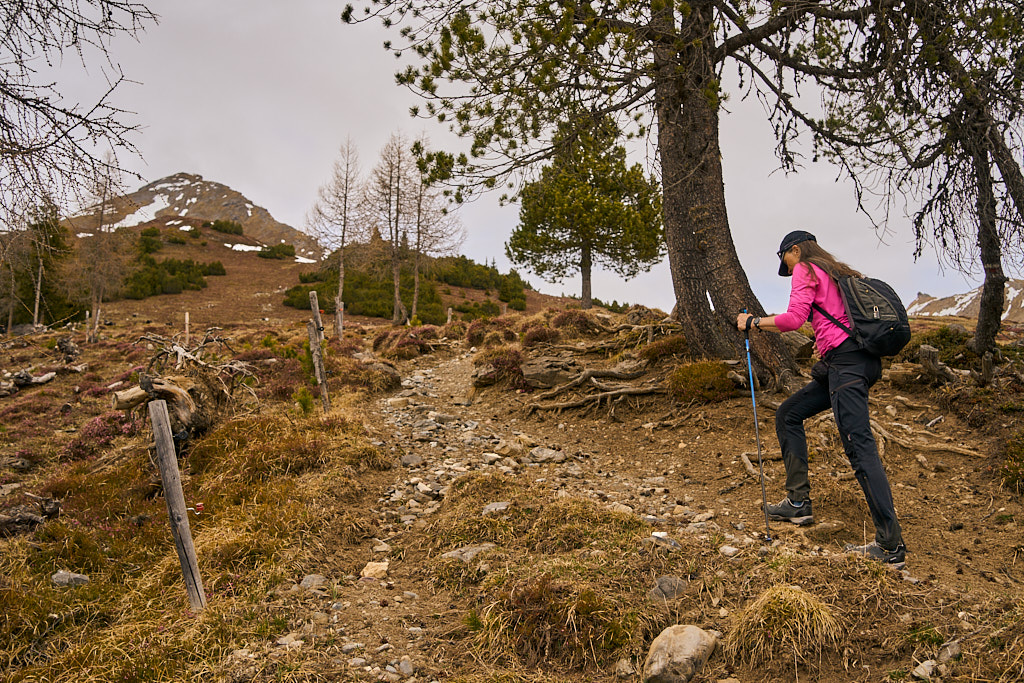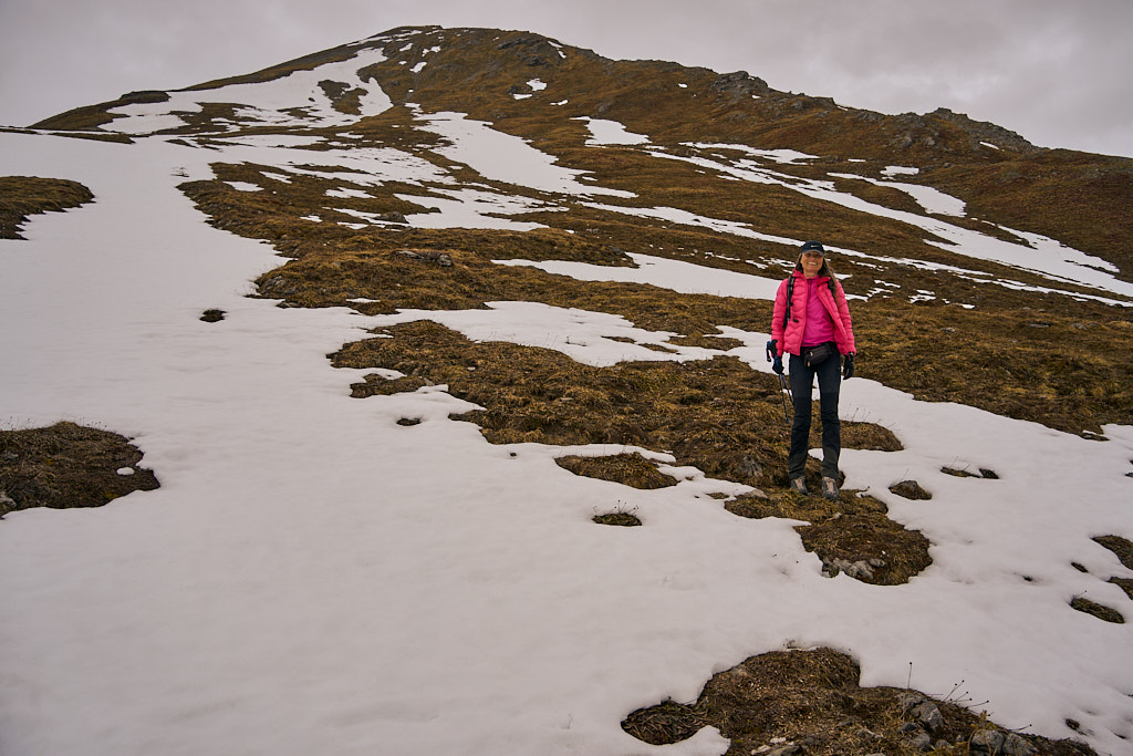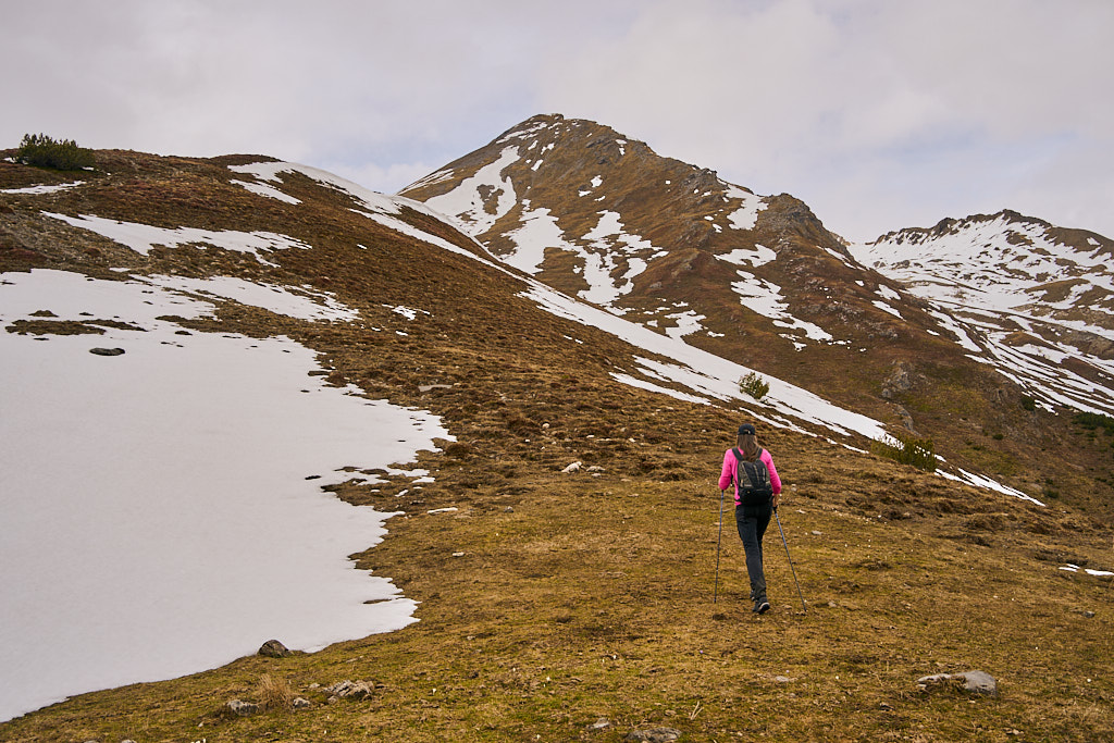 Der schneearme Winter hinterliess auf dem Tiaun diesmal schneefreie Bereiche, auf denen wir durchgehend zum Gipfelkreuz aufsteigen konnten. Meine Partnerin marschierte bereits zeitig von zuhause los, während ich noch unentschlossen herumtrödelte und ihr deshalb später mit dem Mountainbike nacheilen musste. Kurz vor der Alp Afiein konnte ich sie aber wieder einholen und von dort an ging es gemeinsam in Richtung Tiaun weiter.