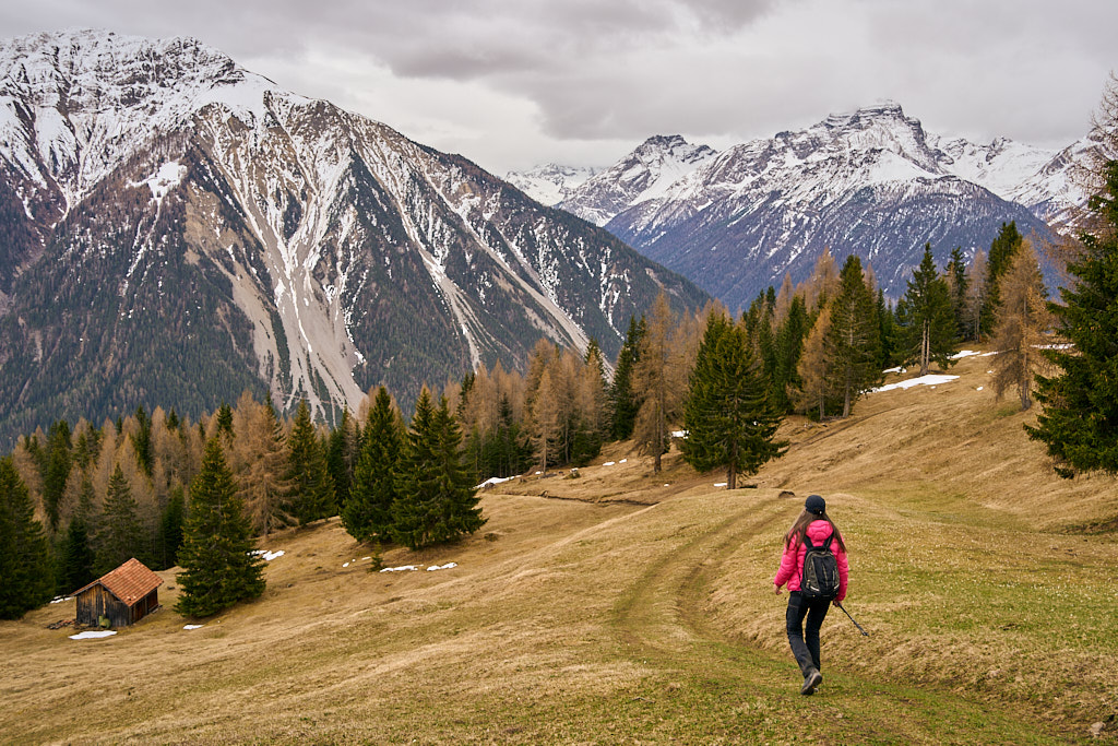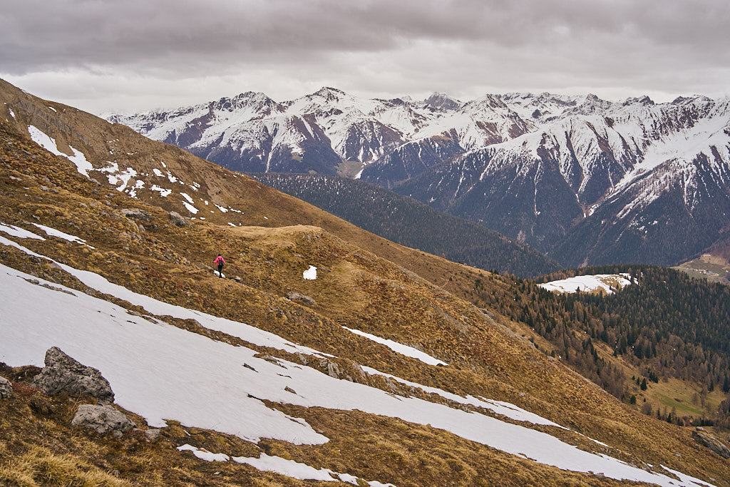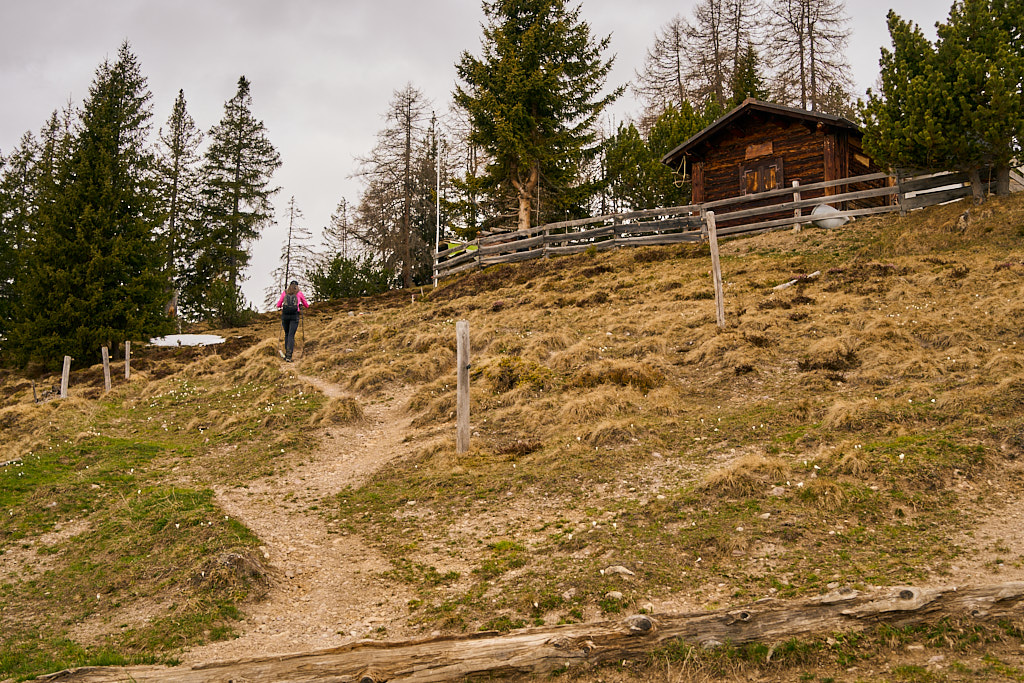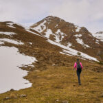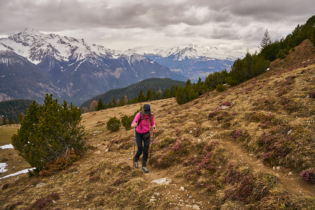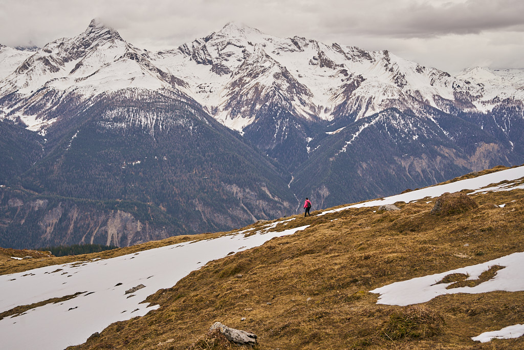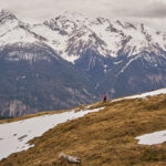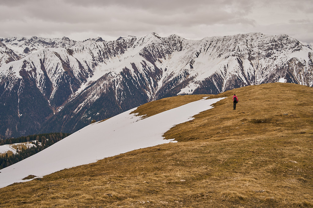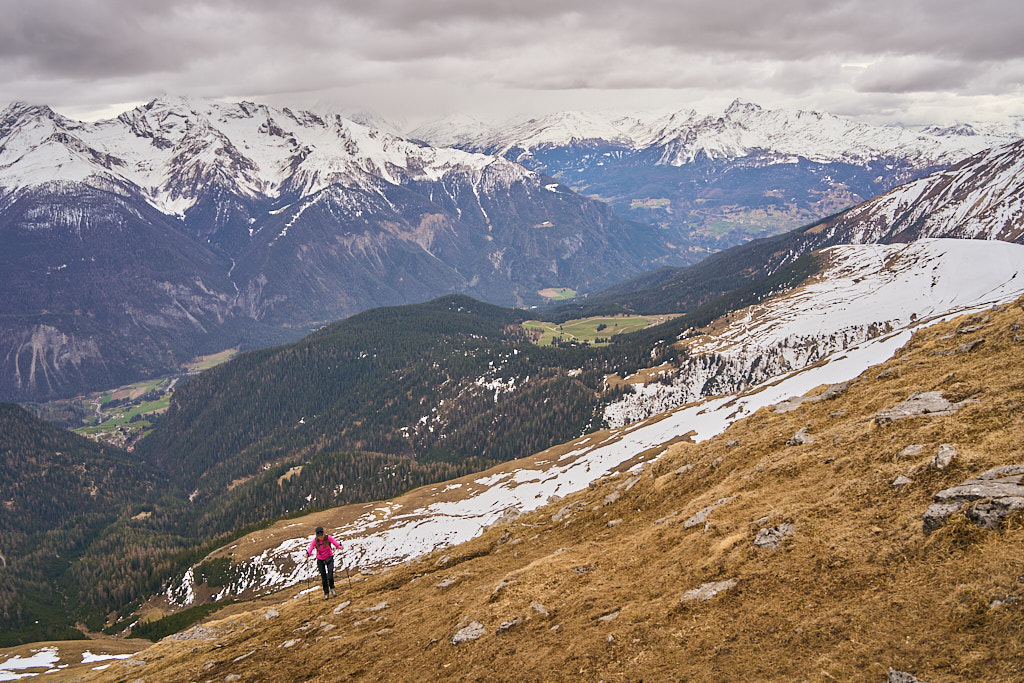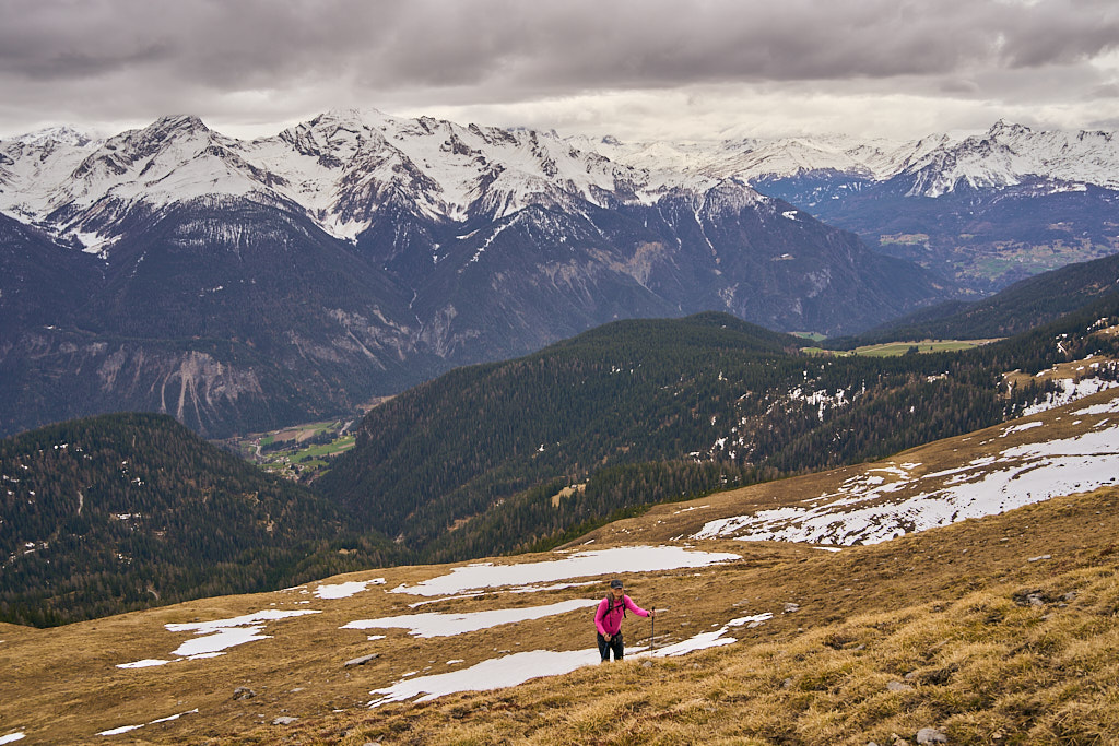 Der schneearme Winter hinterliess auf dem Tiaun diesmal schneefreie Bereiche, auf denen wir durchgehend zum Gipfelkreuz aufsteigen konnten. Meine Partnerin marschierte bereits zeitig von zuhause los, während ich noch unentschlossen herumtrödelte und ihr deshalb später mit dem Mountainbike nacheilen musste. Kurz vor der Alp Afiein konnte ich sie aber wieder einholen und von dort an ging es gemeinsam in Richtung Tiaun weiter.