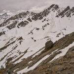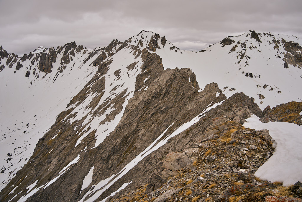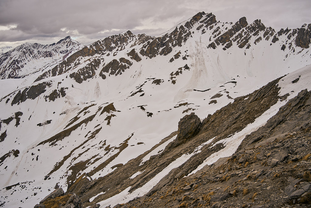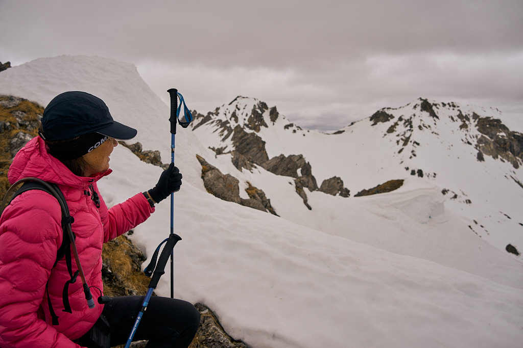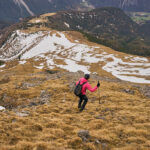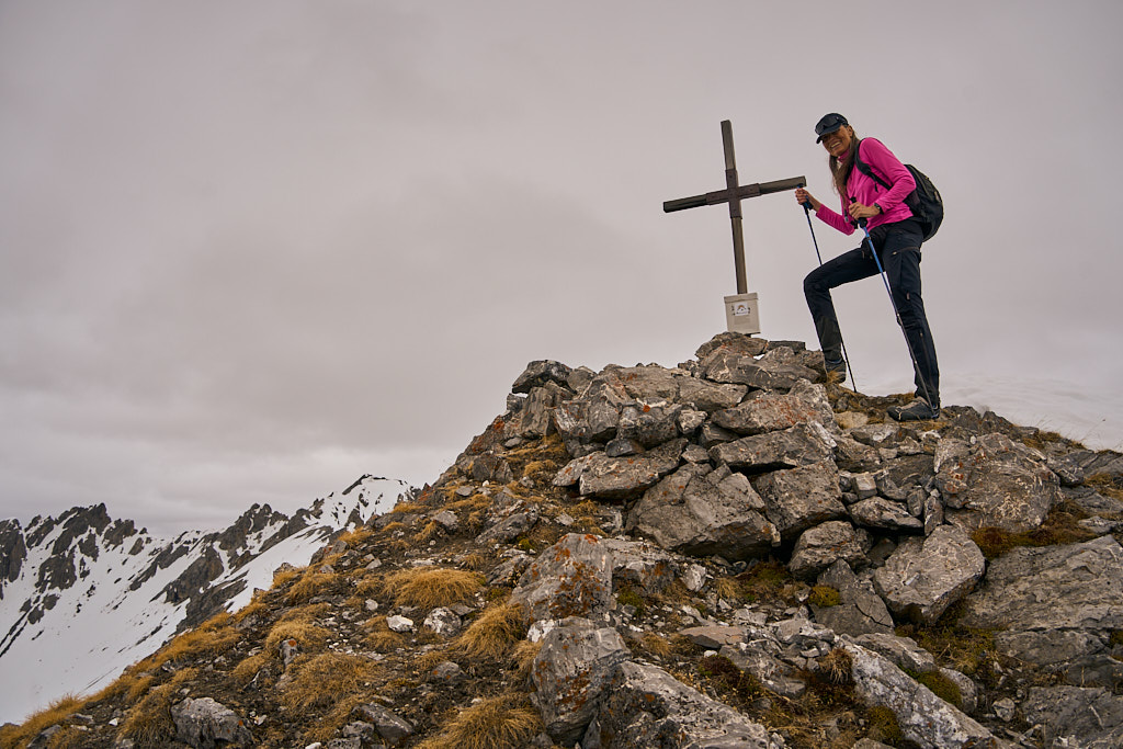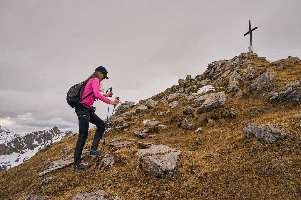 Der Weg zum Gipfel, mir sonst immer als eher beschwerlich in Erinnerung, kam mir heute für einmal kinderleicht vor. Neben der gelenkschonenden Anfahrt per Bike trugen dazu wohl sicher auch die Carbonstöcke (die ich sonst nur sehr selten hervorkrame), der im Gegensatz zum trockenen Sommer kompakte und trittfeste Untergrund auf den steilen Gras- und Schutthängen sowie das kühle und windige Wetter bei, das ein Überkochen verhinderte.