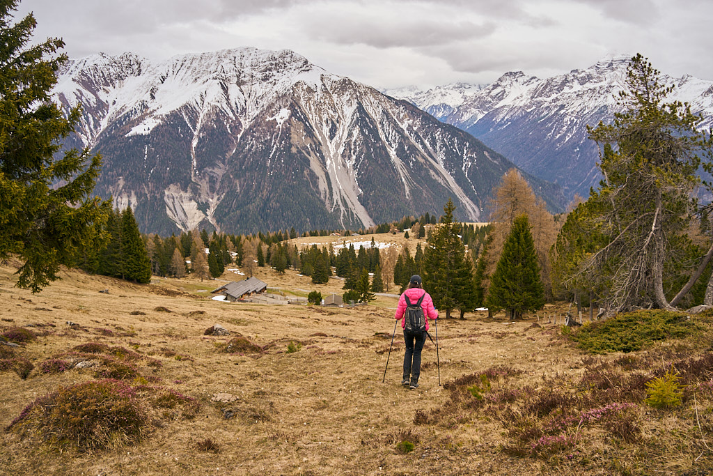 Auf dem Abstieg wurde das bisher nur bewölkte Wetter schlagartig wechselhaft. Um uns herum waren Regenschauer zu sehen, die uns selber auch erwischten – zum Glück allerdings nur kurz und in Tropfen. Wieder bei der Alp Afiein angekommen, legten wir das erste Stück bis Pardela noch gemeinsam zurück. Danach preschte ich mit dem Bike schon mal nach Hause vor, um den Zeitvorsprung in Ruhe unter der heissen Dusche geniessen zu können.