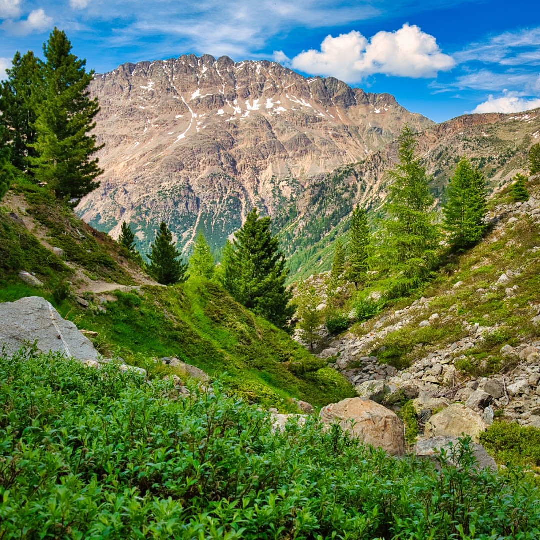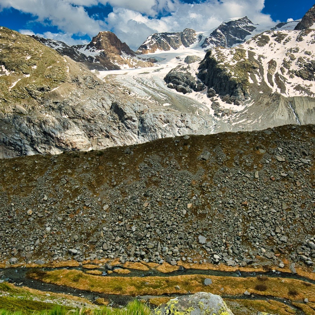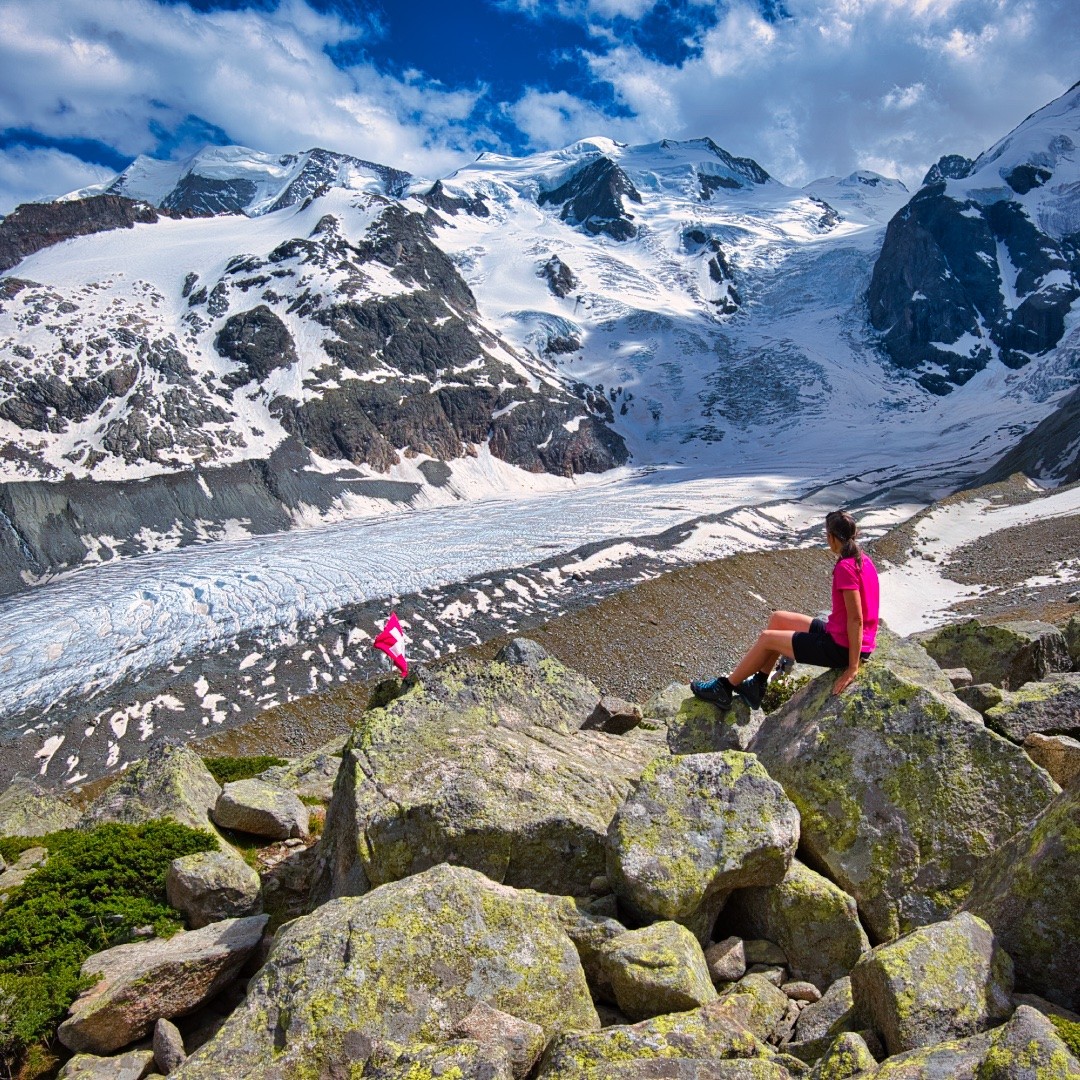 Vom RhB-Bahnhof Morteratsch folgen wir dem markierten Wanderweg zur Chamanna da Boval. Anfangs noch durch Wald ansteigend, führt der einfache (T2) Weg dem Hang entlang hoch über den Morteratschgletscher zur Hütte. Über Holztreppen und -stege, an Bächen und kleinen Wasserfällen vorbei geniessen wir eine abwechslungsreiche Aussicht auf die Gipfel der Diavolezza, des Piz Palü, Piz Bernina sowie auf den stark geschwundenen Gletscher und seine geröllbedeckten Randhänge und -moränen.