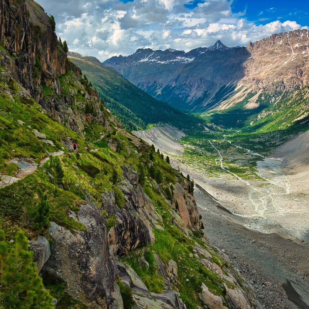 Alternativ besteht auch die Möglichkeit, von der Station Morteratsch auf einem breiten und flachen (T1) Schotterweg auf der Schuttebene bis zur Gletscherzunge zu laufen oder zu biken.