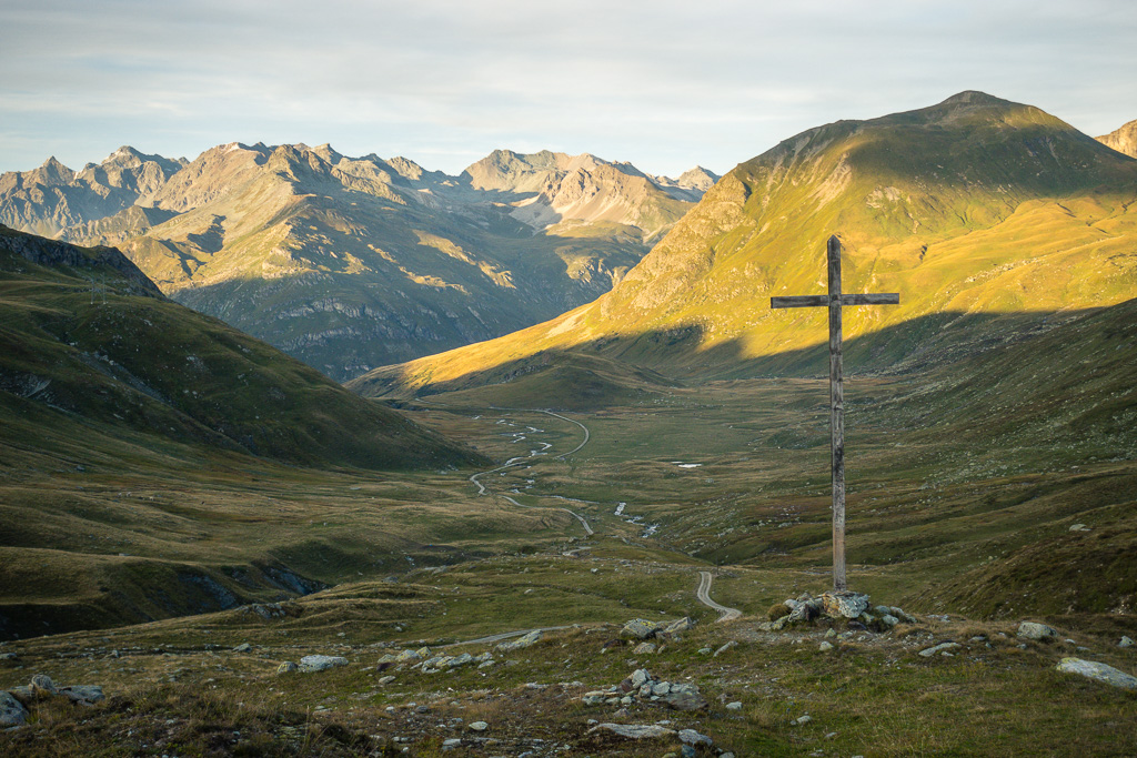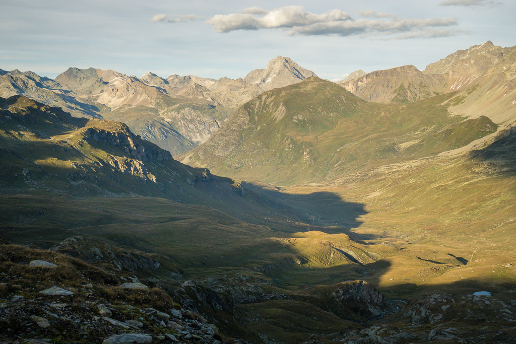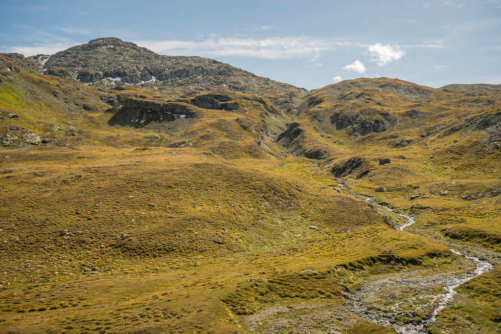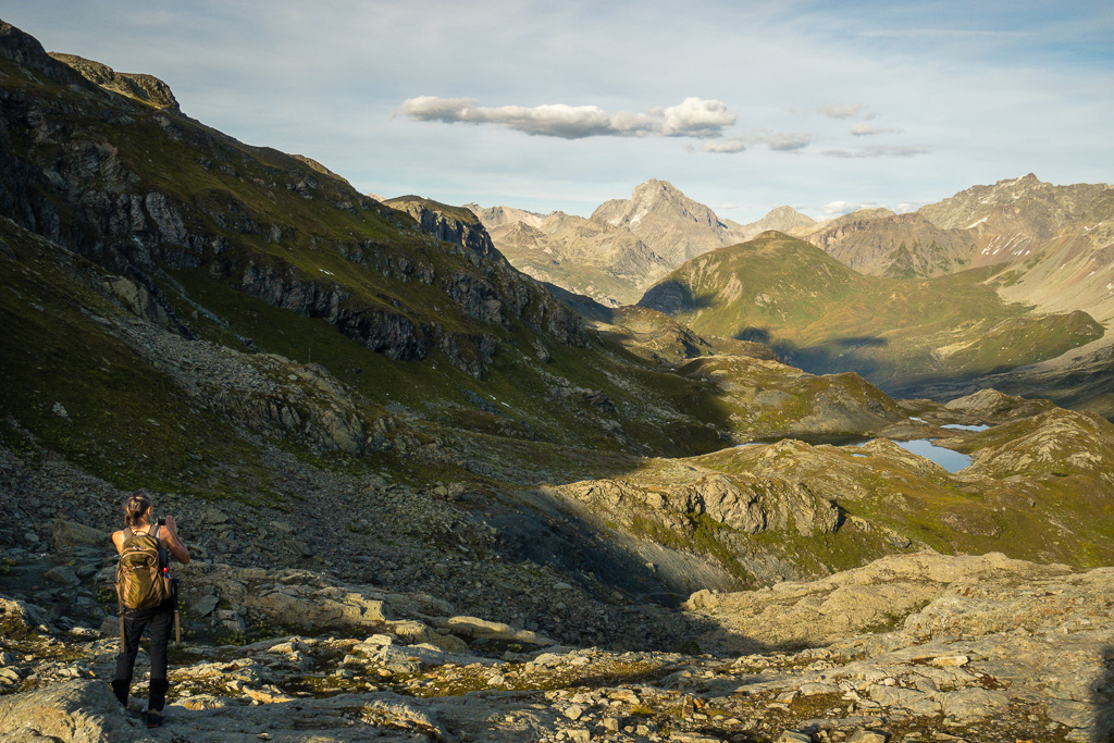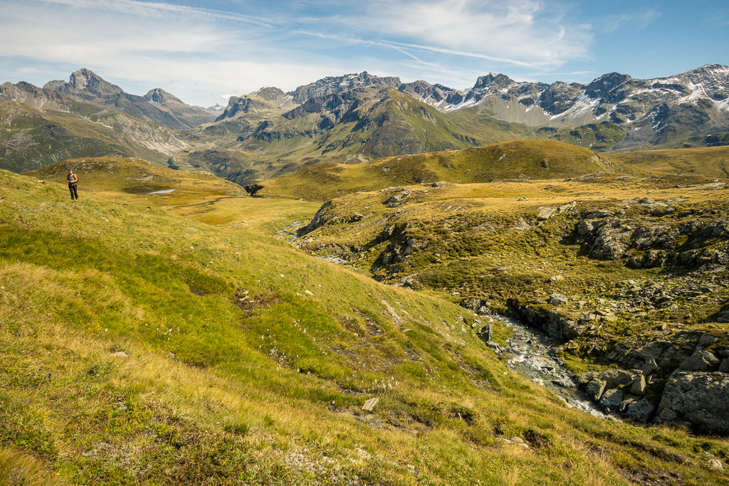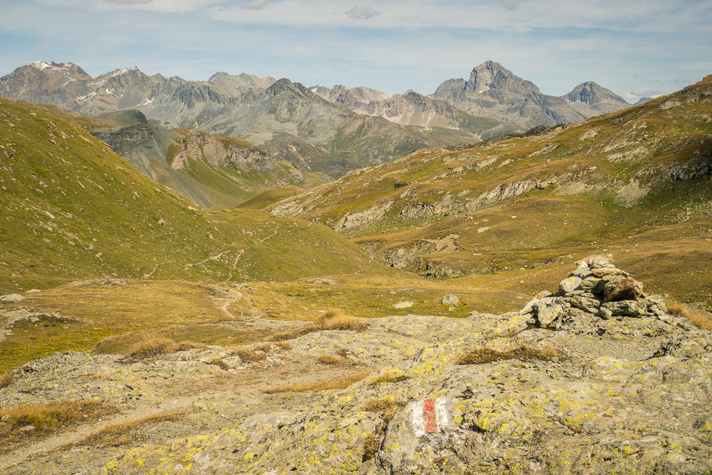 Vom Stallerberg aus weiter nach Süden, zahlreichen Steinmännern folgend, zum Gipfel Uf da Flüe. Schöne Aussicht auf das Tal von Avers. Weiterhin nach Süden steil absteigen zum Passübergang Fuorcla da la Valletta. Hier kann die Tour auch abgekürzt und direkt nach Bivio zurückgekehrt werden.