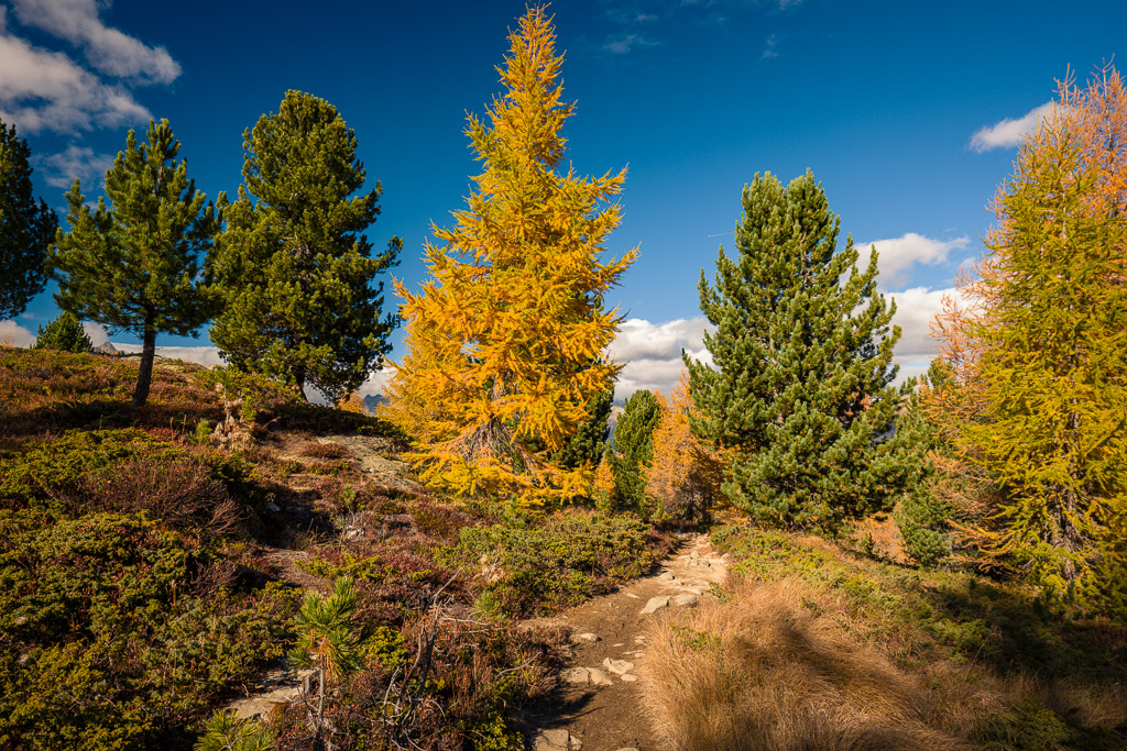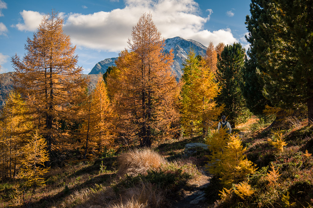 Wieder zurück zu P.2217. Hier sind wir aber nicht auf dem gleichen Weg nach St. Moritz zurückgewandert, sondern stattdessen nach rechts und steil durch den Wald zum Bahnhof nach Pontresina abgestiegen.