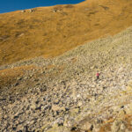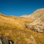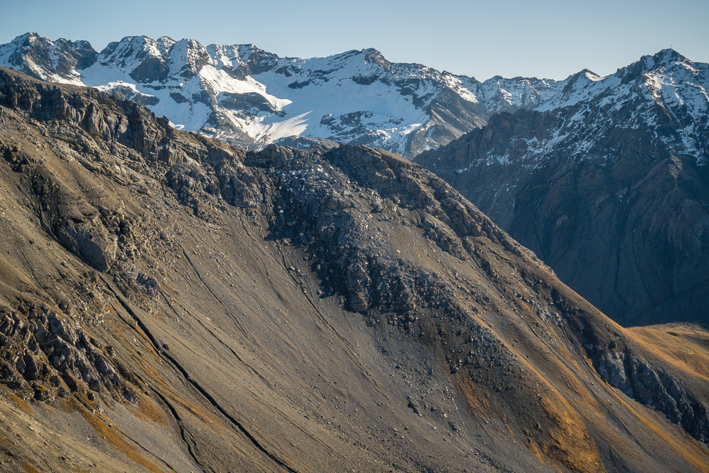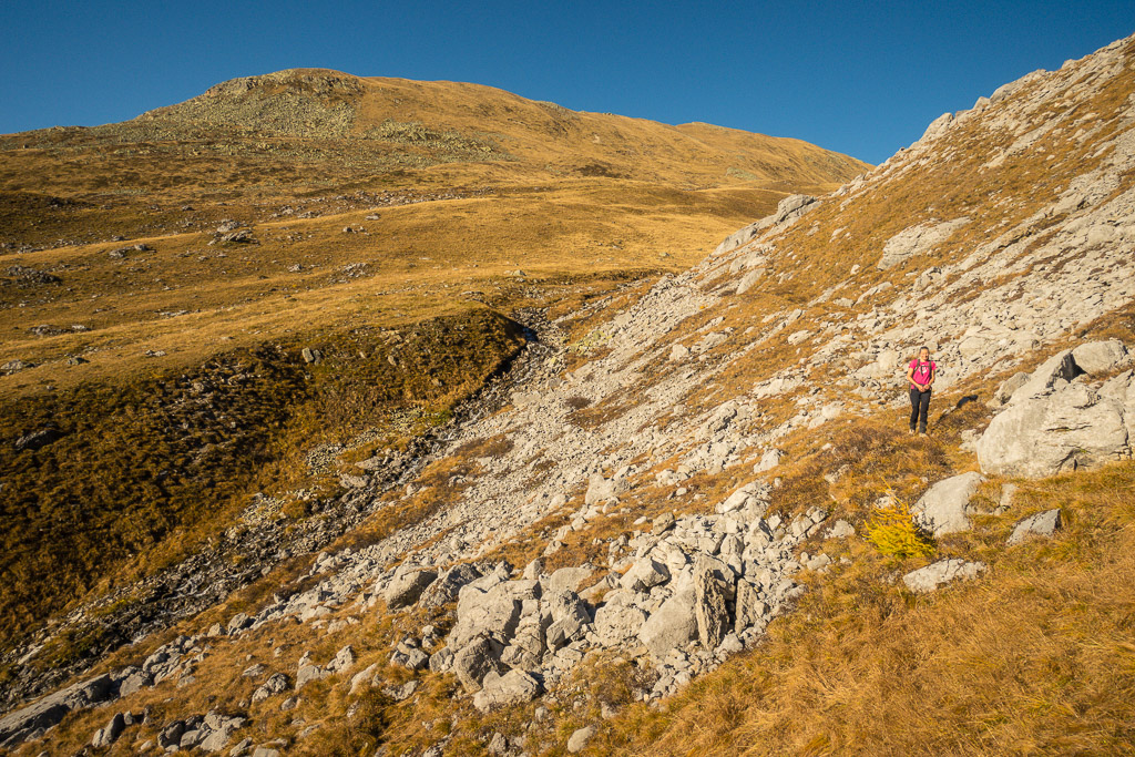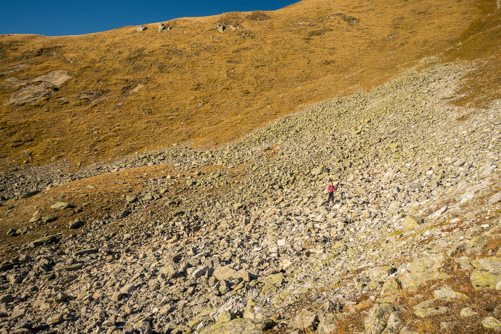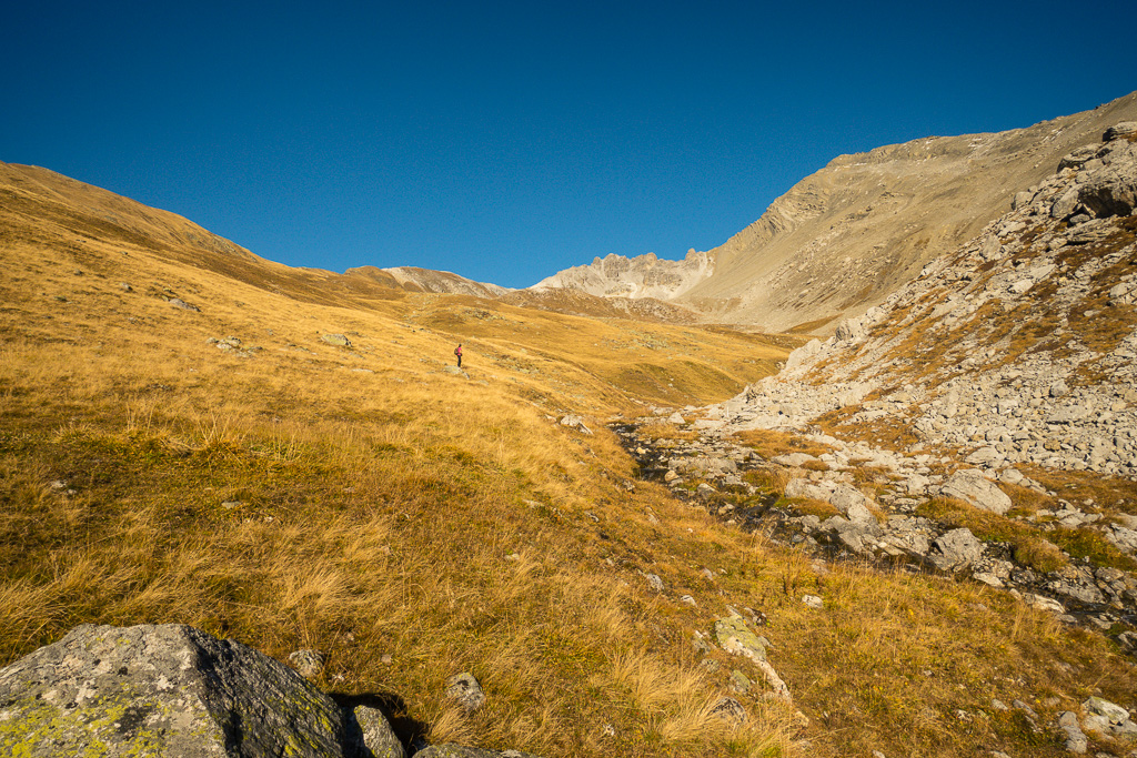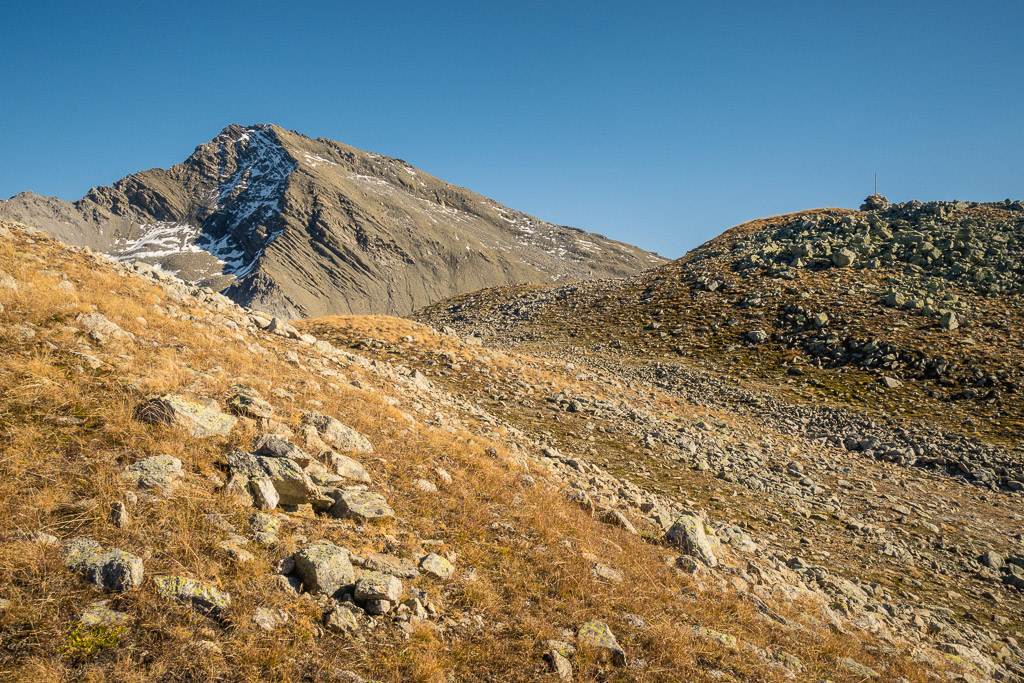 Weiter in die Senke zwischen Erezberg und Älplihorn absteigen. Am tiefsten Punkt, den einfachsten Möglichkeiten folgend, über die steile Grasflanke ins weite Geröllfeld des Mitteltäli absteigen. Über Geröll weglos weiter hinunter, bis man auf den Wanderweg von Oberalp zur Fanezfurgga stösst. Über diesen nach Oberalp und Davos Monstein zurück.