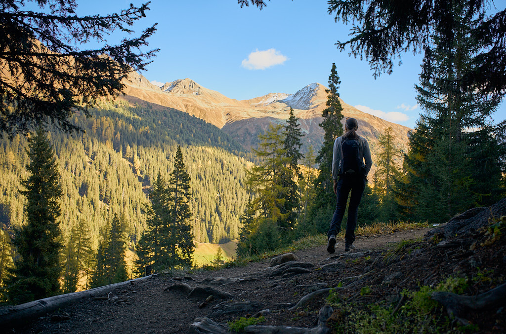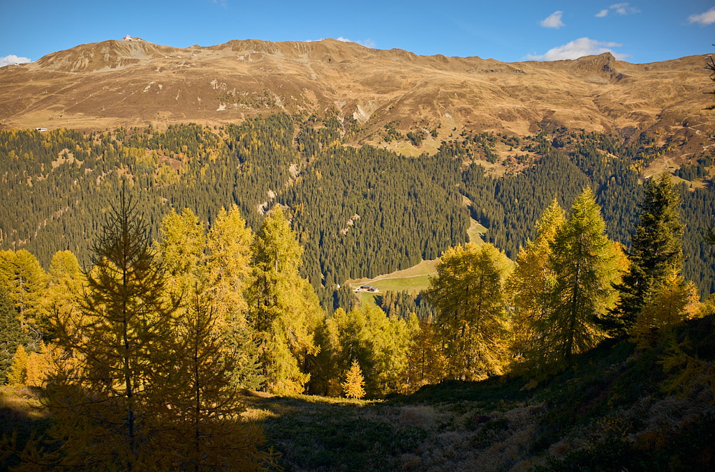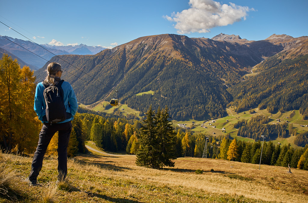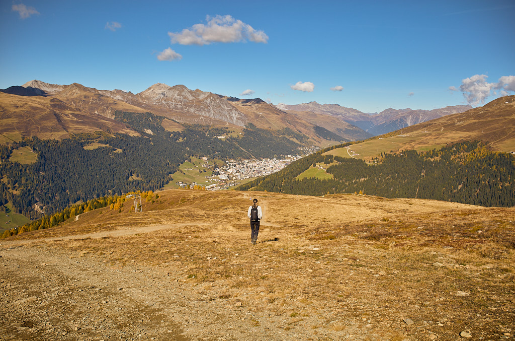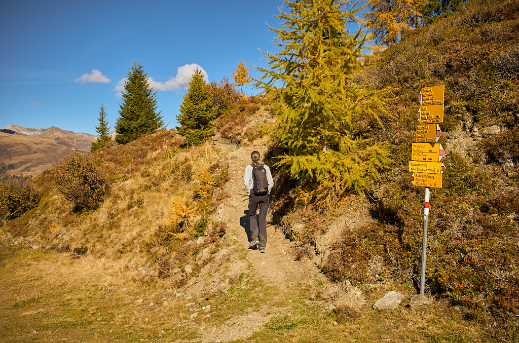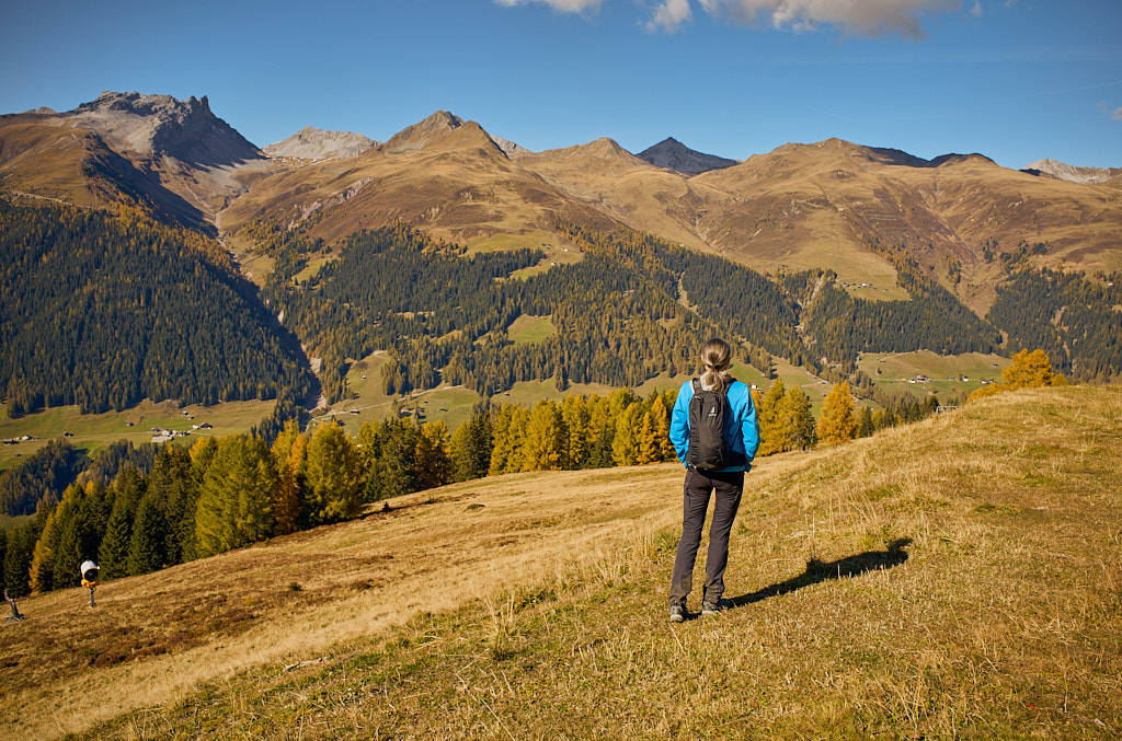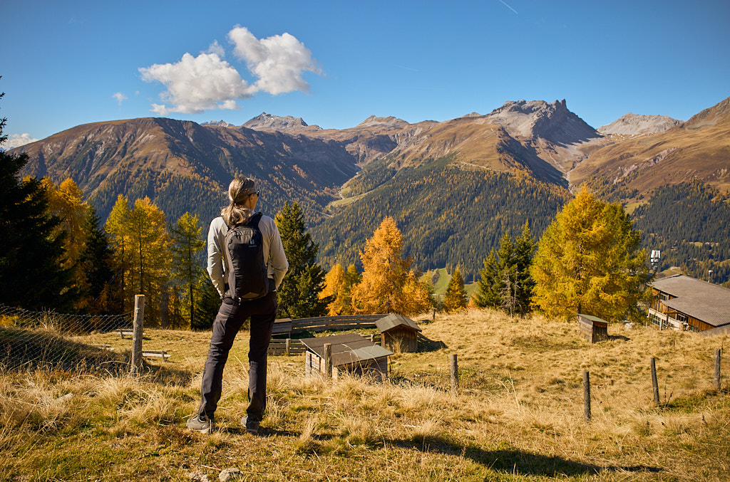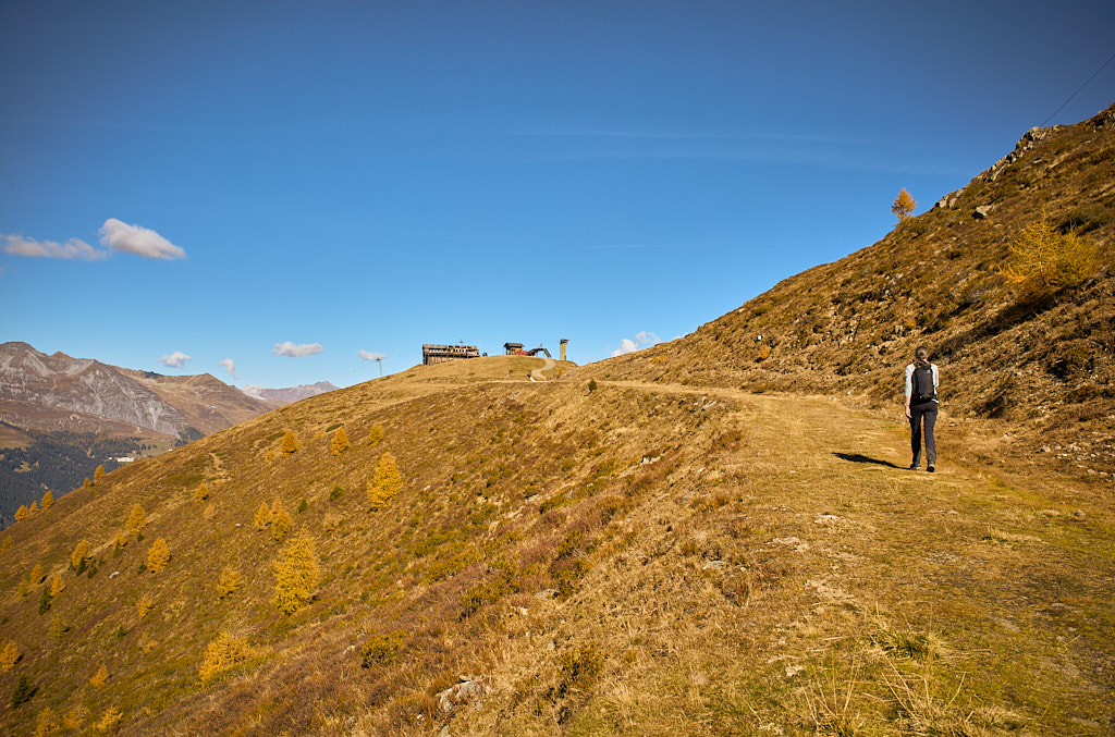 Mit der Rinerhornbahn von Davos Glaris zur Bergstation Jatzmeder. Von dort zunächst zur Hubelhütte, danach auf dem Wanderweg nach Sertig Dörfli.
