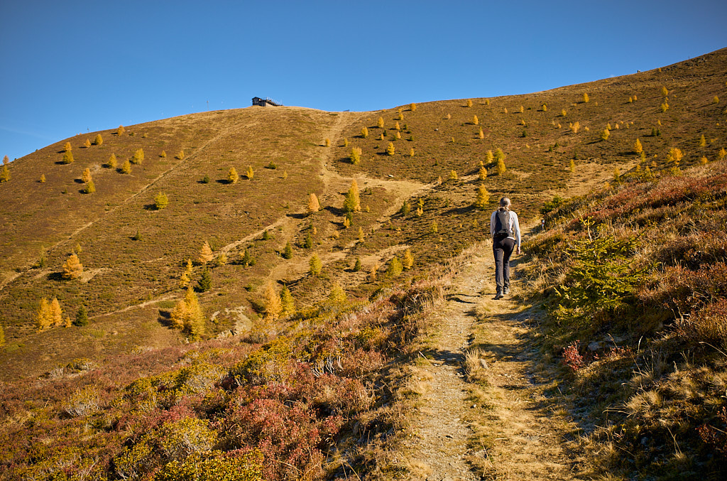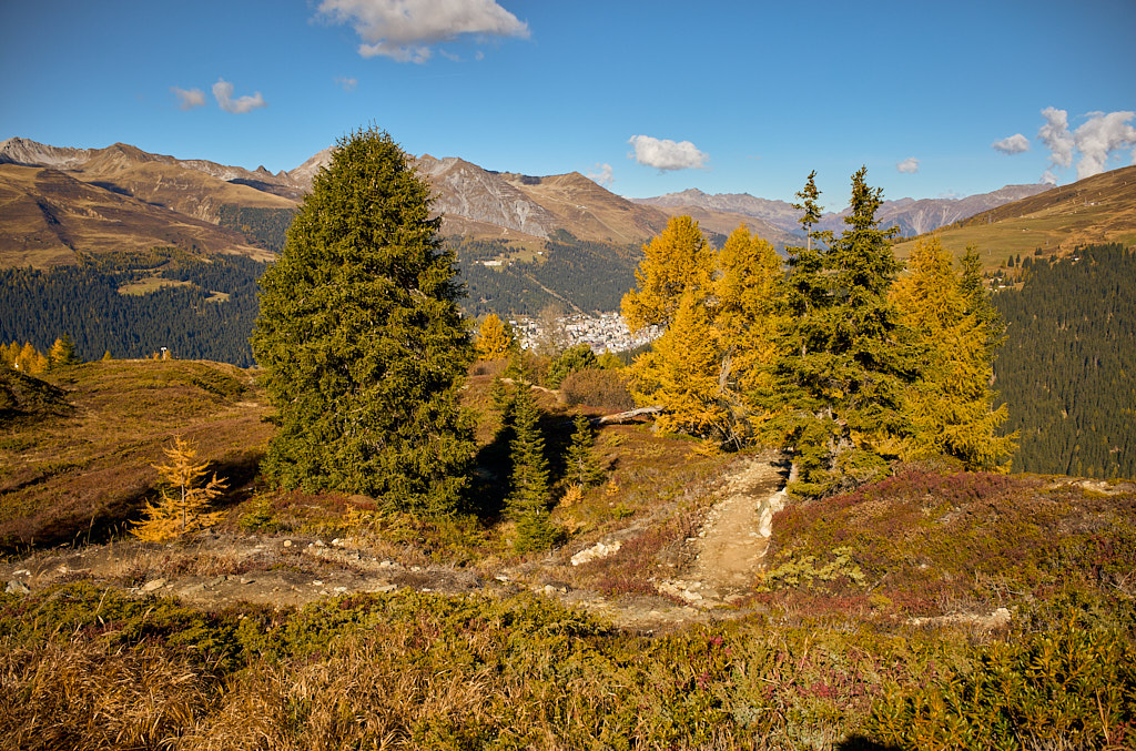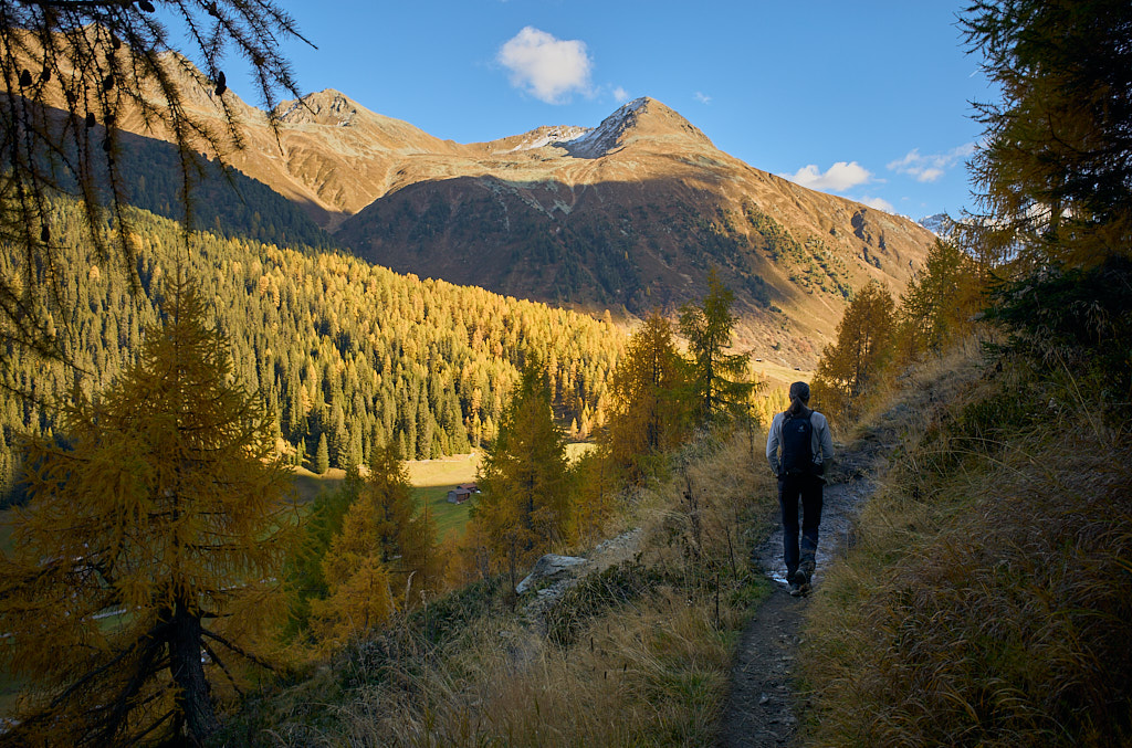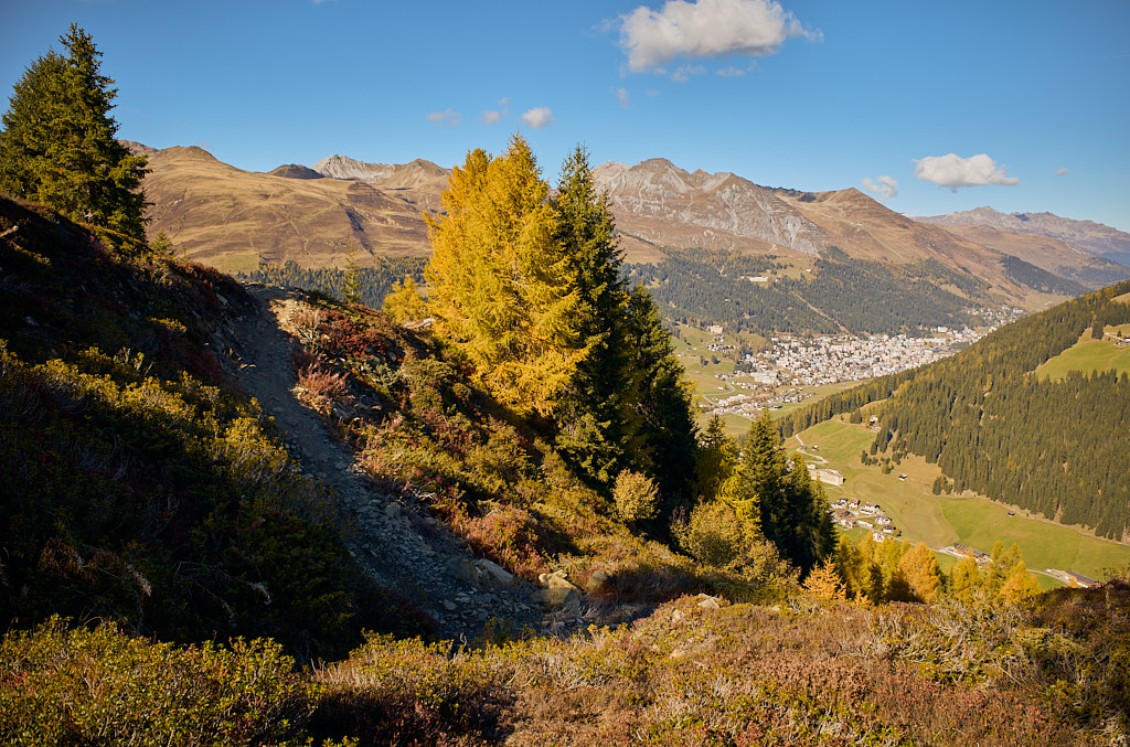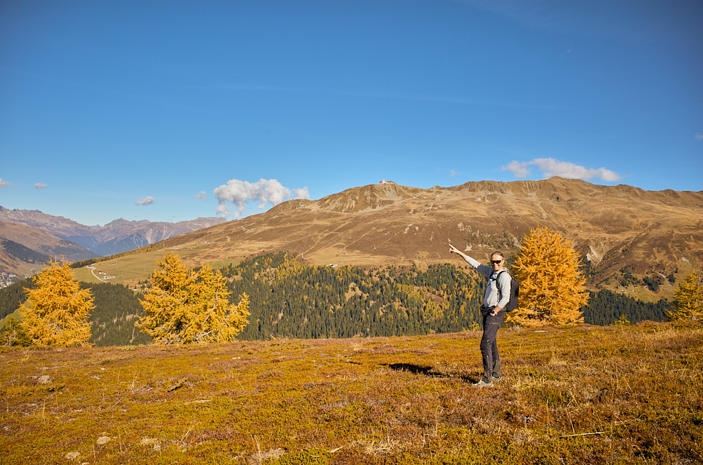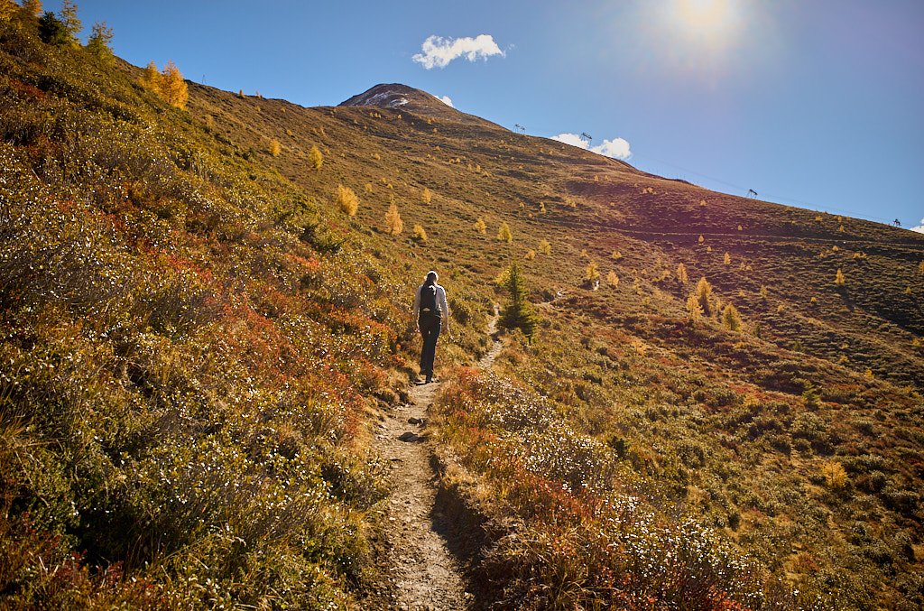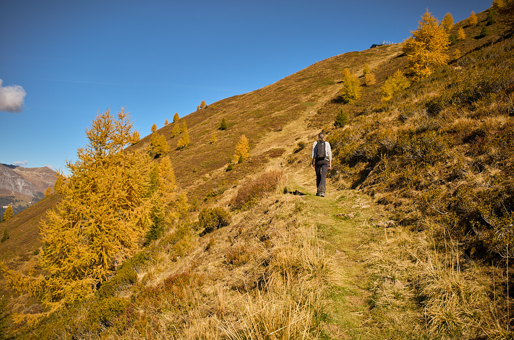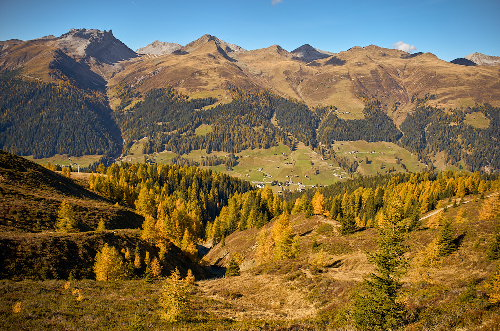Mit der Rinerhornbahn von Davos Glaris zur Bergstation Jatzmeder. Von dort zunächst zur Hubelhütte, danach auf dem Wanderweg nach Sertig Dörfli.