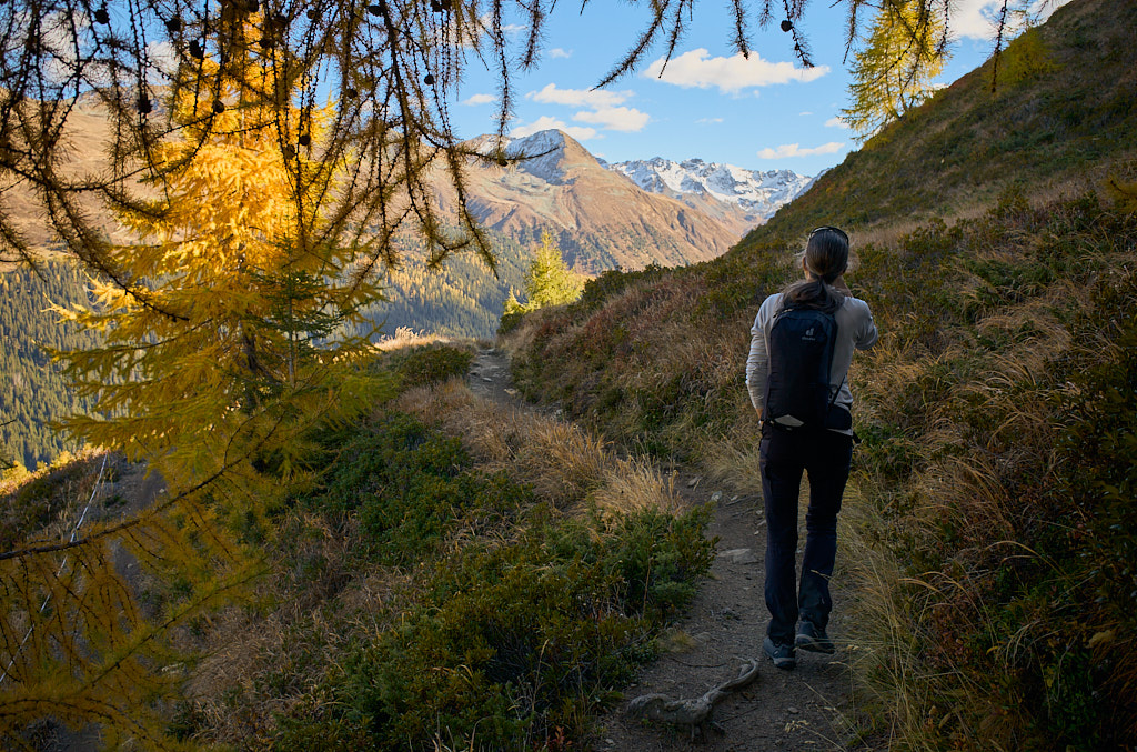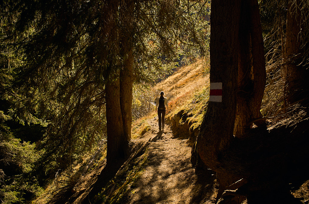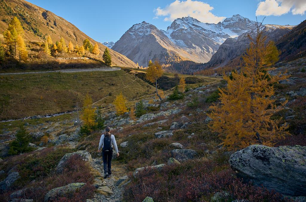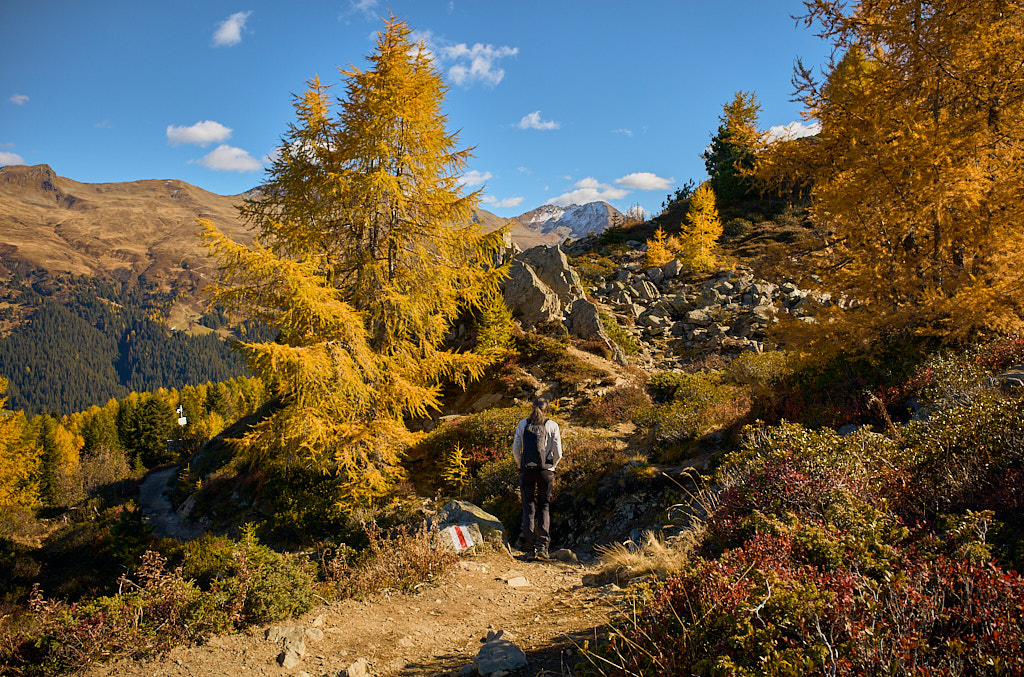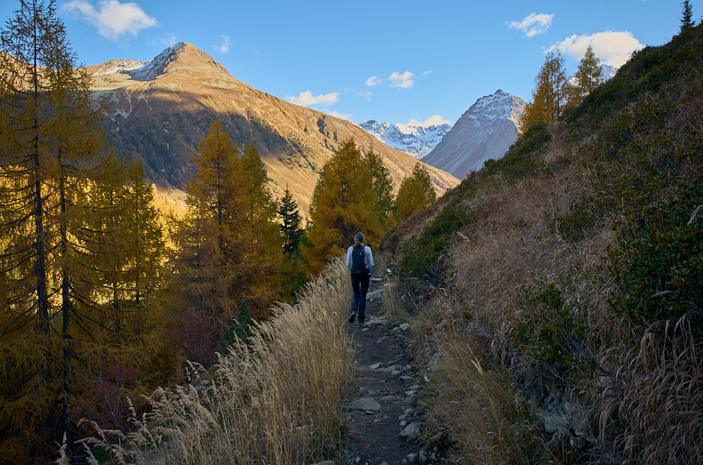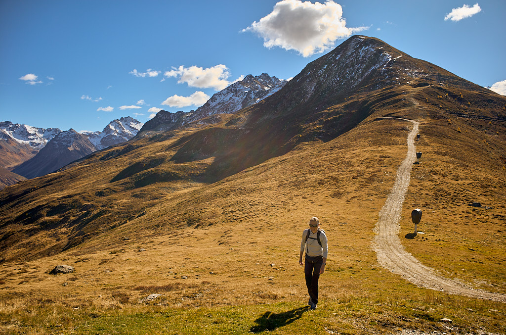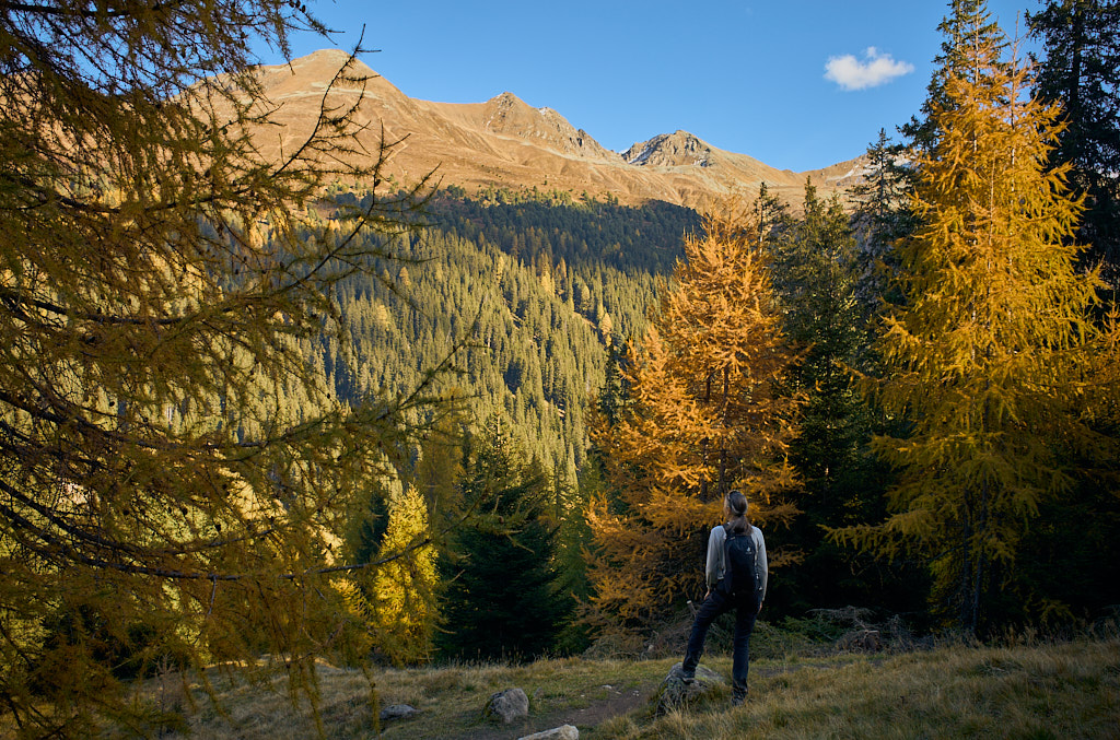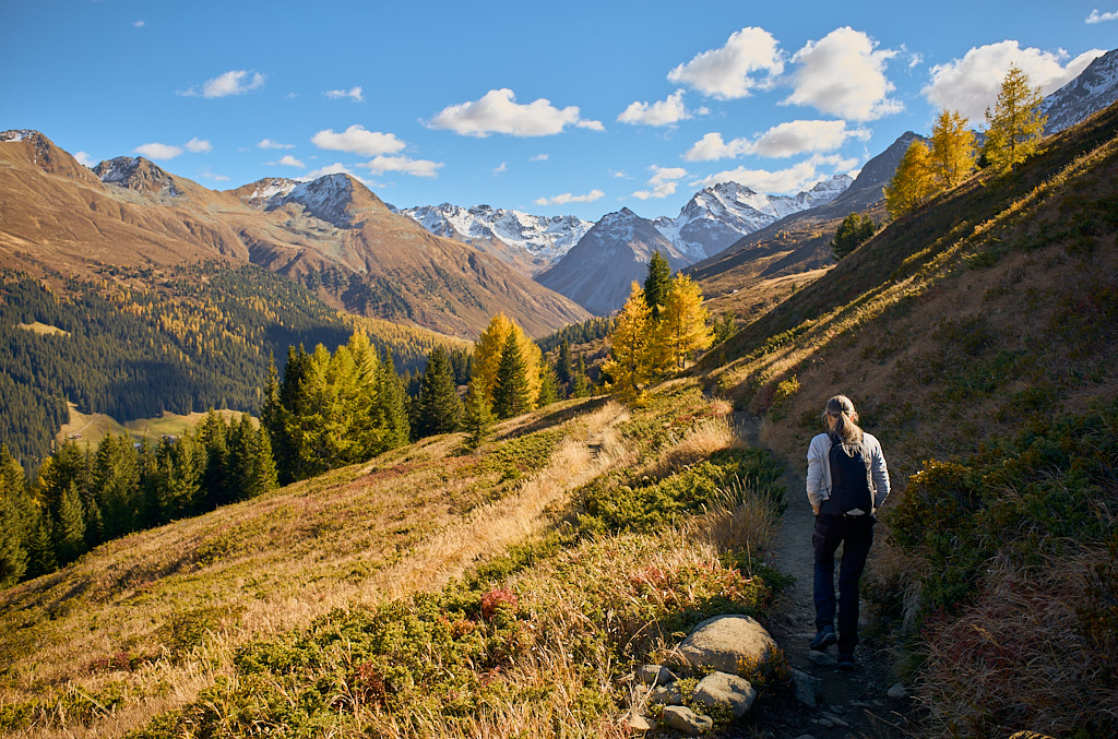 Mit der Rinerhornbahn von Davos Glaris zur Bergstation Jatzmeder. Von dort zunächst zur Hubelhütte, danach auf dem Wanderweg nach Sertig Dörfli.