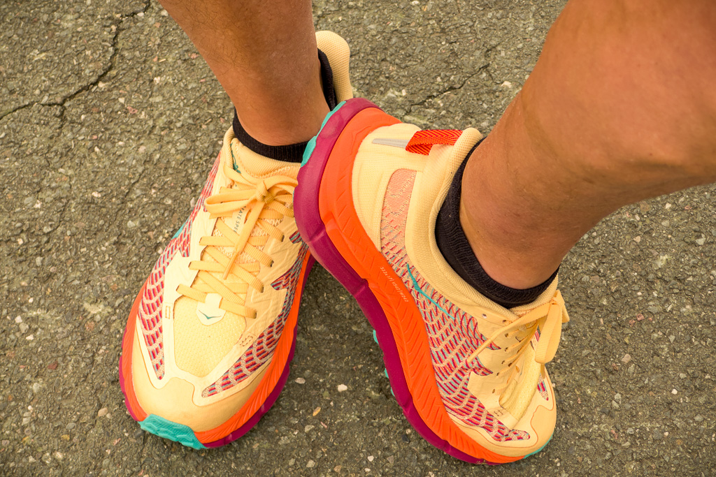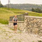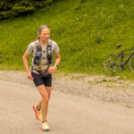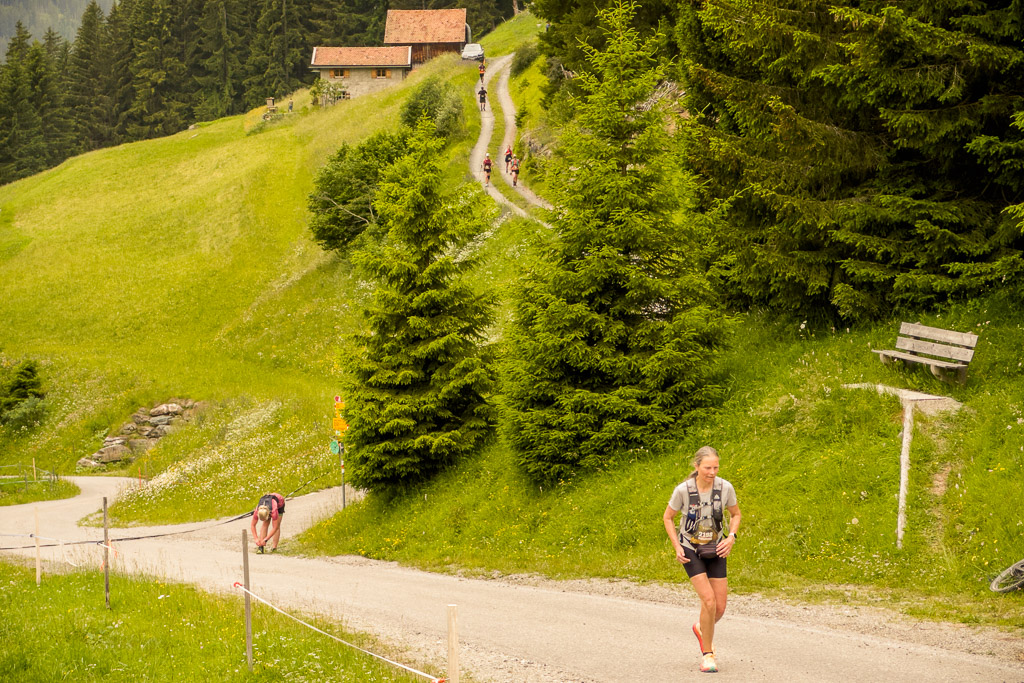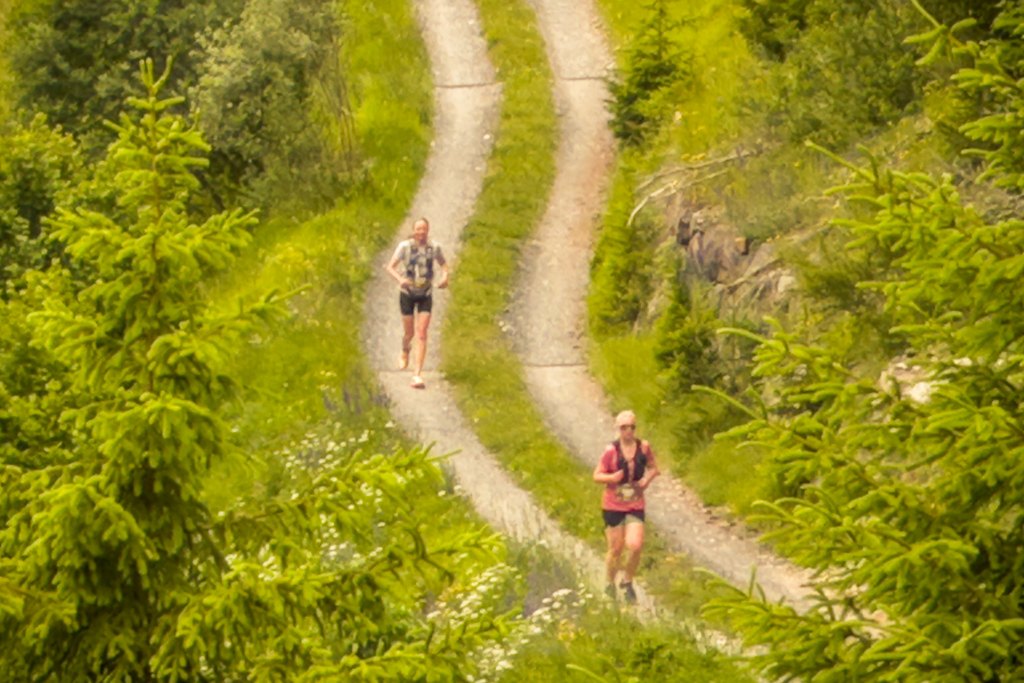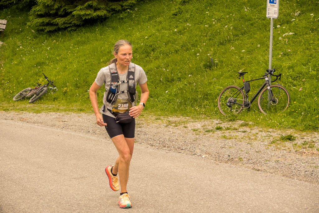 Ich gesellte mich zu einem E-Bike-Fahrer, der (abgesehen vom E-Bike) mit der gleichen Technologie und Vorgehensweise arbeitete wie ich. Er hatte bereits am Strassenrand etwas weiter oben einen optimalen Standort gefunden, von dem aus man die Läufer von weitem beim Verlassen des Waldes und beim Herannahen sehen konnte. Auch hier dauerte es nicht lange, bis Susannes Punkt auf dem Kartendisplay nahte und ich sie dann schon aus der Ferne sehen konnte. Sie war immer noch voll im Rennen, hüpfte munter und fluchend an mir vorbei und wieder hatte ich die nächsten Bilder von unterwegs auf sicher.