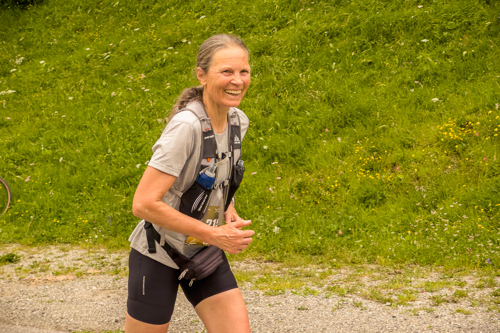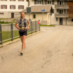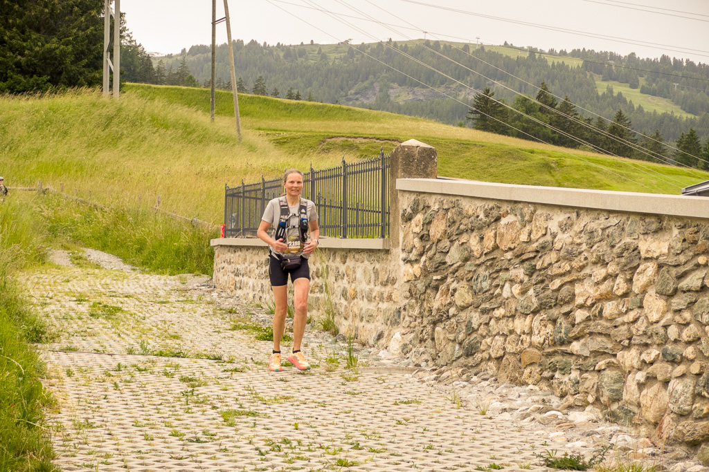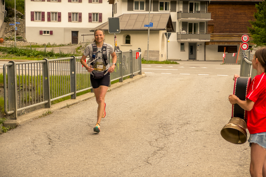 Angesichts der Schwierigkeiten auf der restlichen technischen Laufstrecke im Wald schien mir realistisch, den Läufern beim Ausgang der Alpstrasse an der Kirche von Son Martegn in Savognin nochmals zu begegnen. Ich traf dort tatsächlich so frühzeitig ein, dass ich meinen Trinkbeutel noch in Ruhe auffüllen konnte, bevor Susanne von oben über die Pflastersteine herunterholperte. Immerhin war ihr das Fluchen längst vergangen. Nach den letzten Fotos machte ich mich gemütlich ins Zielgelände, wo ich Susanne geschüttelt und gerührt, aber heil und unverletzt wieder antraf.