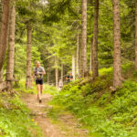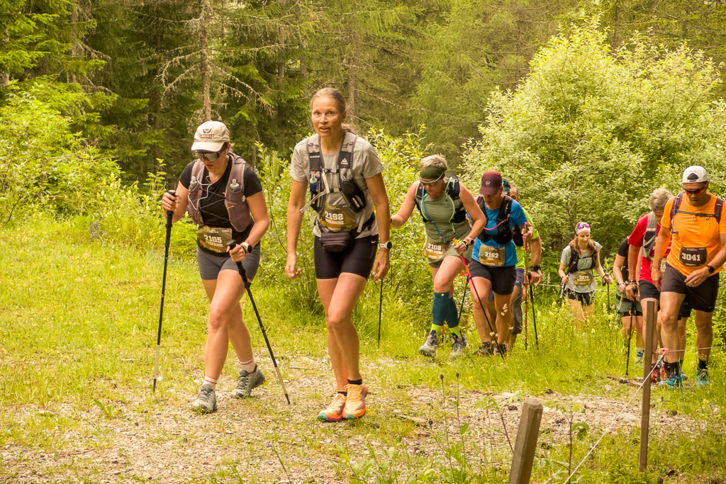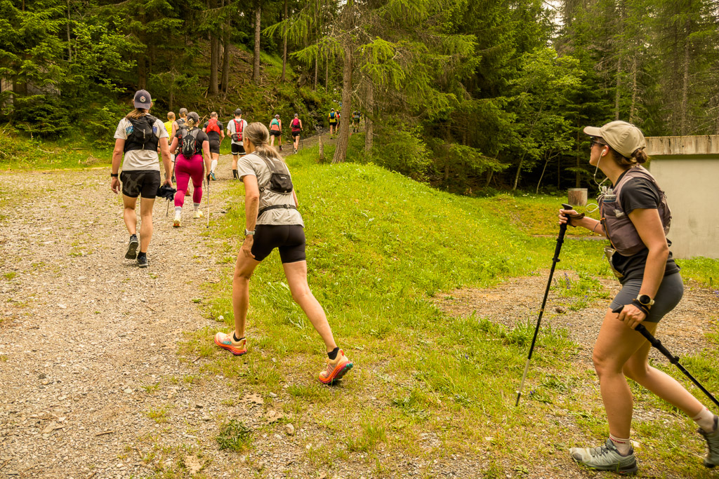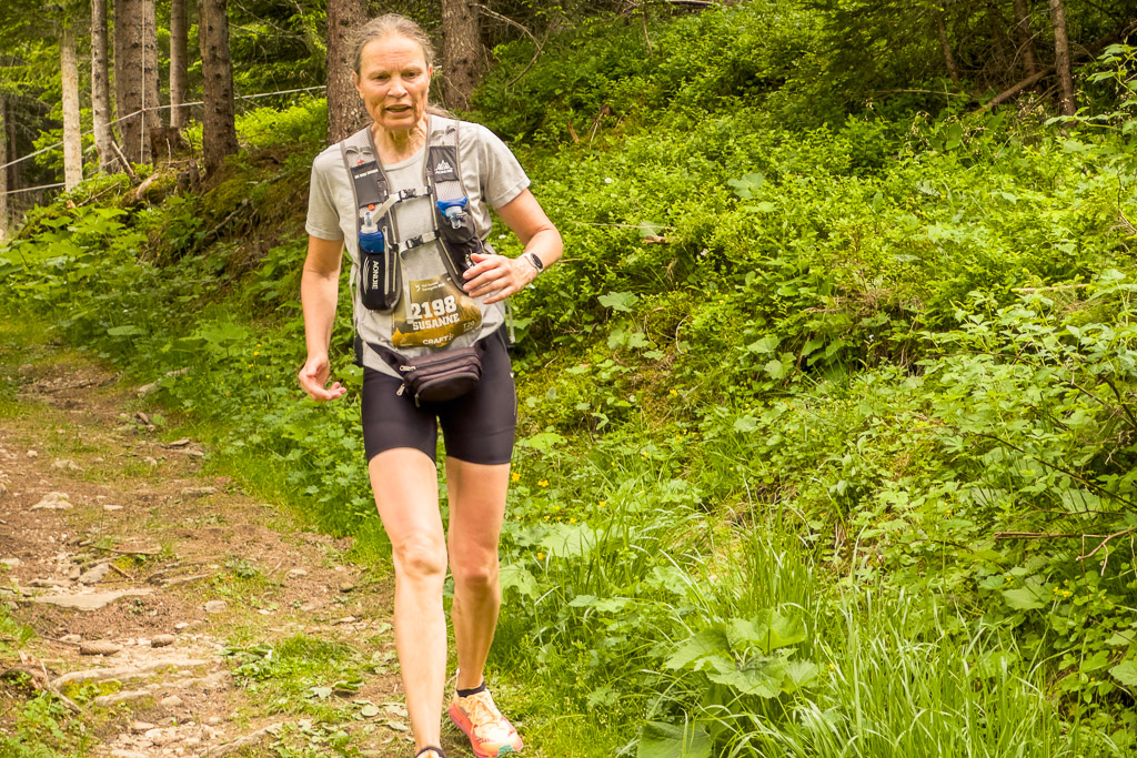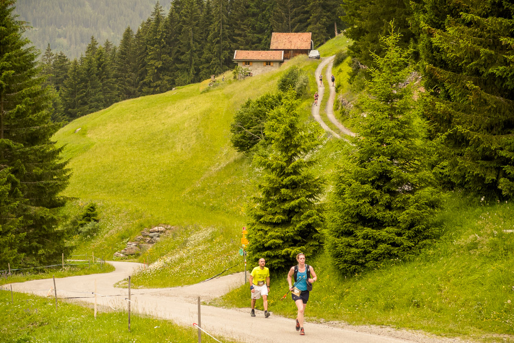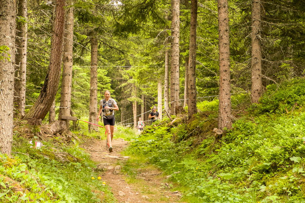 Irgendwann wurde klar: Susanne hatte inzwischen den Motta Tscharmoz überschritten und befand sich nun im Abstieg, während mir immer noch anderthalb Kilometer Fahrstrecke bergauf bevorstand. Ihr Positionspunkt bewegte sich nun sichtlich schneller, während meiner auf der Stelle zu verharren schien. In einer letzten Anstrengung trat ich in die Pedale. Zum Glück wurde der Weg auf dem letzten halben Kilometer wesentlich flacher, sodass ich Salva di Lattas rechtzeitig erreichte, als Susanne in 400m Entfernung nahte. Auch hier waren die Aufnahmen also geschafft. Susanne und ihre Mitläufer waren allerdings nicht zu beneiden: Die Laufstrecke kam auf feuchtem, stein- und wurzeldurchsetzten Untergrund aus dem Wald heraus und verschwand am anderen Wegrand ebenso steil wieder im Gebüsch.