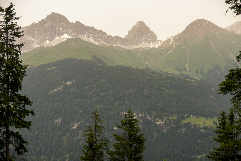 Der Alpweg, zunächst noch asphaltiert und mässig steil, ging weiter oben im Wald bald in Schotter mit deutlich mühsamerer Steigung über. Ich kurbelte Meter um Meter hoch, versuchte mich auf den Weg zu konzentrieren und möglichst nicht alle 10 Sekunden auf die Uhr mit Susannes Positionspunkt zu starren. Der bewegte sich zunehmend auf den kritischen Höhepunkt auf Motta Tscharmoz zu, während es bei mir im Schneckentempo vorwärts ging. Irgendwann schaltete ich dann auch die Anzeige der verbleibenden Strecke und Höhenmeter ab, um mich nicht völlig zu demotivieren. Die grösste Herausforderung bei diesem Zeitdruck war, Tempo und Puls unter Kontrolle zu halten, um nicht auf halbem Weg zu überhitzen und vorzeitig auszubrennen.