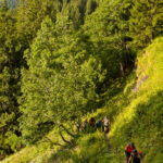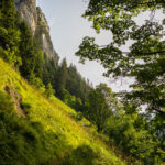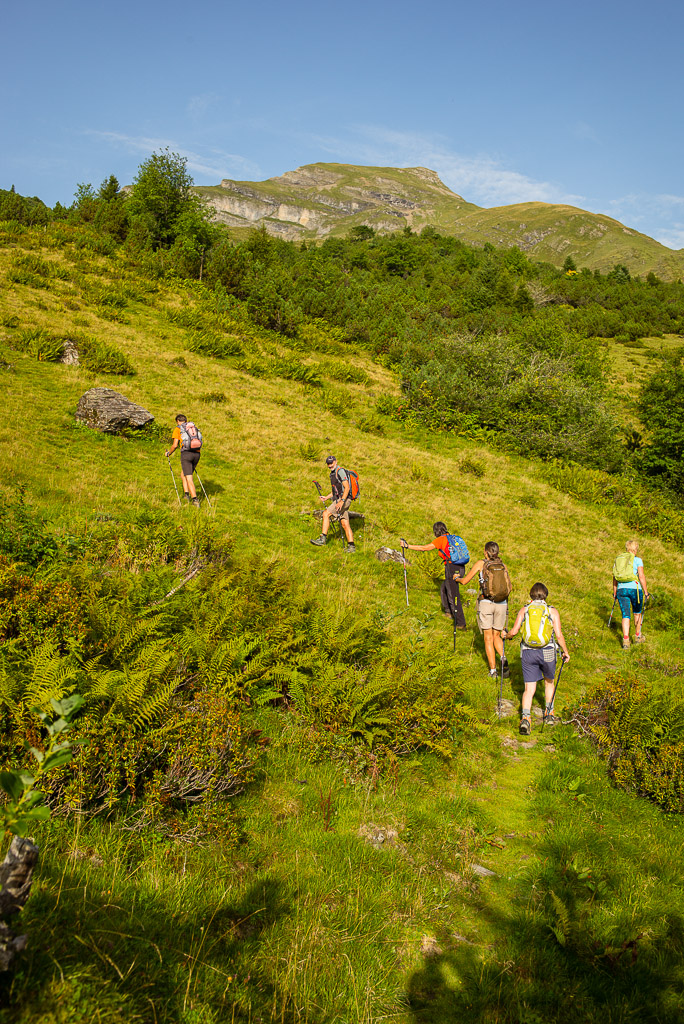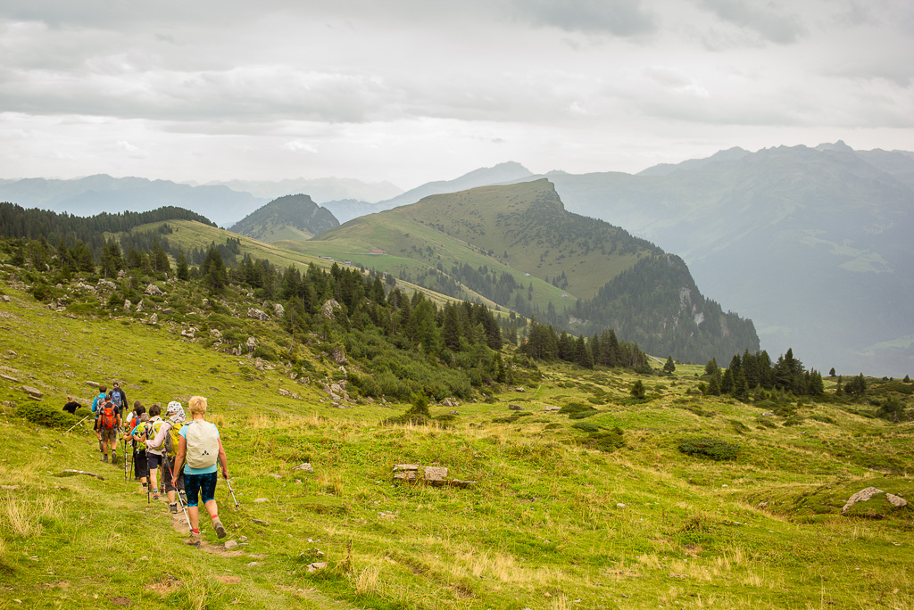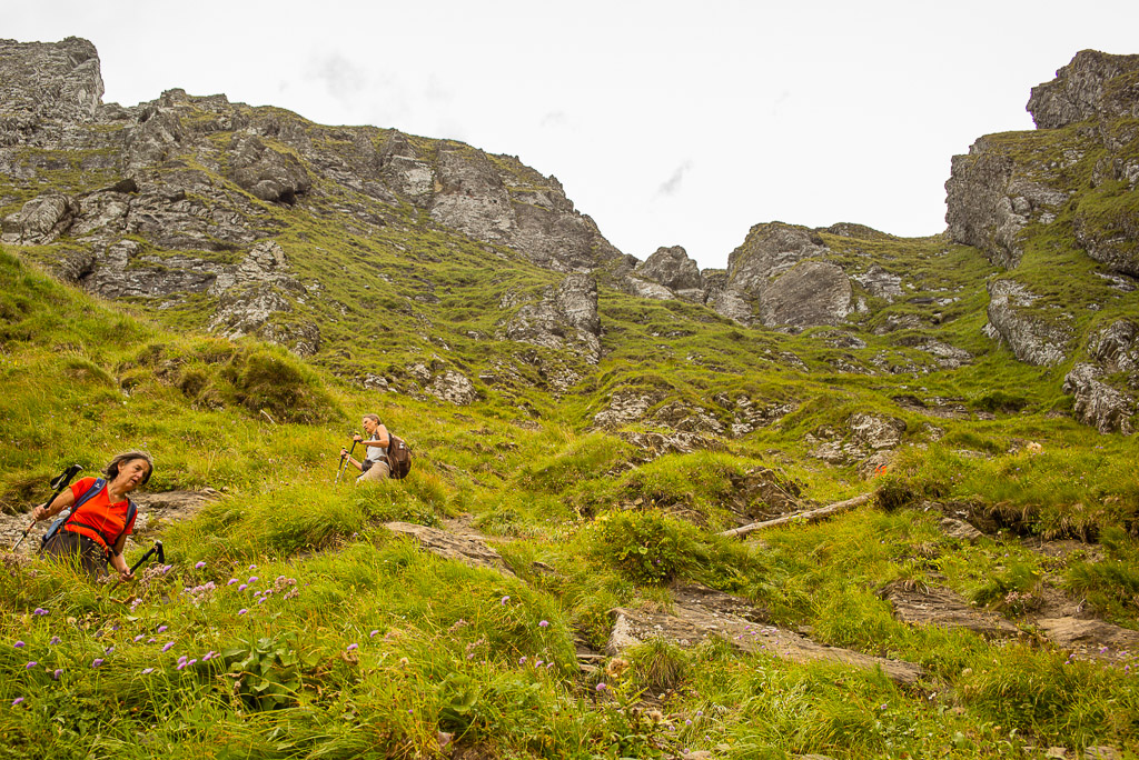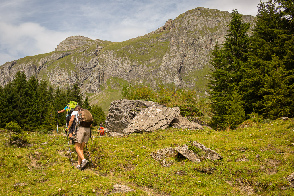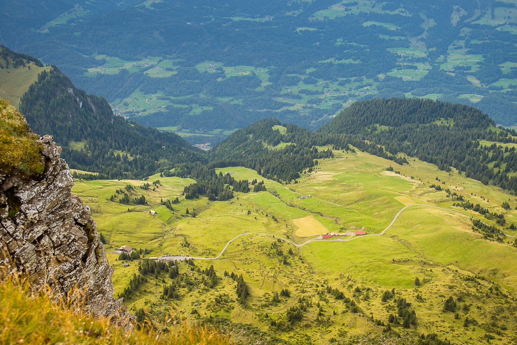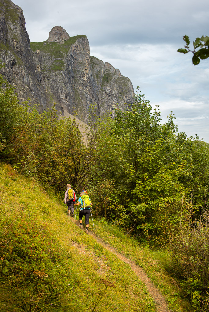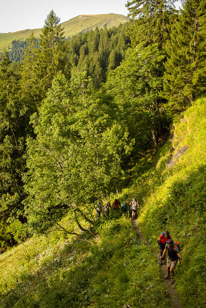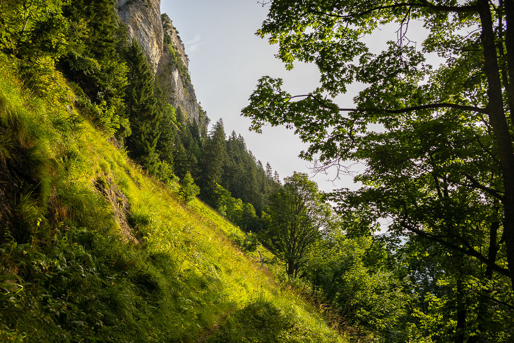 Vom Parkplatz aus etwa 100m auf der asphaltierten Straße bergaufwärts, bis auf der rechten Seite der breite Vormsweg abzweigt. Diesem wenig ansteigend durch Wald folgen. Der Weg verlässt den Wald nach etwa 800m und verengt sich zu einem schmalen Pfad auf den steilen Grashängen unterhalb der Felswände der Flidachöpf. Es geht auf diesem Pfad weiter nach Nordosten, bis der Felsriegel der Flidachöpf an seinem tiefsten Punkt durch eine steile, drahtseilgesicherte Rinne überwunden wird. Auf der anderen Seite steigt man ein kurzes Stück wiederum an Drahtseilen und entlang von senkrechten Felswänden ab zu den weiten Weidehängen von Pania. Von hier aus erblickt man die Alp Stofel in der Ferne.