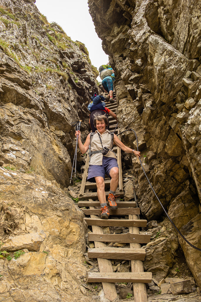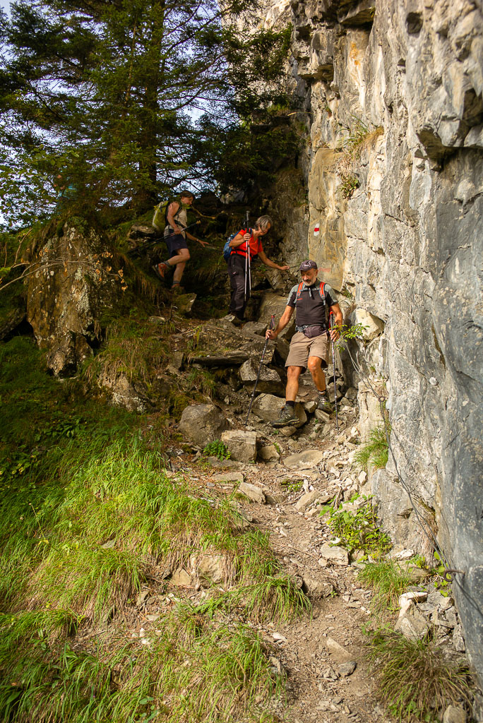 Im Chemmi sind Metall- und Holzleitern sowie Drahtseilsicherungen angebracht, mit deren Hilfe man durch die obersten Felsabbrüche auf einen Weg absteigen kann, der in vielen Kehren steil abwärts führt zu den felsdurchsetzten Grashängen von In de Stei. Man erreicht zuletzt über weniger steiles Gelände das Berghaus Palfris (bewirtschaftet).