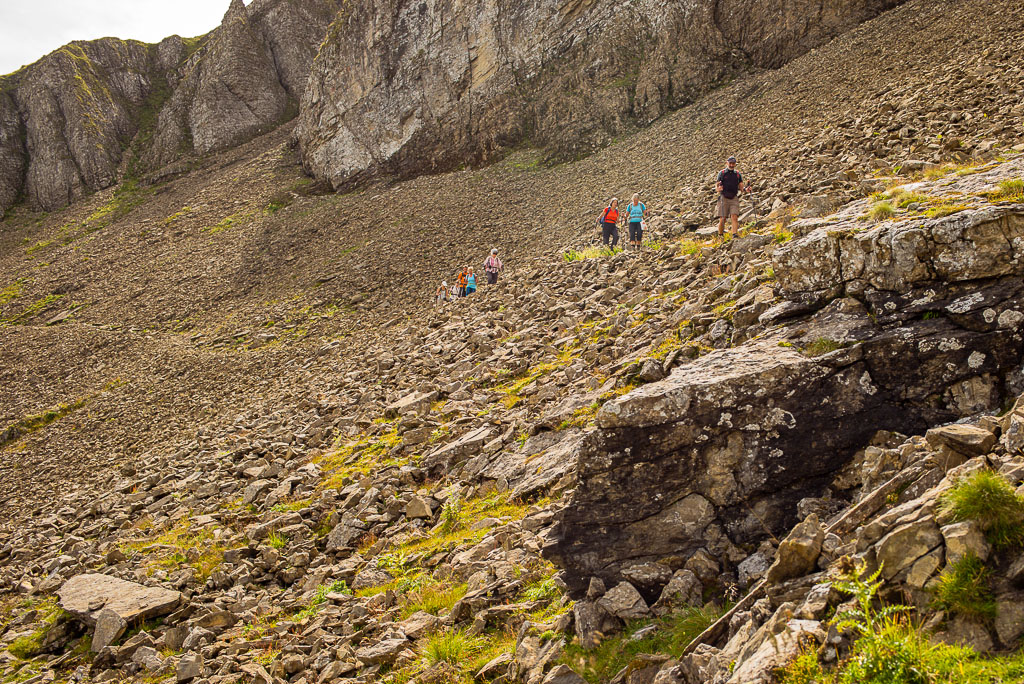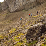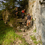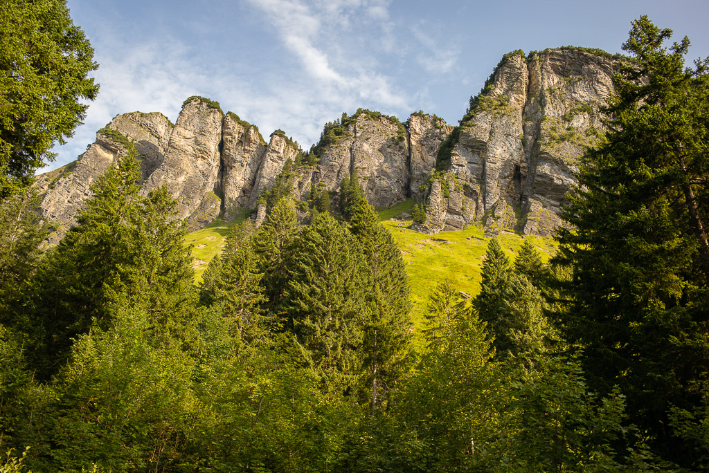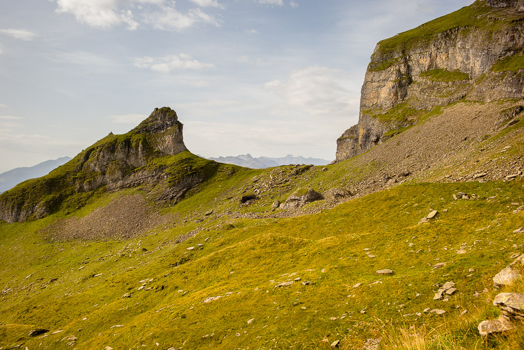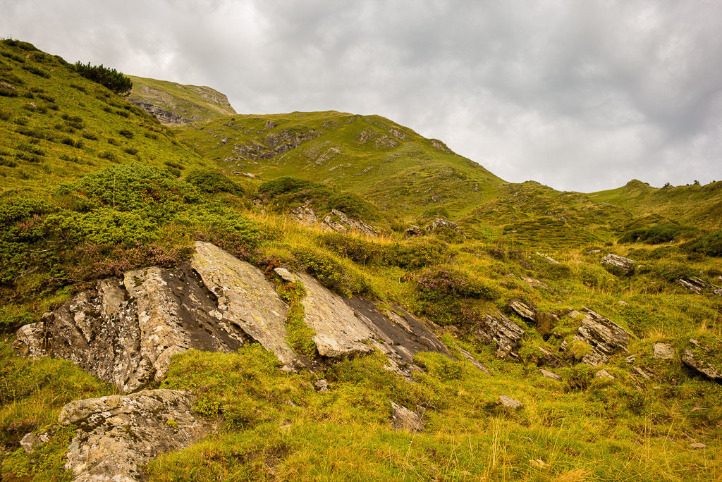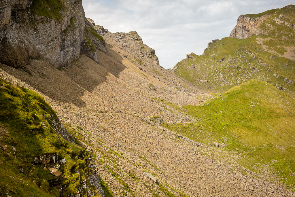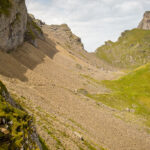 Im Abstieg vom Gipfel zuerst auf dem Aufstiegsweg hinunter bis auf 2.120m. Hier zweigt ein Pfad nach links ab und führt hinunter auf den weiten Geröllhang zwischen Gautschla und Alvier. Den Geröllhang überqueren und auf der anderen Seite teils weglos, teils auf spärlichen und schlecht erkennbaren Wegspuren aufsteigen bis zum Chemmi, einer steilen Rinne im schrofigen Grat zwischen Gauschla und Alvier.