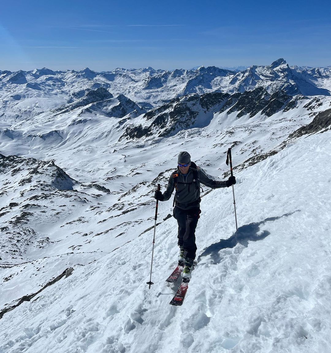 Mit Andi Reeg von La Veduta an der Julierpassstrasse durch das langgezogene Val d’Agnel zum Piz Surgonda (3195m). Frühlingshafte Schneeverhältnisse und meine erste Skitour auf über 3000m seit Jahrzehnten.