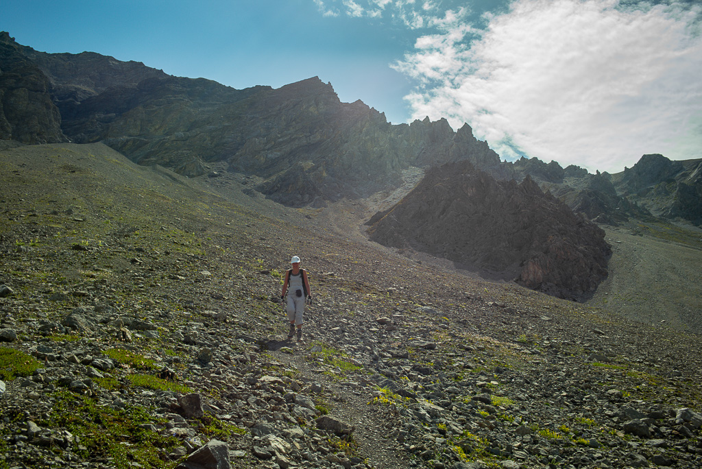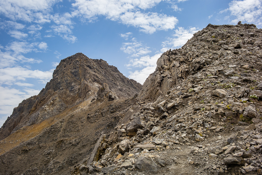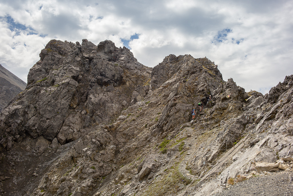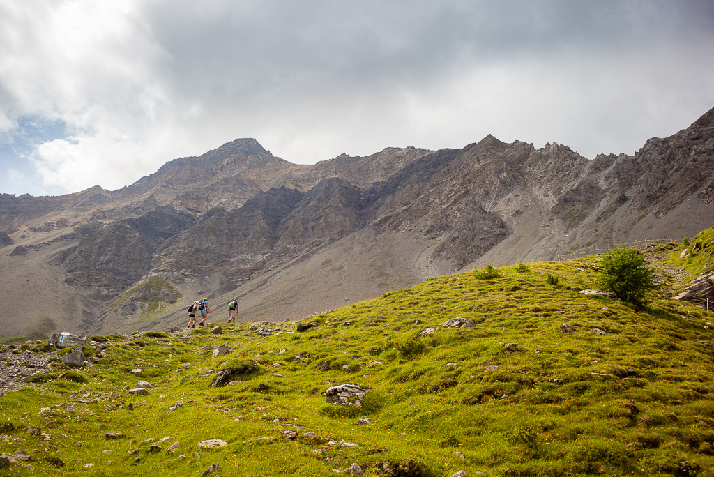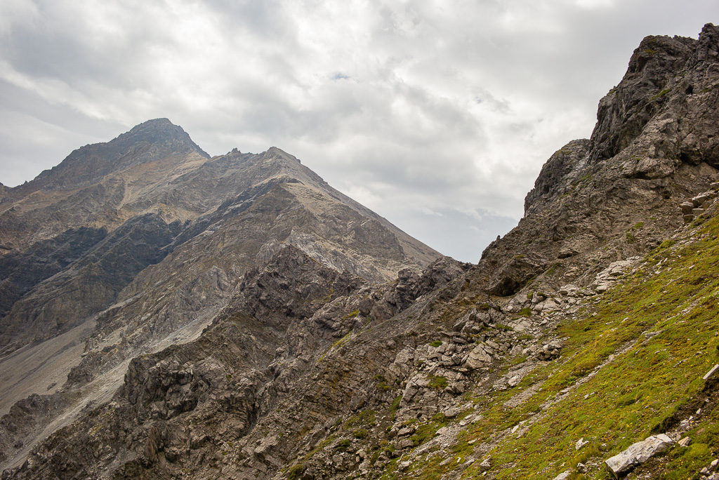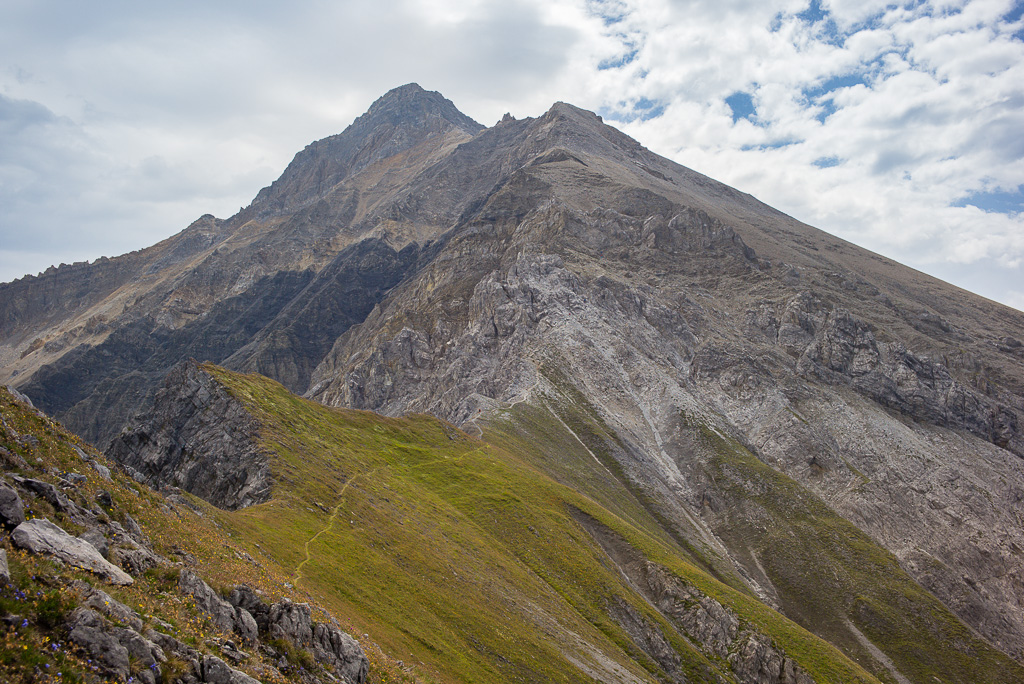 Zunächst führt der Weg in kurzen Kehren über steiles Grasgelände ohne Probleme hinauf zur Grathöhe. Von hier folgt man dem Gratrücken leicht über einen langen Grashang. Auf schuttbedeckten Felsbändern und -absätzen bis zum weithin sichtbaren Gipfelaufbau nehmen die Schwierigkeiten erstmals zu; das Gelände wird zunehmend steil und erfordert nicht nur Trittsicherheit auf dem losen Schutt, sondern auch Achtsamkeit auf das allgegenwärtige Steinschlagrisiko, das nun zusehends von weiter oben befindlichen Berggängern ausgeht.