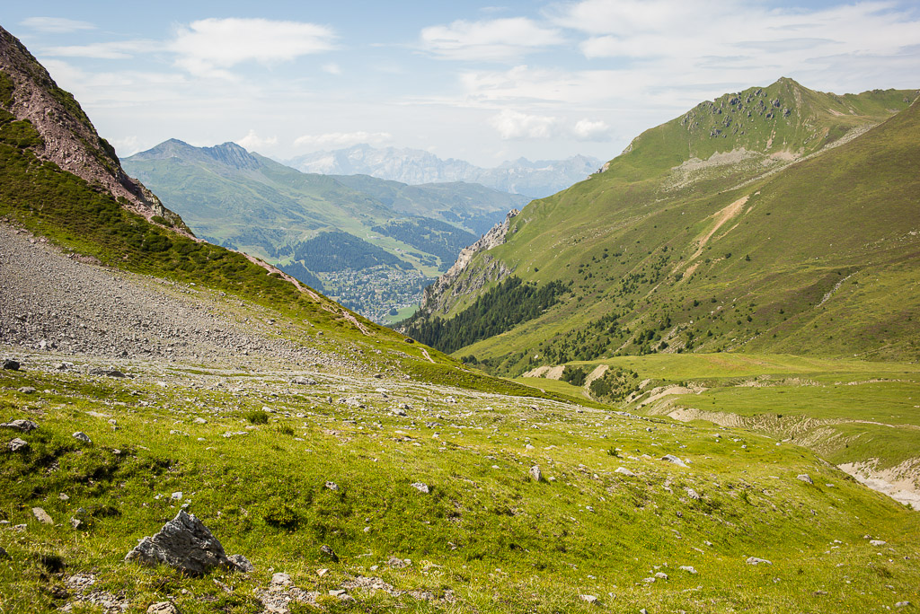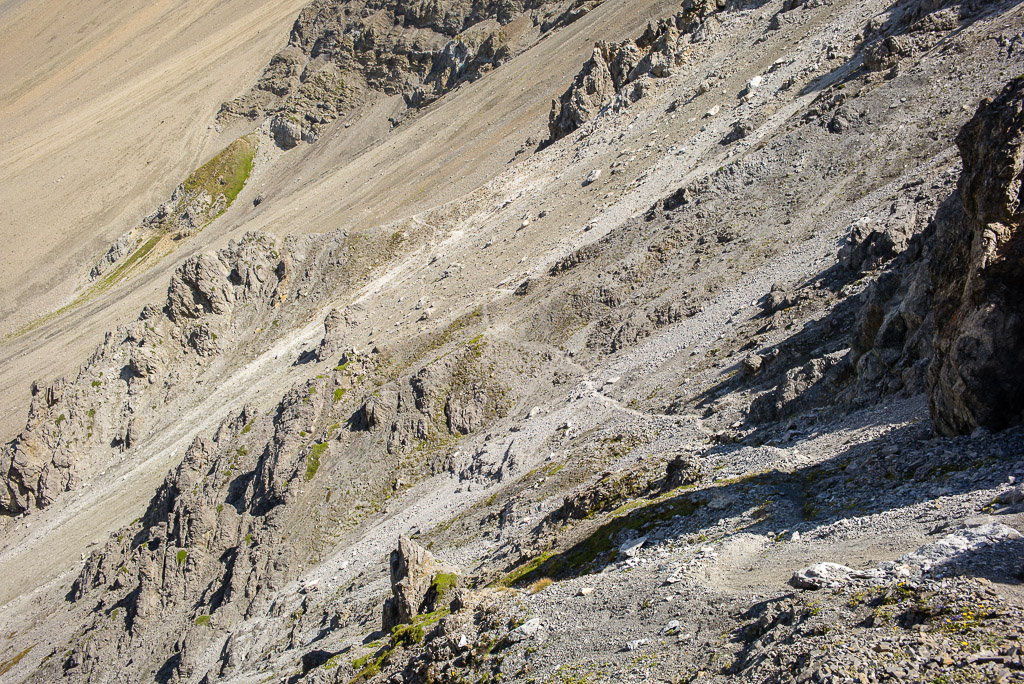 Auf dem Gratrücken beim langen Grashang zweigt eine Wegspur nach Osten in die Geröll- und Felsabbrüche der Nordflanke ab. Diese Spur quert mehrere Geröllrunsen und -rippen leicht absteigend, bevor sie in einem weiten offenen Geröllhang in kurzen Kehren in die Falllinie schwenkt. Danach weiter über flachere und einfache Grashänge weglos in Richtung des weithin sichtbaren Aufstiegswegs (in den man auf etwa 2.200m einmündet) und auf diesem zurück zur Alp Sanaspans. Das Abrutschen bzw. Abfahren auf der Geröllspur mit passendem Schuhwerk erlaubt einen einfacheren und schnelleren Abstieg als auf der Aufstiegsroute.