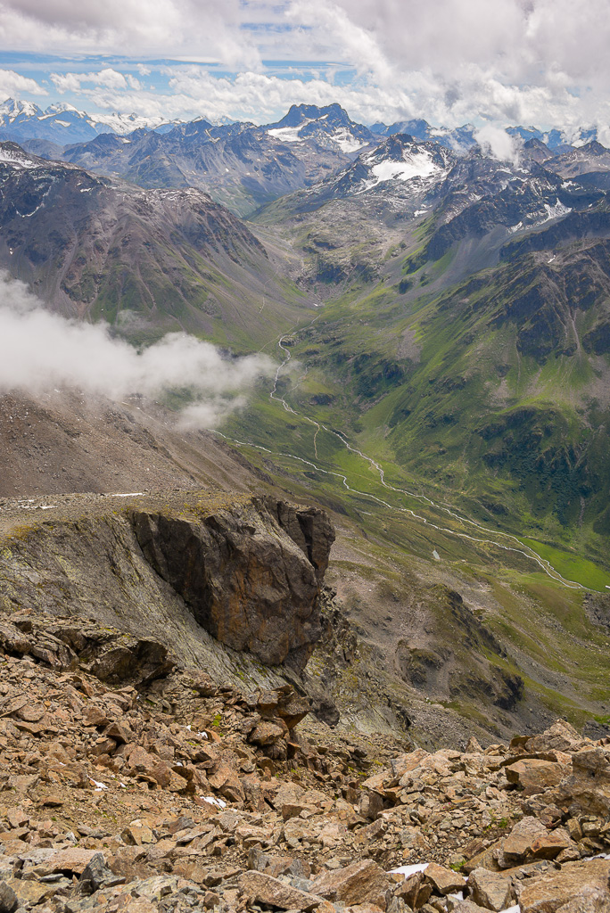 Statt nun wieder über den Geröllhang nördlich vom See aufzusteigen, überquert man die Geröllfläche wenig absteigend nach Nordosten (wenige, schwer sichtbare Steinmänner). Man kommt am oberen Rand mehrerer breiter Rinnen vorbei, die in die große Fläche unten im Radüner Tal leiten (Abstieg in diesen ohne Ortskenntnis nicht zu empfehlen, da von oben nicht einsehbare Felsstufen im unteren Teil).