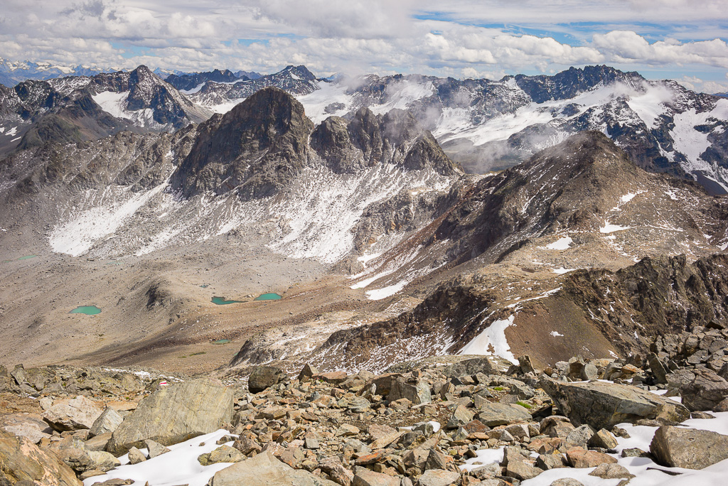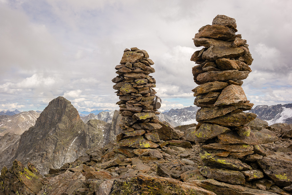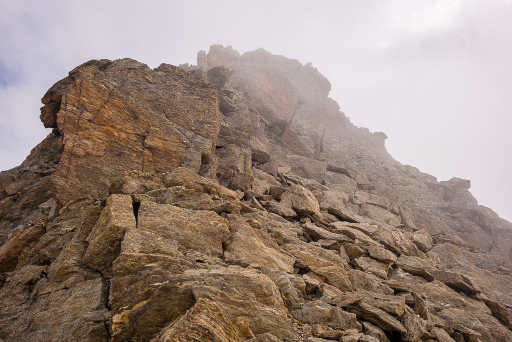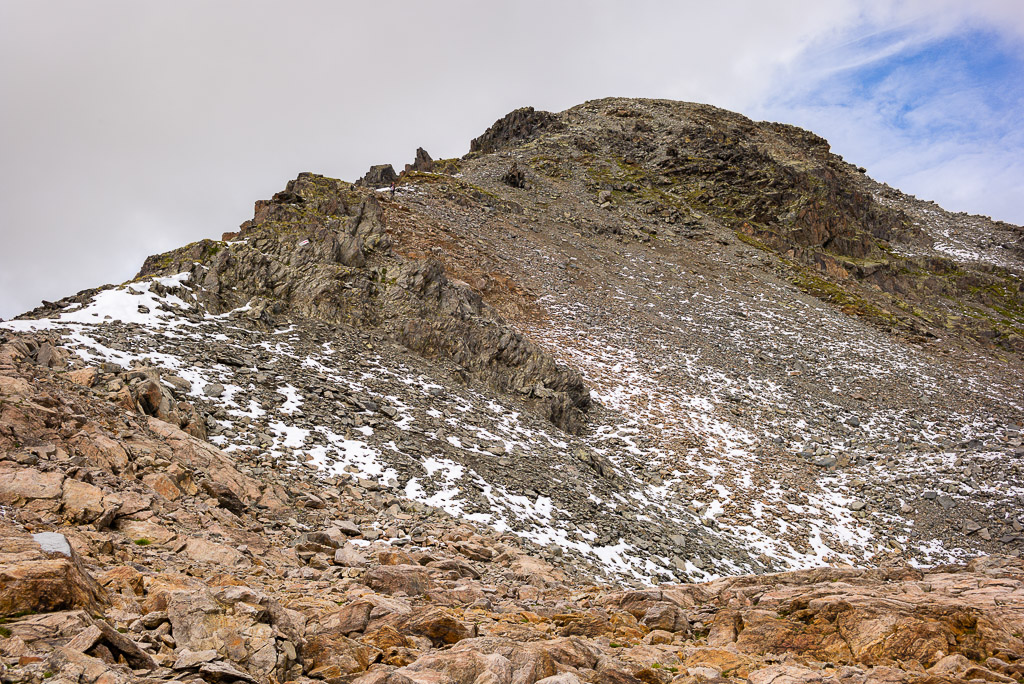 Auf der Grathöhe angelangt, klettert man – den einfachsten Möglichkeiten folgend – ohne besonders exponierte Stellen über den Blockgrat stetig hoch zu den alsbald sichtbare werdenden vier großen Steinmännern auf dem Gipfel (3.022m).