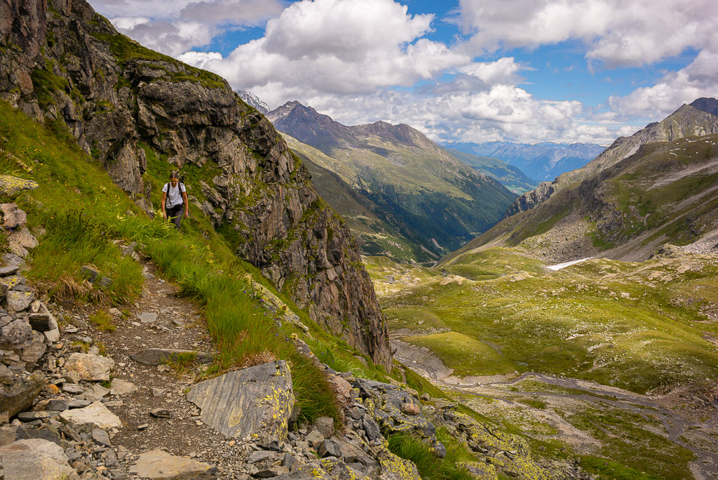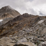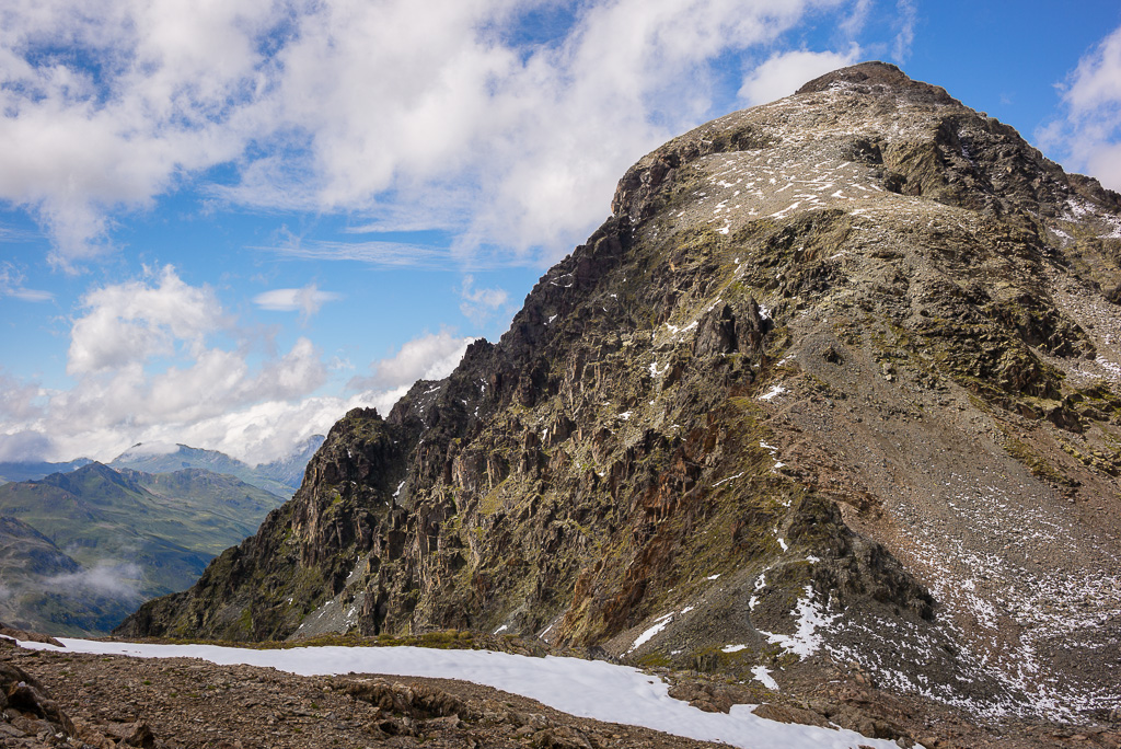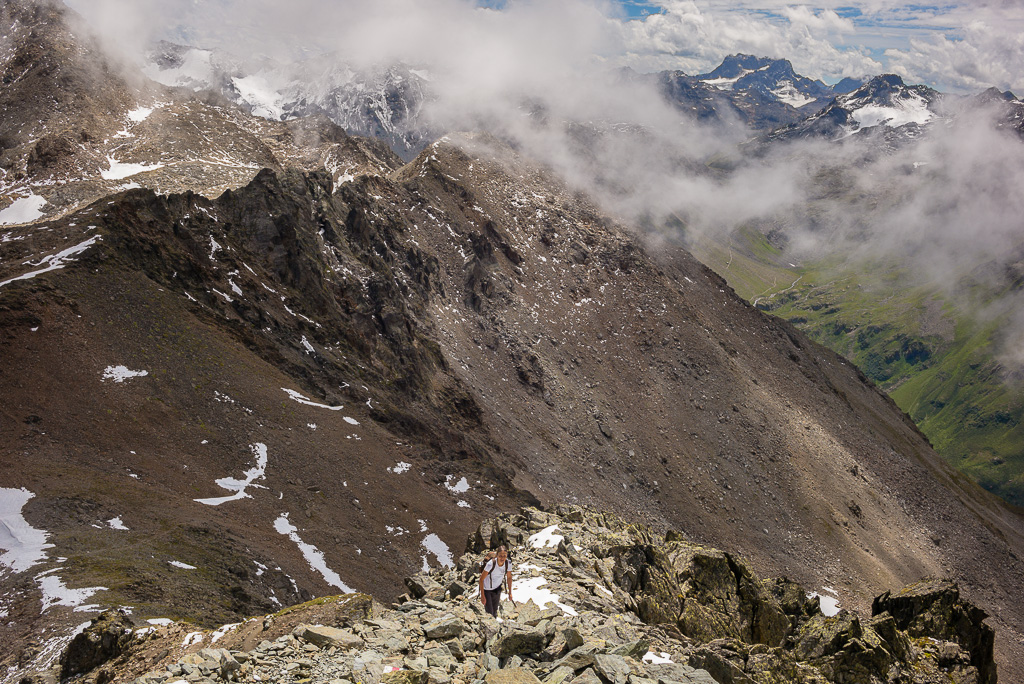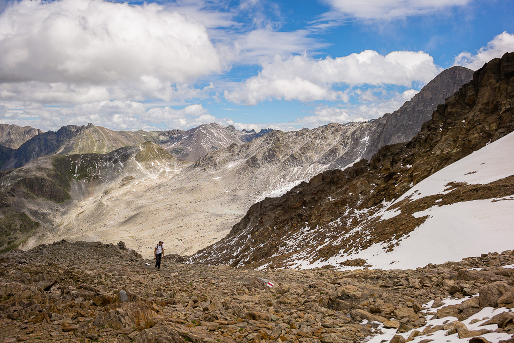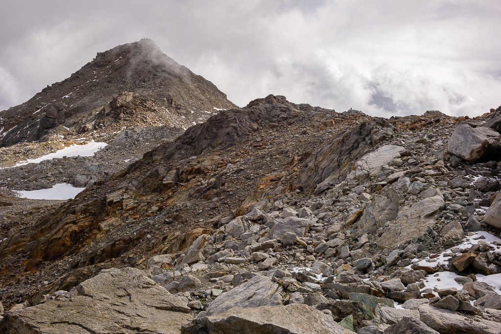 Von hier wendet sich der Weg nach Norden und führt in Kehren angenehm und stetig höher auf dem breiten, mit Schutt und Blockgeröll bedeckten Südgrat des Schwarzhorns zum Gipfelkreuz auf 3.146m.