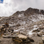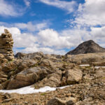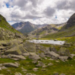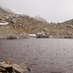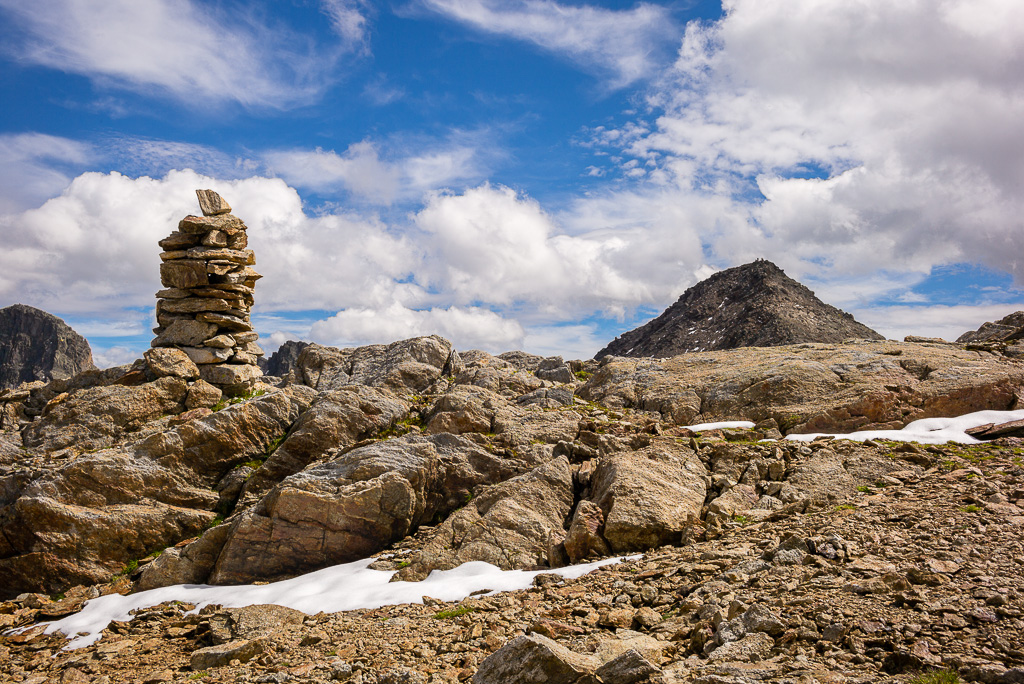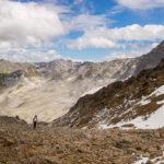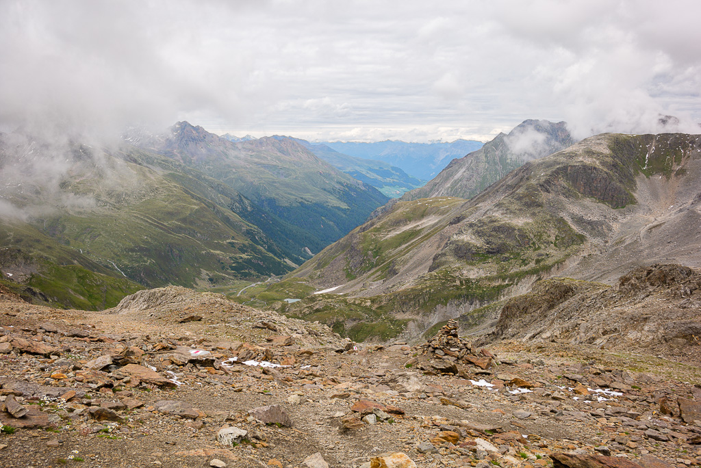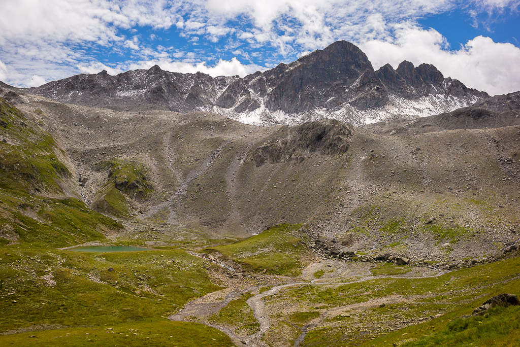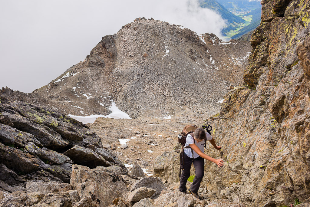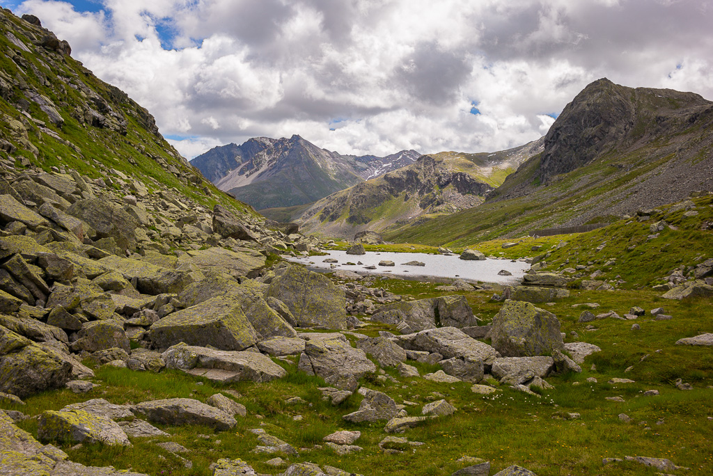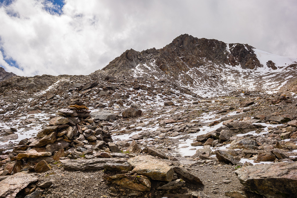 Im Abstieg zurück bis zur Schwarzhornfurgga. Nun nicht nach links auf dem Aufstiegsweg hinab, sondern auf einer schwachen Wegspur im Geröll geradeaus weiter aufsteigen zu einem großen Steinmann, der schon vorher von weitem sichtbar war. Schwachen, teilweise kaum sichtbaren Pfadspuren und zahlreichen kleineren und größeren, manchmal schwer zu findenden Steinmännern folgen und über einen mäßig steilen Hang mit grobem Geröll absteigen zu einem kleinen Bergsee in einer Mulde (2.880m).