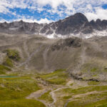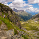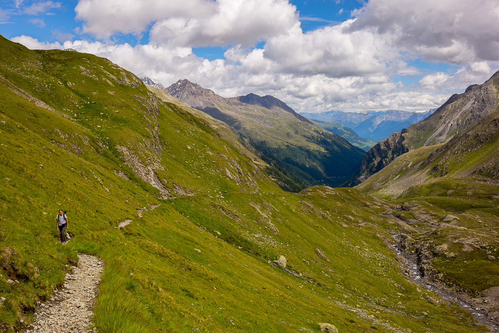 Der Weg führt zunächst über steile Grasflanken am Rand des breiten Geröllkessels im Radüner Tal. Über den zunehmend steinigen, aber stets problemlosen Pfad erreicht man einen Wegweiser bei einer Abzweigung auf 2.800m Höhe. Nach weiteren 100 Höhenmetern gelangt man auf den Geröllsattel der Schwarzhornfurgga.