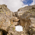 Statt in der steilen Rinne vom Gratrücken des Radüner Rothorns abzusteigen, kann man auch weiter dem Gratrücken entlang nach Nordwesten absteigen (einzelne Steinmänner auf dem Grat). Man erreicht die Geröllmulde am Fuß des Gipfels etwas südöstlich vom See.