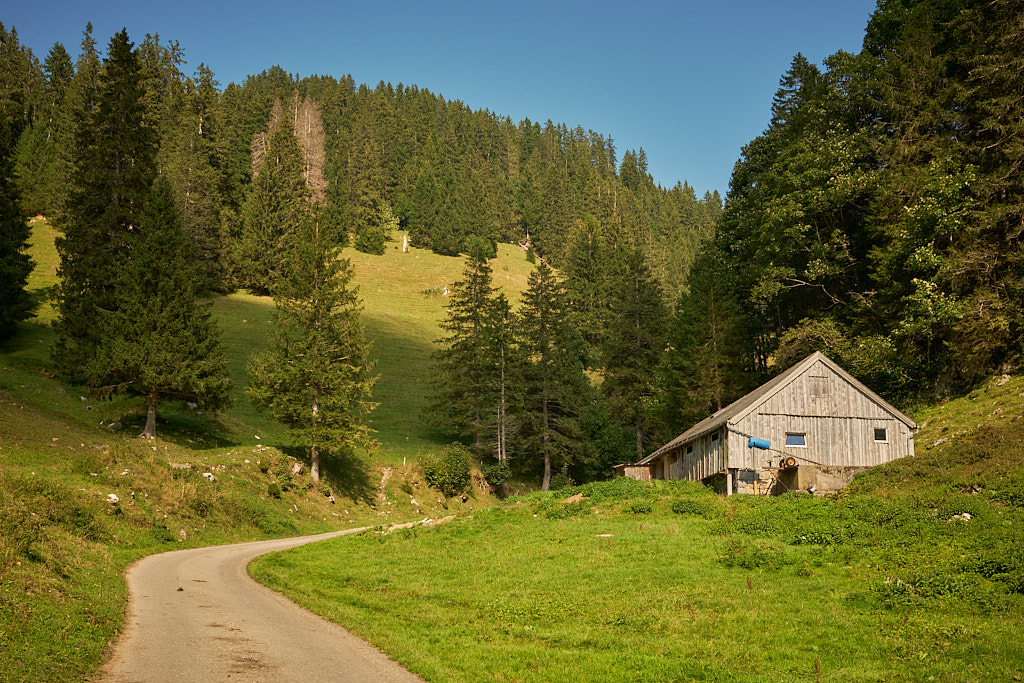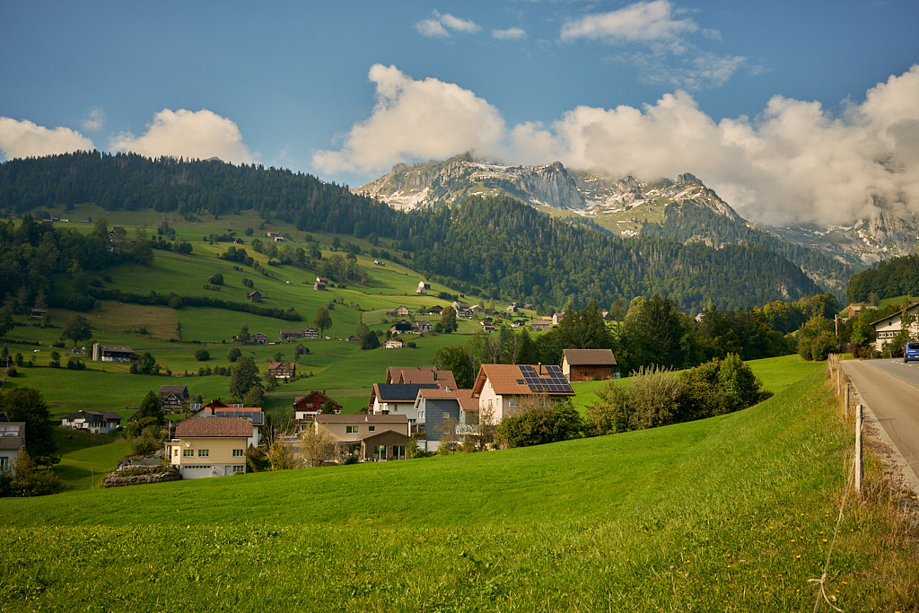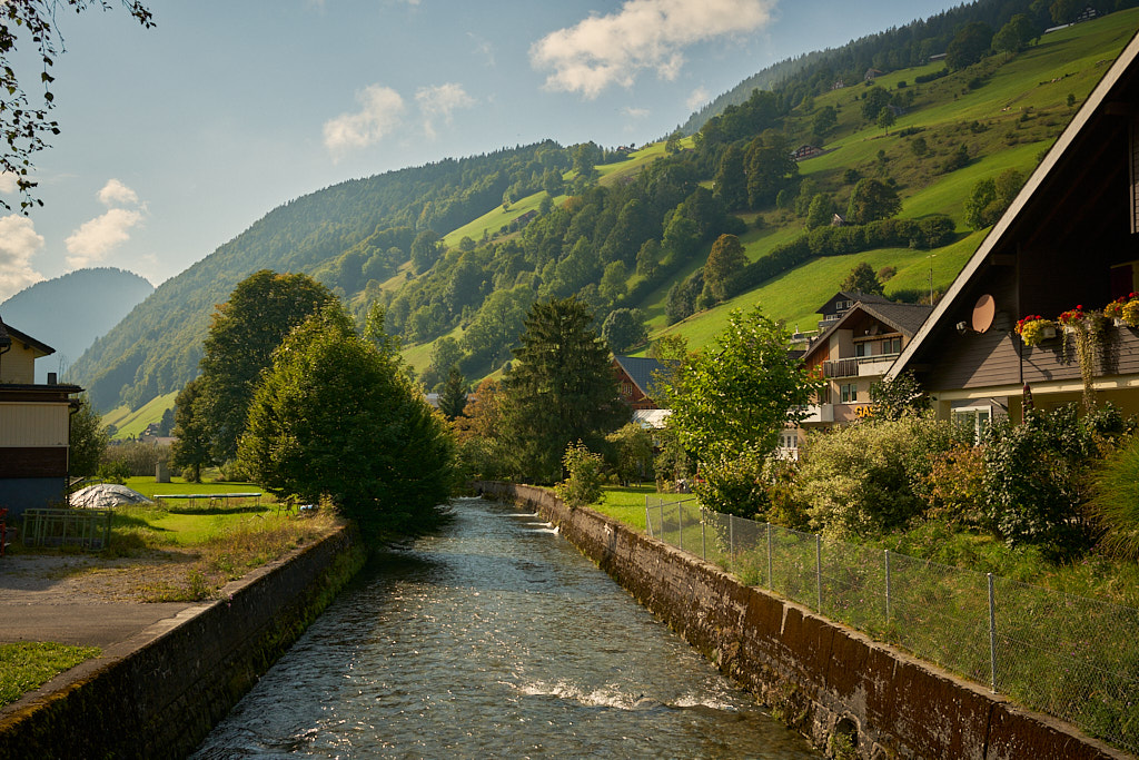 Im Toggenburg endete die Abfahrt dann im Dorf Starkenbach. Auf einer Nebenstrasse fuhr ich der Thur entlang nach Alt St. Johann und von dort auf der Hauptstrasse weiter durch Unterwasser und Wildhaus. Die Landschaft war nun eindeutig voralpin geprägt mit Höhenlagen zwischen 800 und 1000 Metern, die Wiesen leuchteten grün und viele Häuser waren geradezu postkartenmässig kitschig mit Blumen geschmückt.