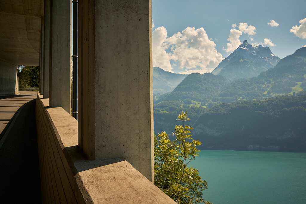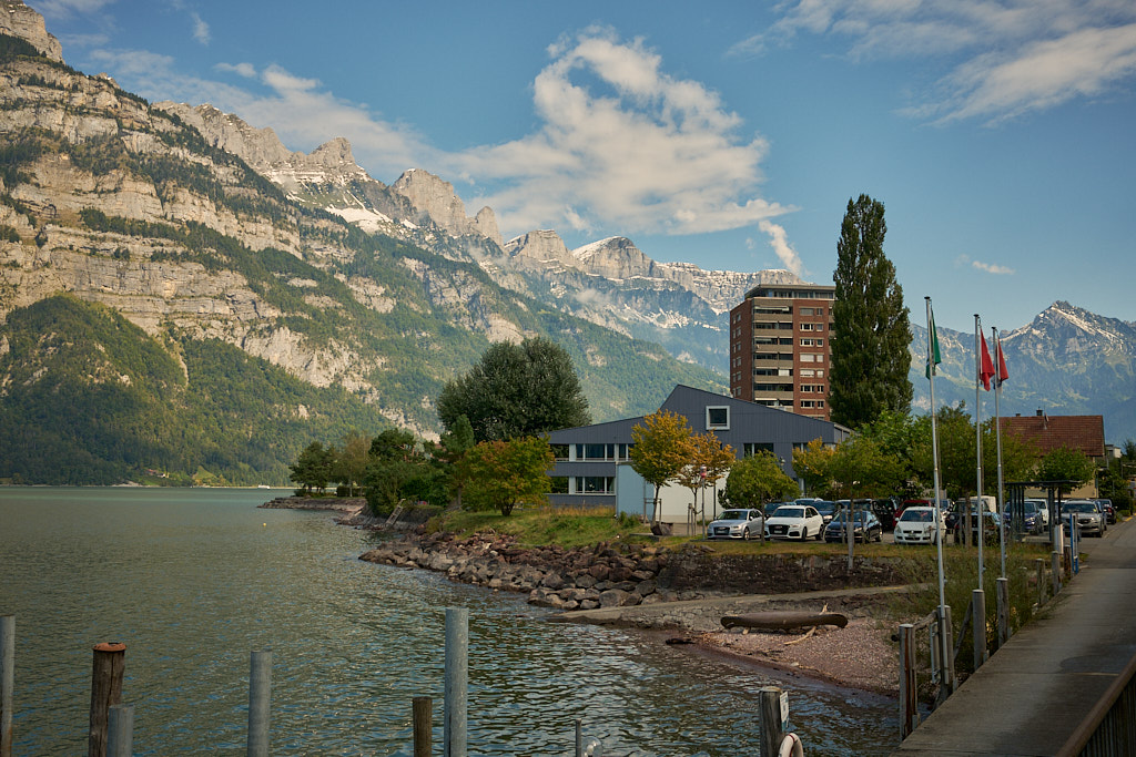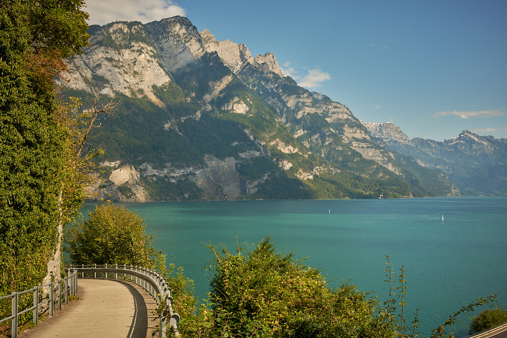Von meinem Ausgangspunkt in Bad Ragaz fuhr ich zunächst über Wangs, Vilters und Mels zum schnurgeraden Radweg, der am Ufer der Seez entlang an Flums vorbei bis nach Walenstadt führte. Dort begann die sehr abwechslungsreiche nächste Etappe vom östlichen zum westlichen Ende des Walensees bei Weesen. Der Radweg verlief durchwegs abseits vom Verkehr direkt am Ufer oder durch Wohnviertel, immer wieder mit kleinen Zwischensteigungen und -abfahrten. Ständig begleitet wurde man vom grandiosen Ausblick auf die Churfirsten, die hoch über dem gegenüberliegenden Seeufer aufragten. Bald wurde erstmals der Blick auf Weesen und auf die Sonnenterrasse von Amden mitsamt des bevorstehenden steilen Aufstiegs frei.