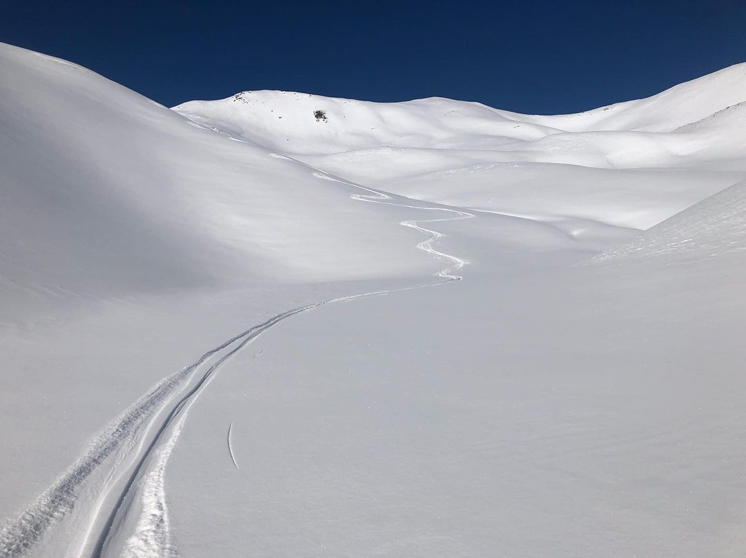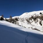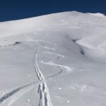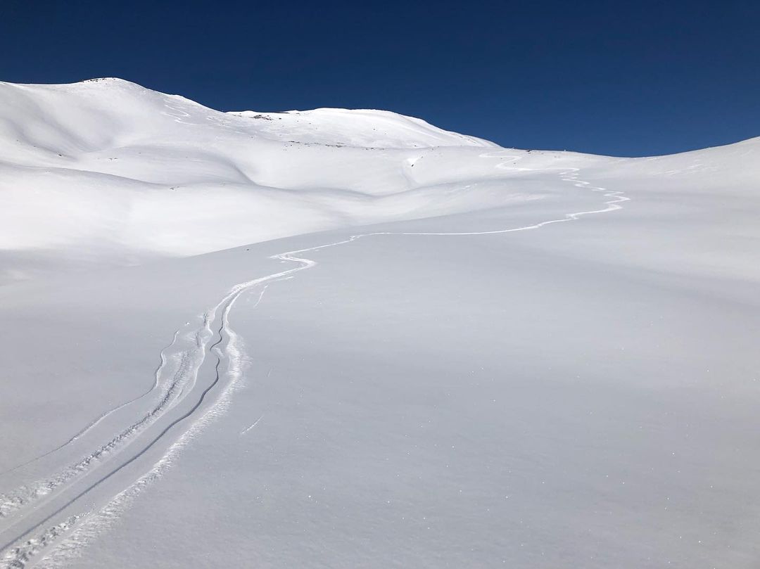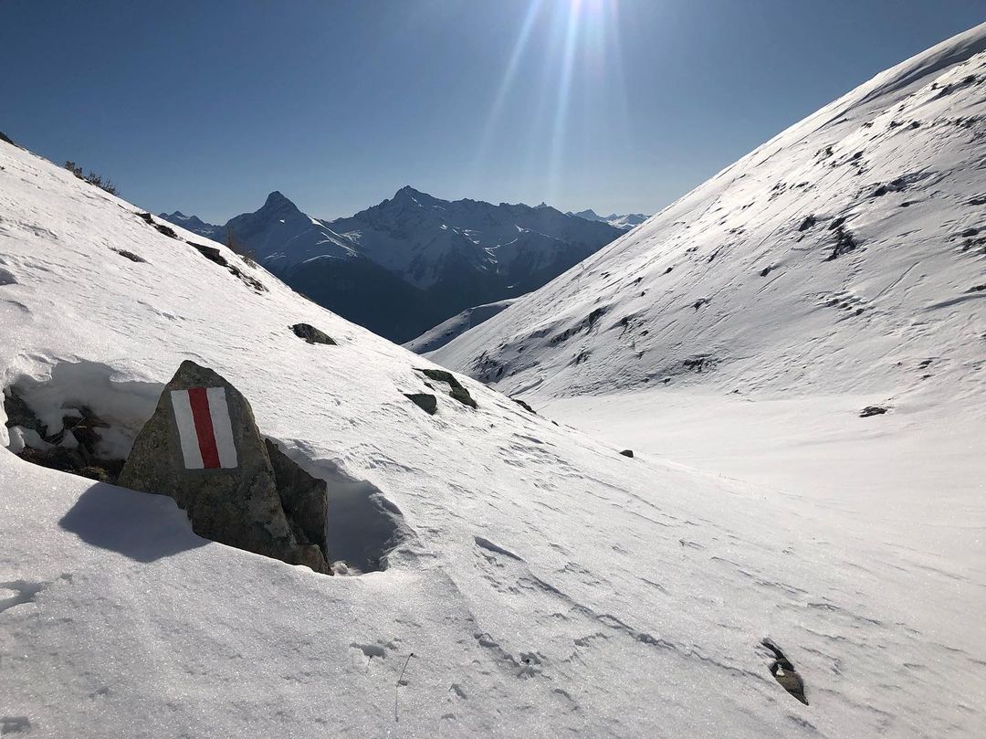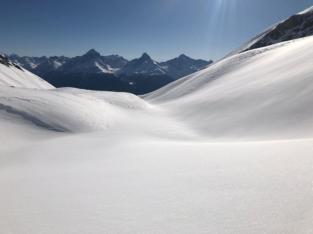 Erste Besteigung des Sandhubel (2763m) mit Ski. Grossartige Abfahrt in weiten Schwüngen über die Hänge des Gurgelun nach Martrüel und weiter zur Schmittner Alp.
