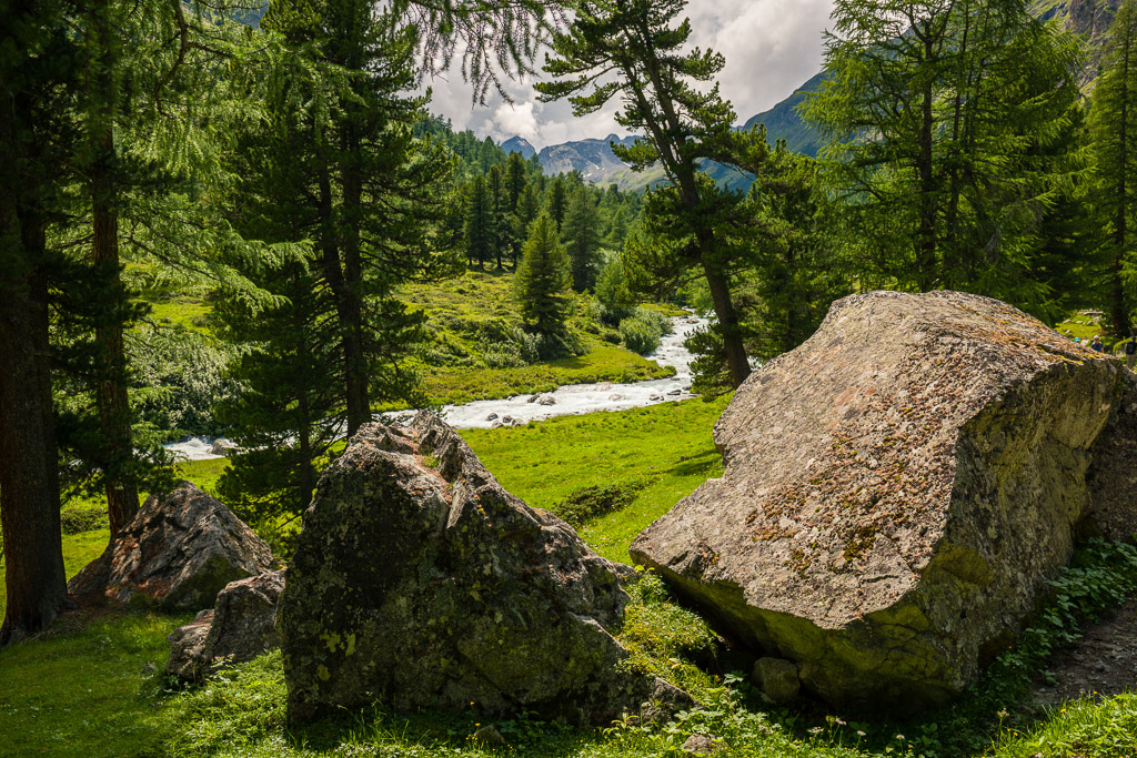 Nach der Alp Crap Alv überqueren wir die Passstrasse erneut. Durch lichten Wald laufen wir hinunter zum Lai da Palpuegna. Von hier aus ist es nicht mehr weit zum Bahnhof Preda.