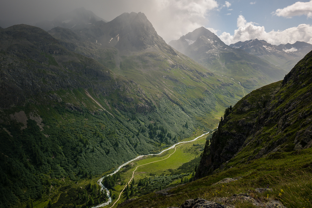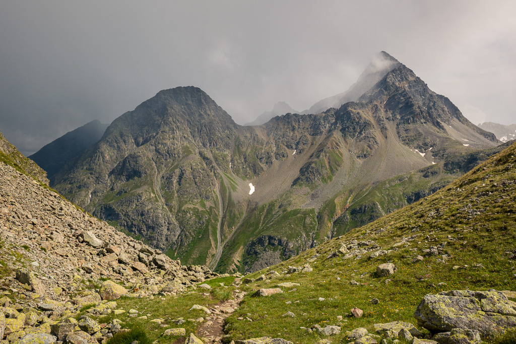 Ab hier geht es einsam auf einem Wanderweg 500 Hm hinauf zur Passhöhe der Fuorcla Crap Alv. Über uns erheben sich die Felswände der Bottas Glischas und auf der gegenüberliegenden Talseite des Val Beverin thront der Piz Ot. Wir sehen aus der Höhe auch weit ins Talende hinein in Richtung Piz d’Err und Nachbargipfel.