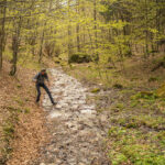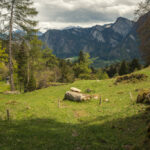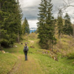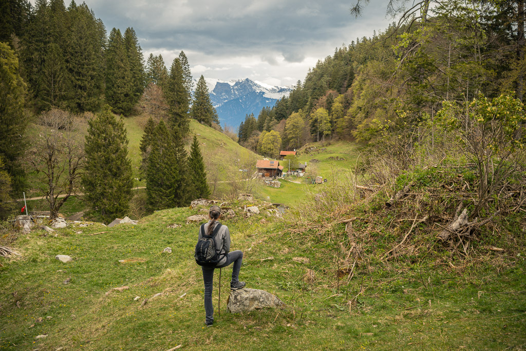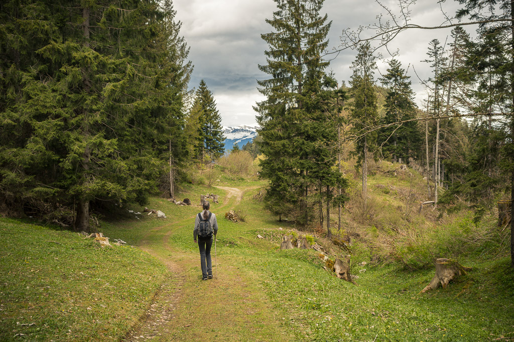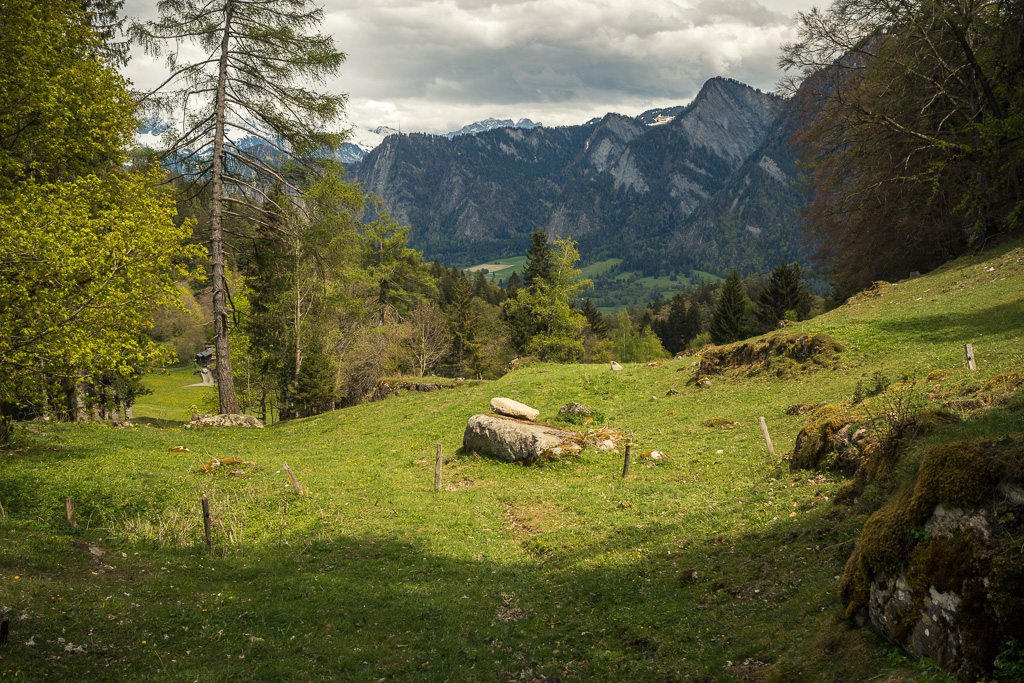 Auf Waldwegen ging es weiter bis nach Bärenhag. Bald dahinter teilte sich der Weg vor einem felsigen Hügel namens Gürstig Chopf. Während ich beim letzten Mal rechts darum herumfuhr, gingen wir nun links. Auf den ersten hundert Metern war der Weg eins mit einem sumpfigen Bachlauf; dies wurde zum Glück bald besser und trockenen Fusses erreichten wir die in einer Geländemulde völlig abgelegenen Ferienhütten von Prameister.