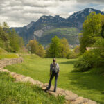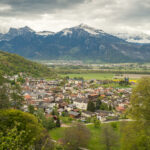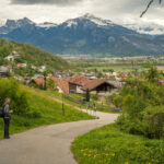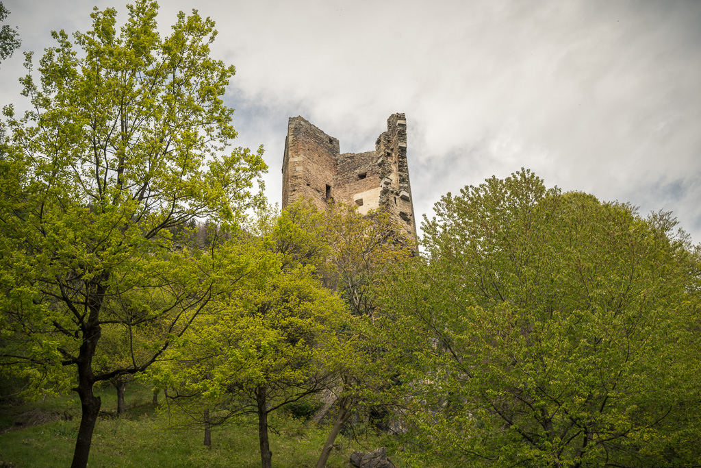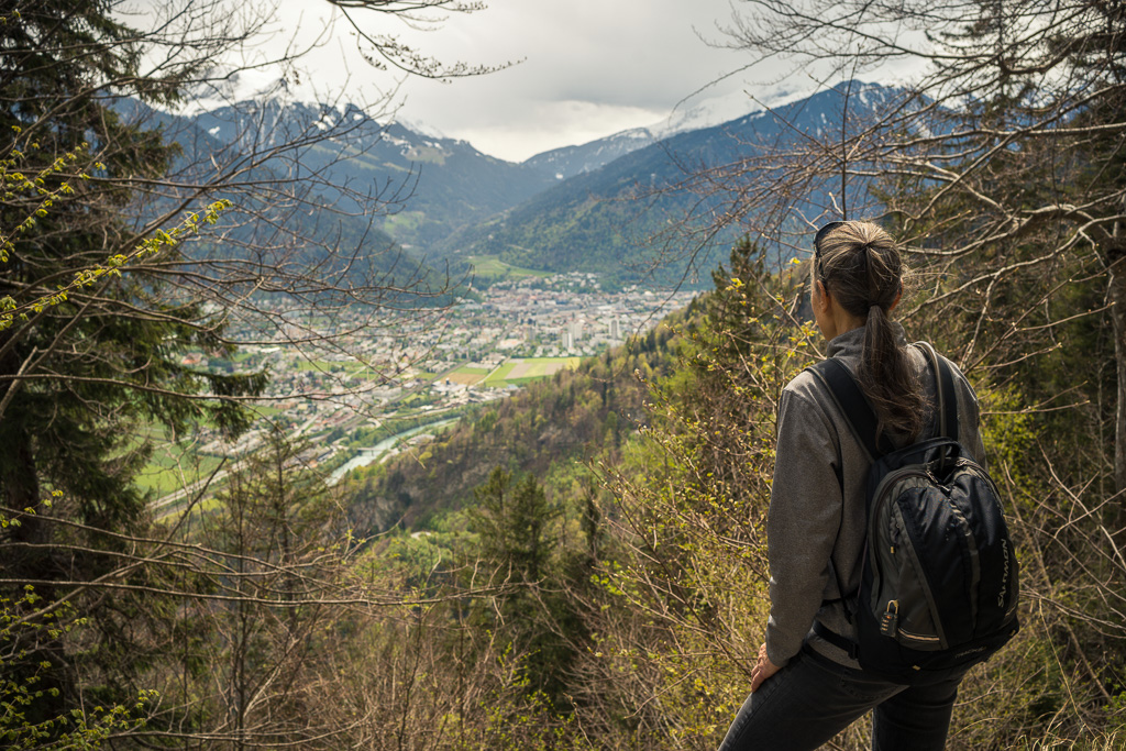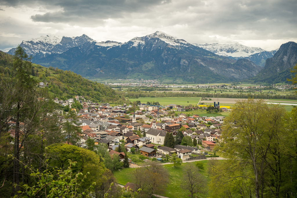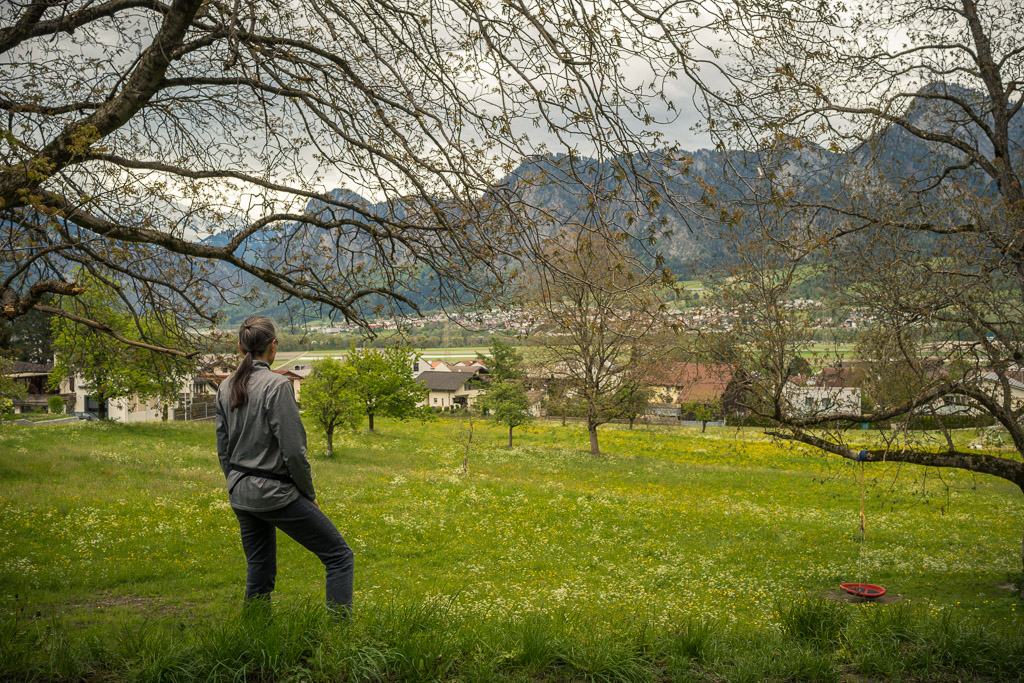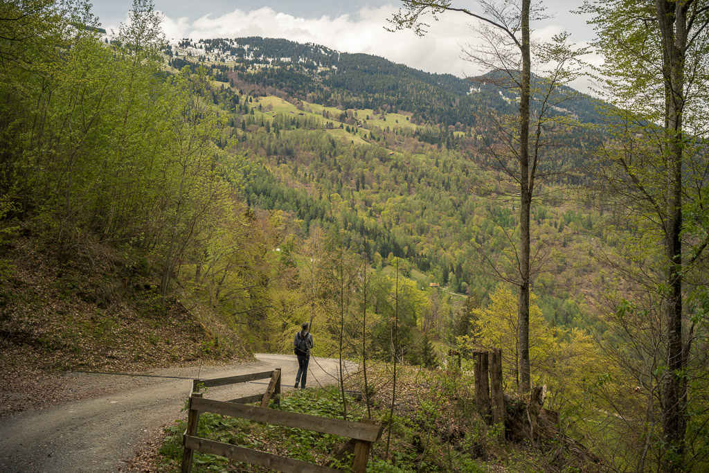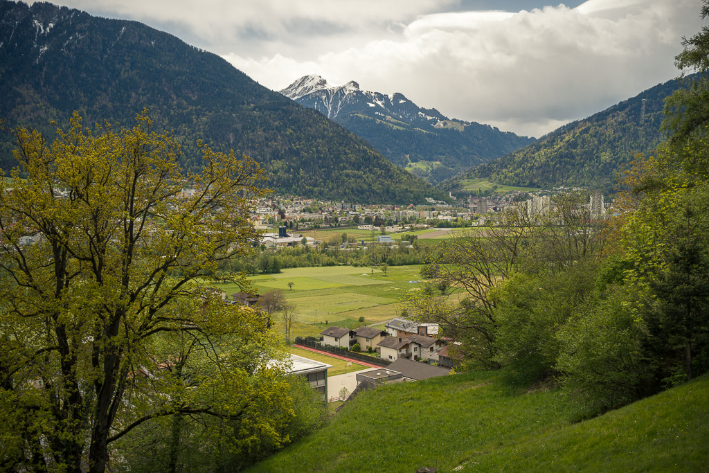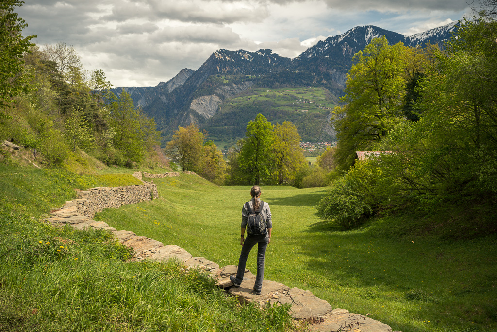 Vom Bahnhofplatz in Chur war es mit dem Stadtbus ein Katzensprung ins benachbarte Haldenstein. Dort begang wiederum der steile Aufstieg zur Burgruine Grottenstein, den ich vom letzten Mal noch bestens im Gedächtnis hatte. Die Burgruine war auch diesmal wegen Bauarbeiten gesperrt, kurz dahinter kamen wir aber an einer schönen offenen Waldlichtung mit Aussicht vorbei.