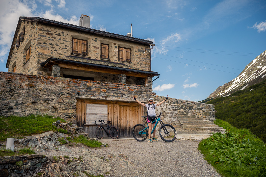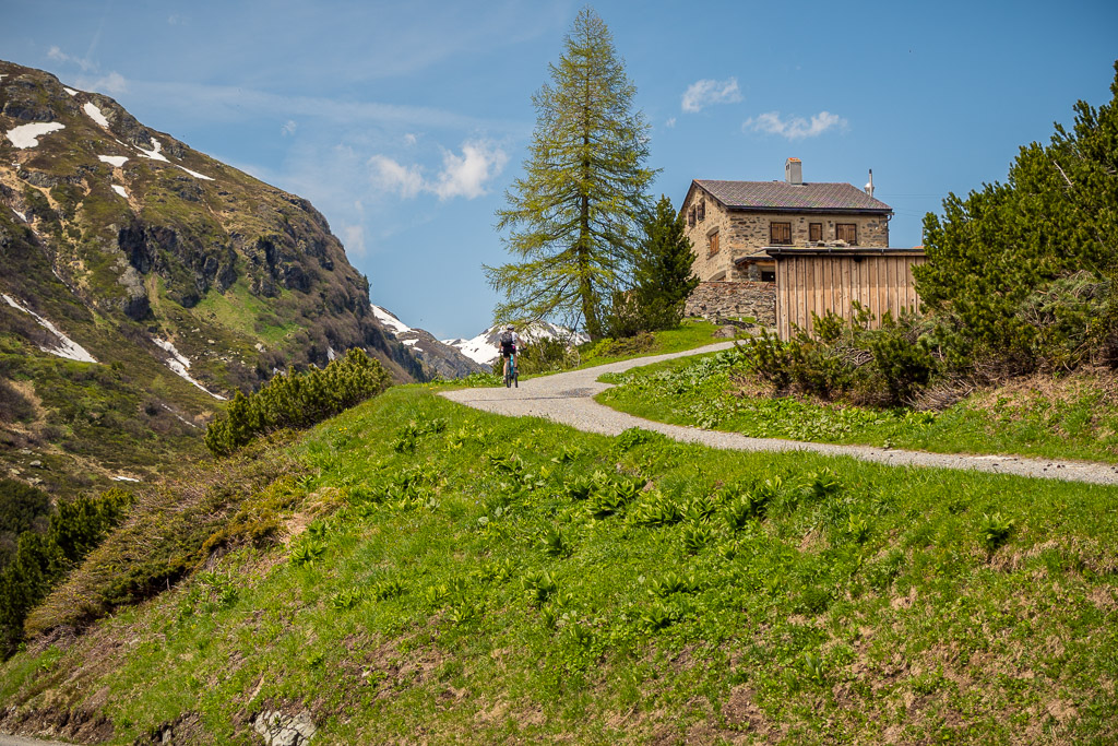 Das Berghaus war bekanntlich geschlossen. Wir trafen dort auf ein Paar aus Klosters, das ebenfalls mit den Bikes hochgefahren war. Sie bestätigten unsere Vermutung, dass während der Saison im Sommer wegen den Einkehr- und Übernachtungsmöglichkeiten hier tatsächlich mit viel Trubel und Verkehr auf dem Alpweg hierher zu rechnen sei.
