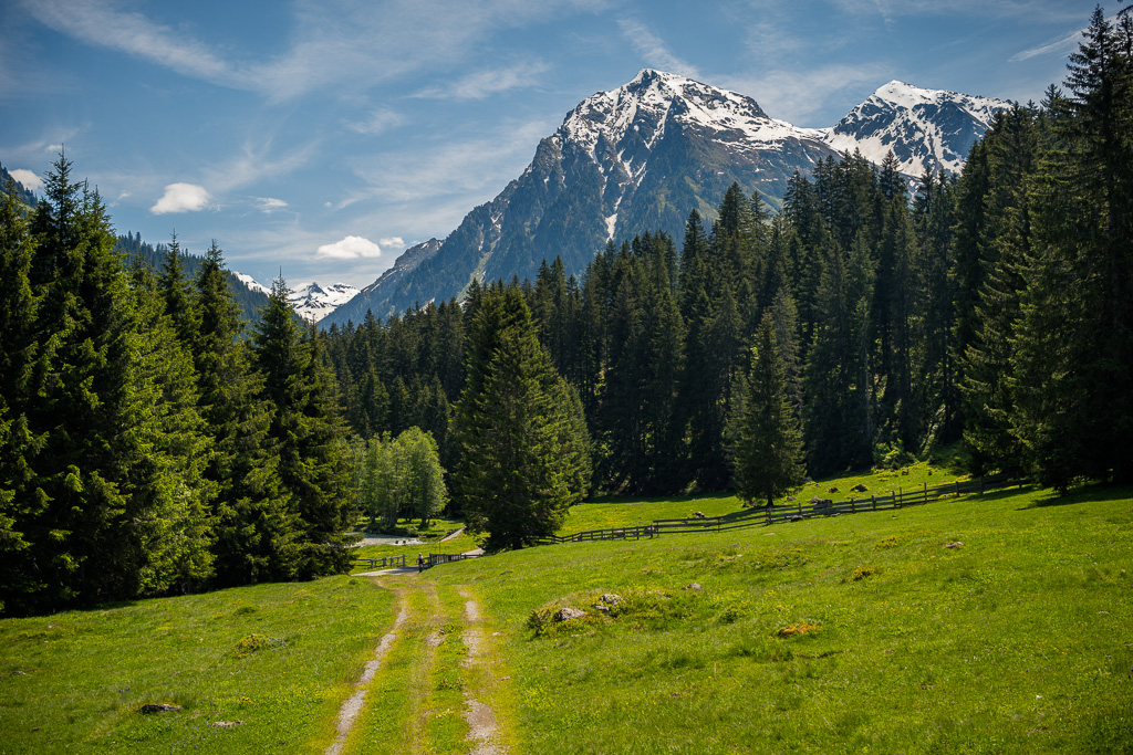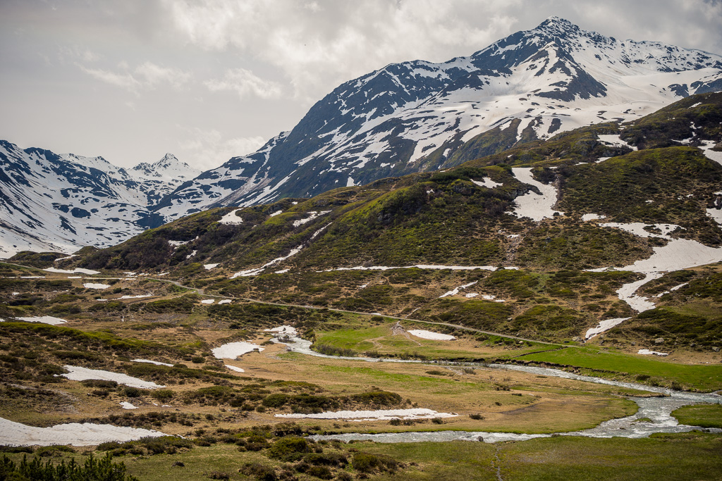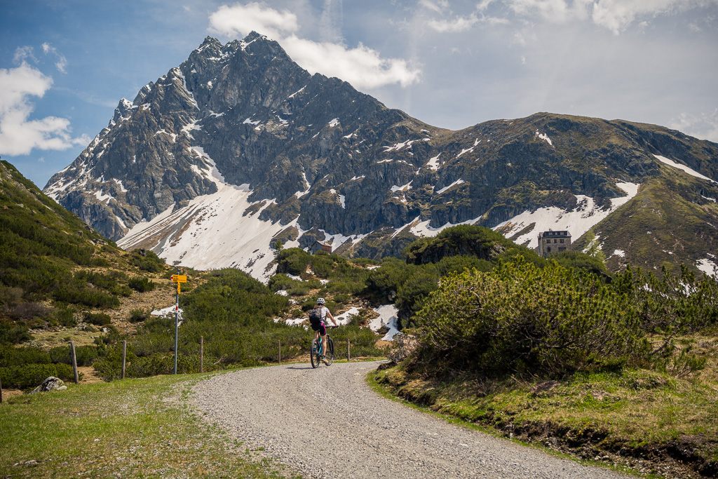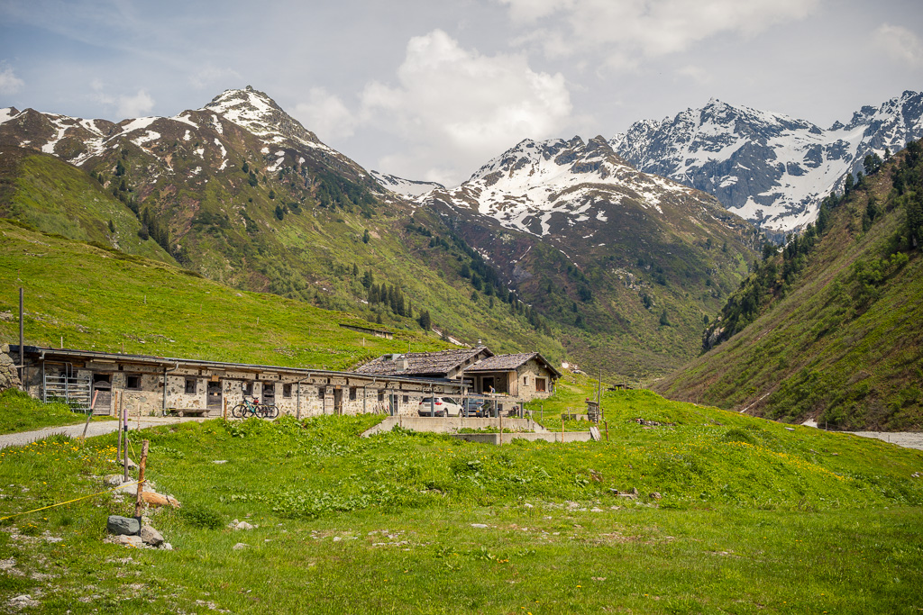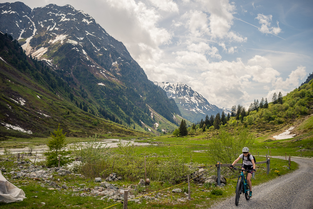 Der Anstieg zur Alp Sardasca war wesentlich kürzer und weniger anstrengend als das Vereintal zuvor. Nach den ersten Kurven durch den Wald öffnete sich das Tal schnell und wir fuhren im weiten Talboden bis zum Ende des Fahrwegs bei der Alp. Auch hier bot sich eine herrliche Aussicht auf die umliegenden Bergketten, die nun alle im Grenzgebiet zu Österreich lagen. Über die (noch verschneiten) Wanderwege könnte man von hier ins Montafon und zum Beispiel zum Silvretta-Stausee gelangen.