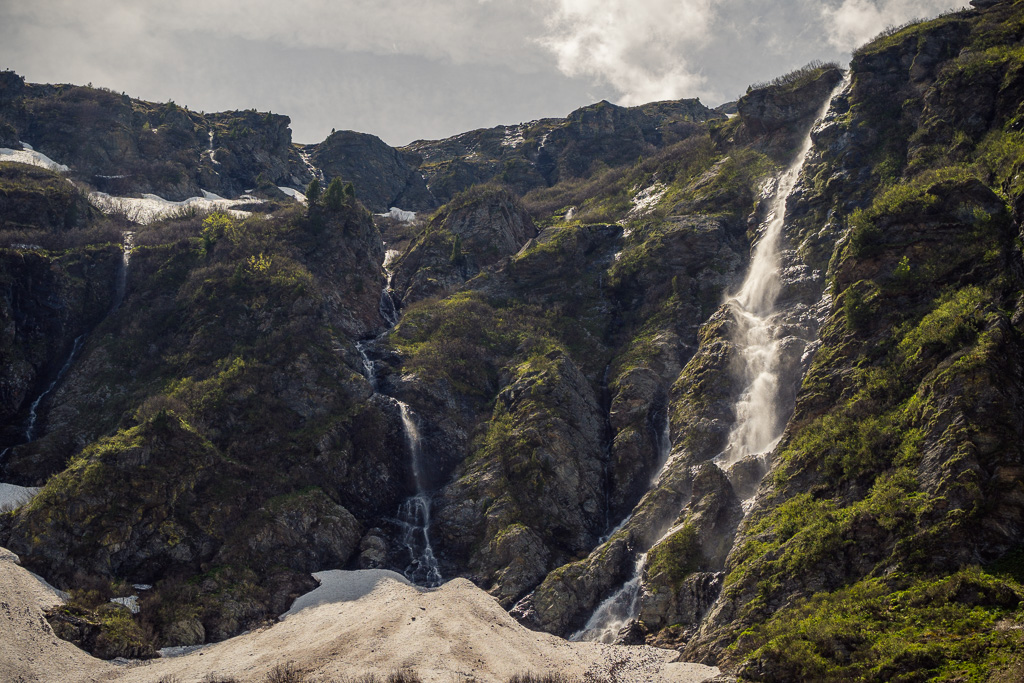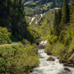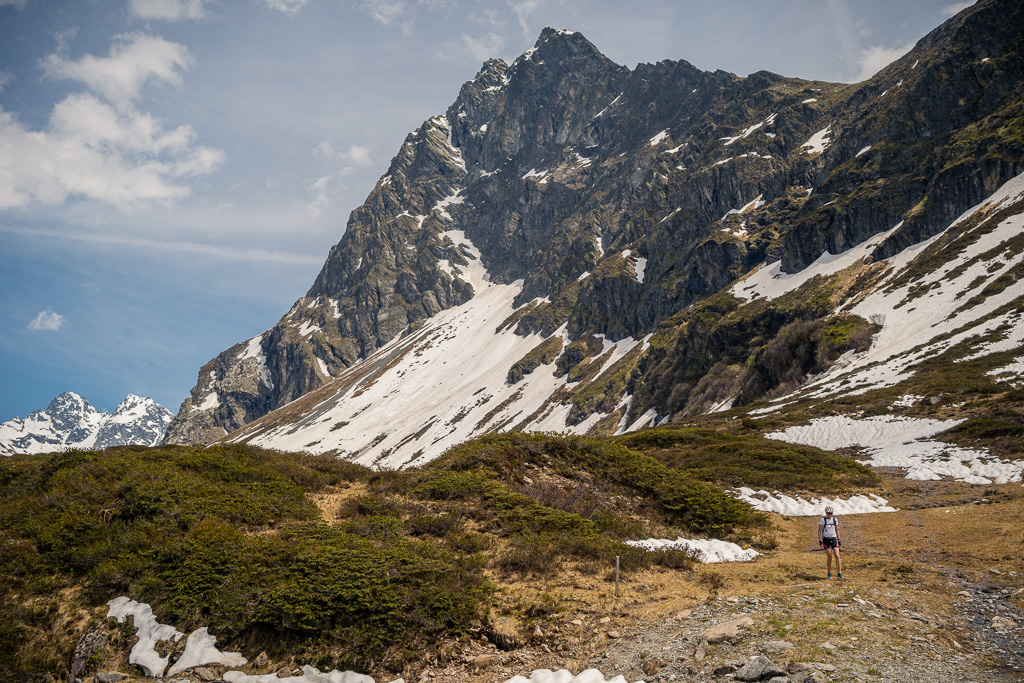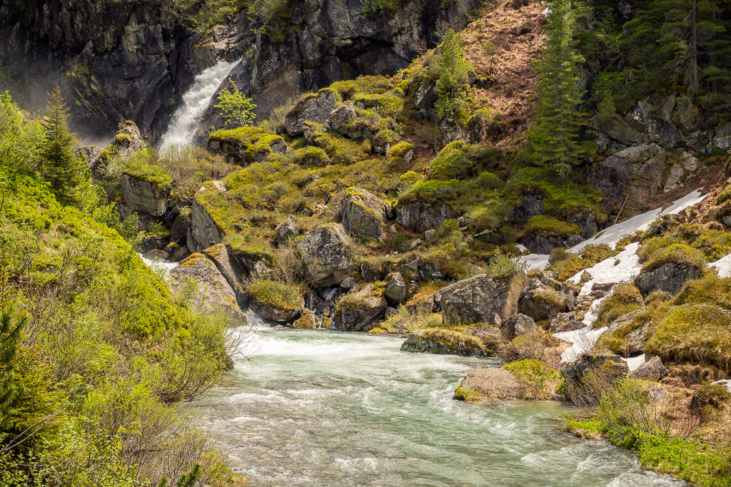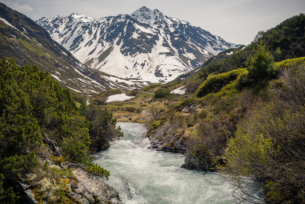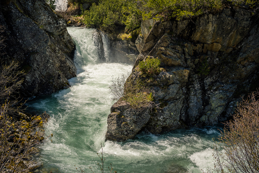 Die erste Wegetappe führte uns dem rauschenden Landquartfluss entlang im offenen Talboden von Klosters nach Monbiel im Osten. Weiter hinten begann dann der Aufstieg im Wald durchs Vereinatal. Das Tal war über weite Strecken schluchtartig, der Weg stieg hoch über dem rauschenden Vereinabach steil am Hang entlang empor. Immer wieder waren Wasserfälle und Bäche zu sehen, die aus den angrenzenden Steilhängen in die Schlucht stürzten. Nach mehreren kräftezehrenden Kilometern kamen wir bei Hafenbrugg bei einer Brücke über den Vereinabach an. Hier öffnete sich das Tal, der Weg flachte enorm ab und von hier war es dann nicht mehr weit zum Berghaus, das sich hinten im Tal vor der Kulisse der beeindruckenden Unghürhörner abzeichnete.
