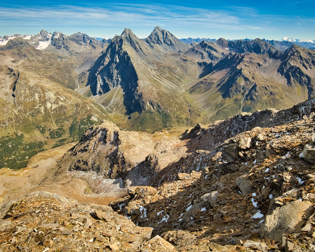 Vom Gipfel ein Stück nach Norden, dann auf dem markierten Wanderweg über den nordwestlichen Gratausläufer absteigen. Rechts in der Nordflanke sind die Überreste vom Hafentälligletscher zu sehen. Später führt der Weg über Weidegelände in einiger Entfernung vom kleinen Pischasee hinab.