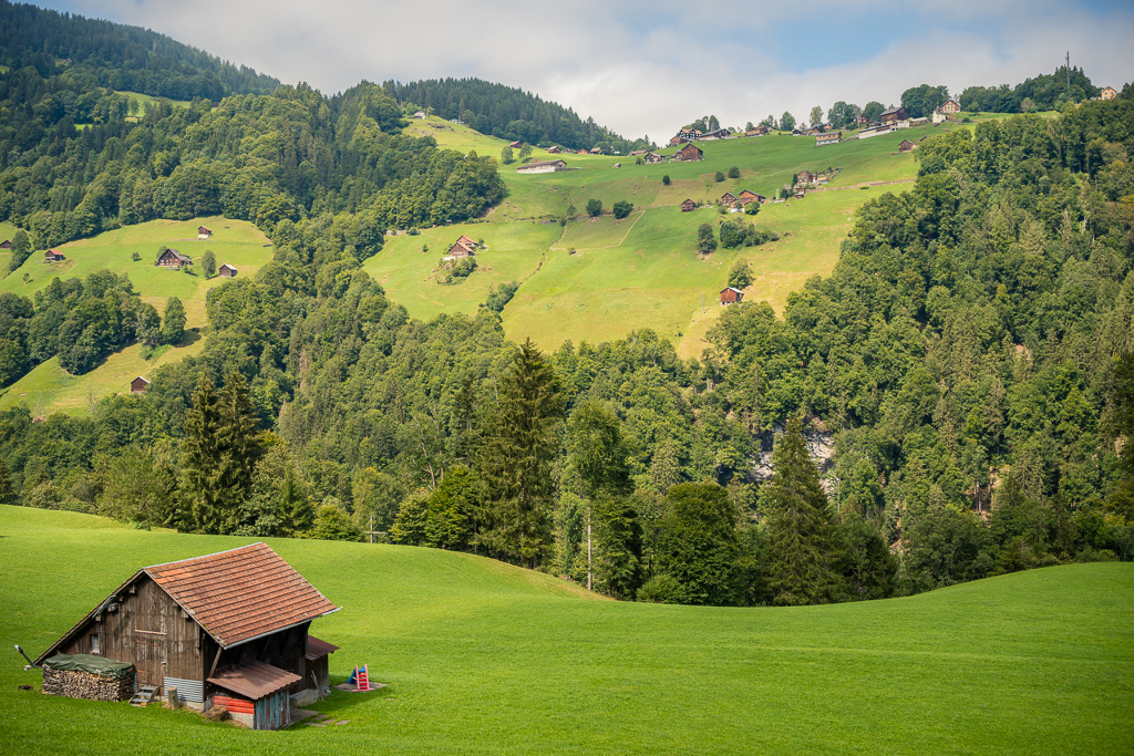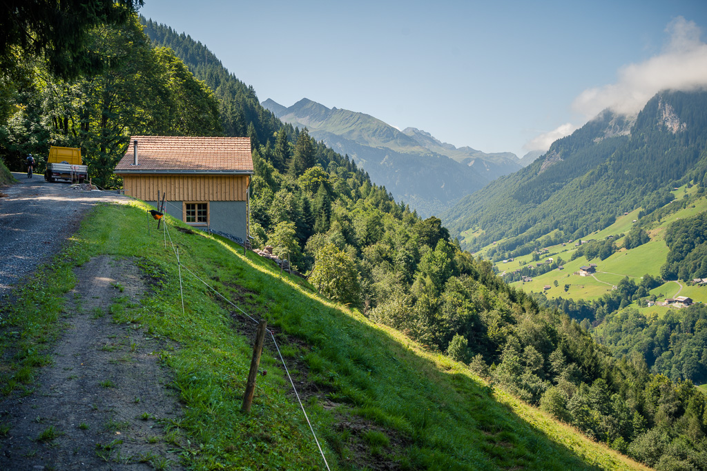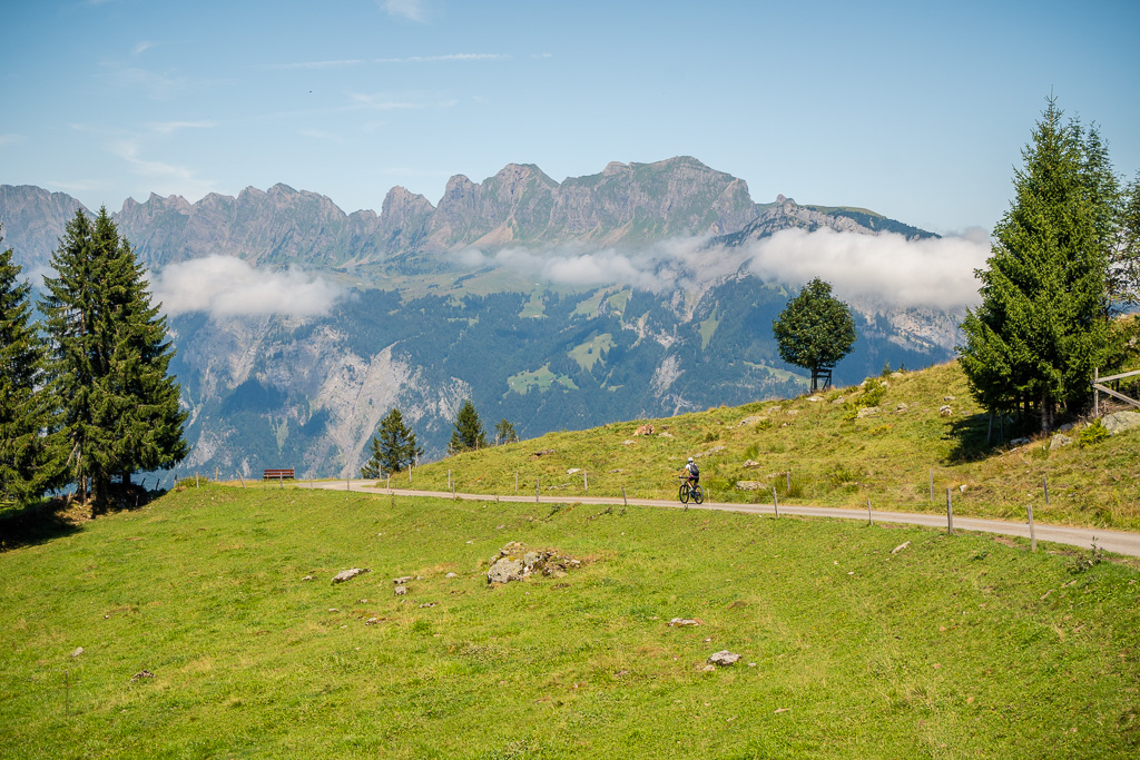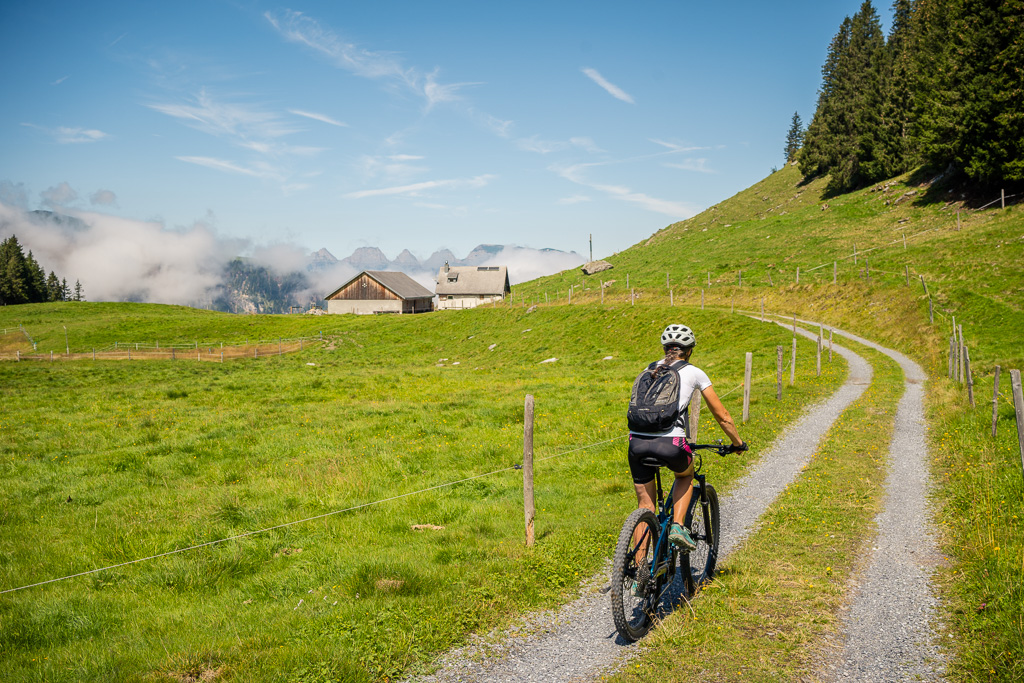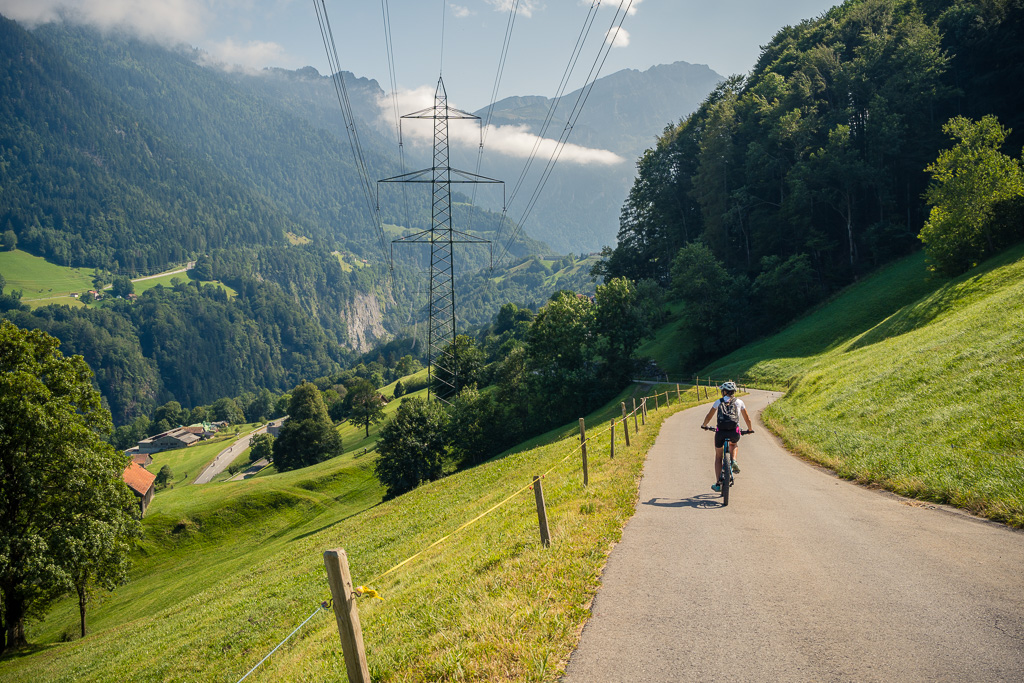 Nun ging es zunächst wieder ein schönes Stück auf der Alpstrasse bergab und über Herenboden nach Cholgrueb. Von dort trennte uns noch ein kleiner Aufstieg von den Höfen bei Wildboden, von wo aus es dann durchgehend bergab nach Bad Ragaz gehen würde. Im Höhenprofil auf dem Bikecomputer erschien dies nur als ein kleiner, allerdings sehr spitz aussehender Zacken von rund 100 Hm, also fast nicht mehr erwähnenswert nach den bisher bewältigten fast 1700 Höhenmetern.