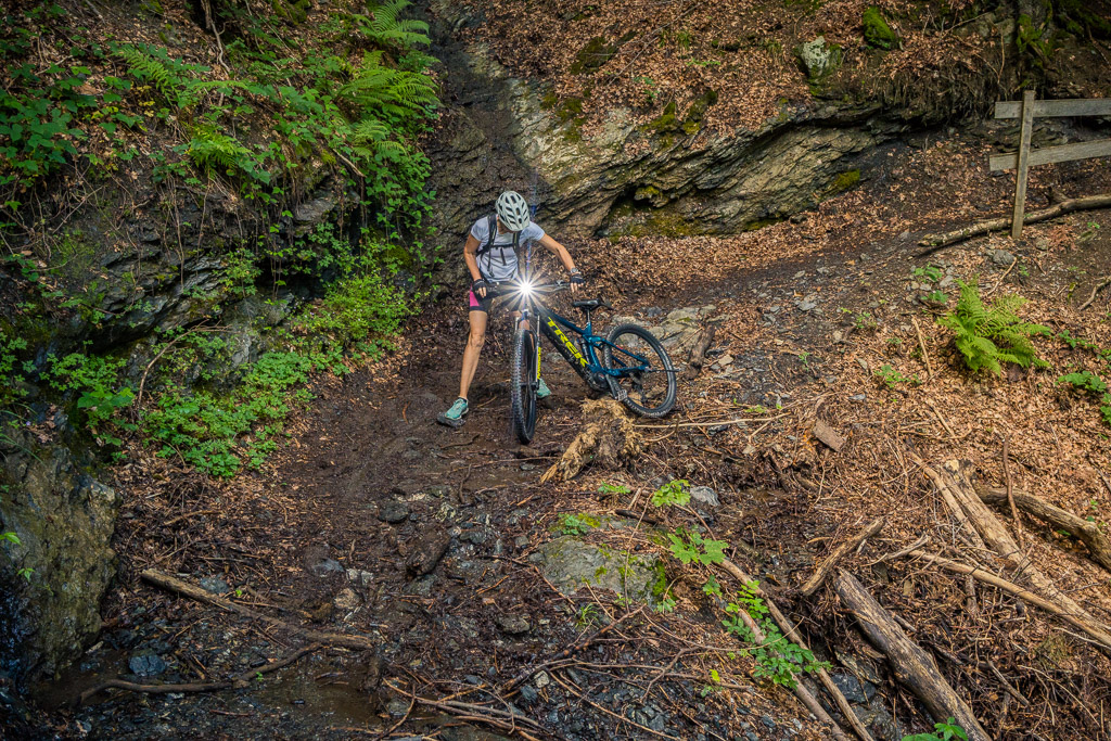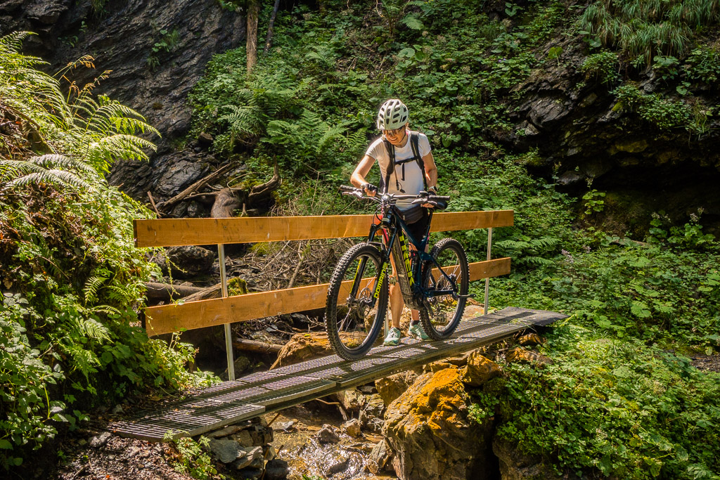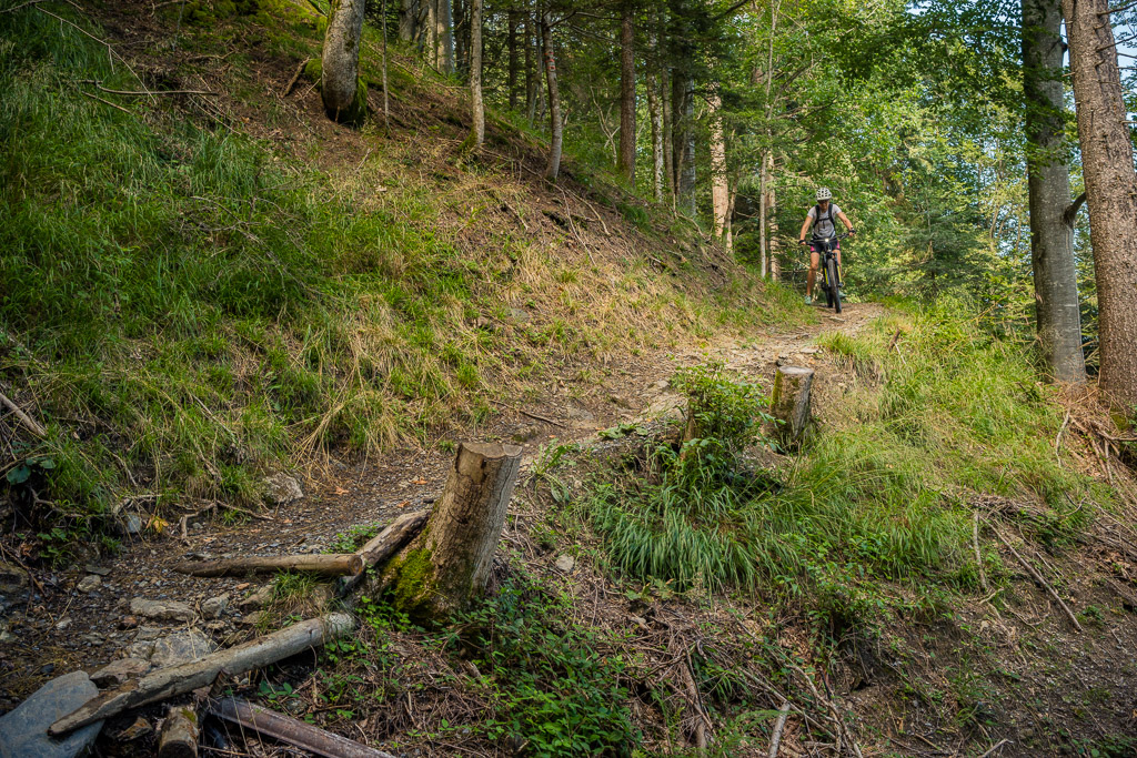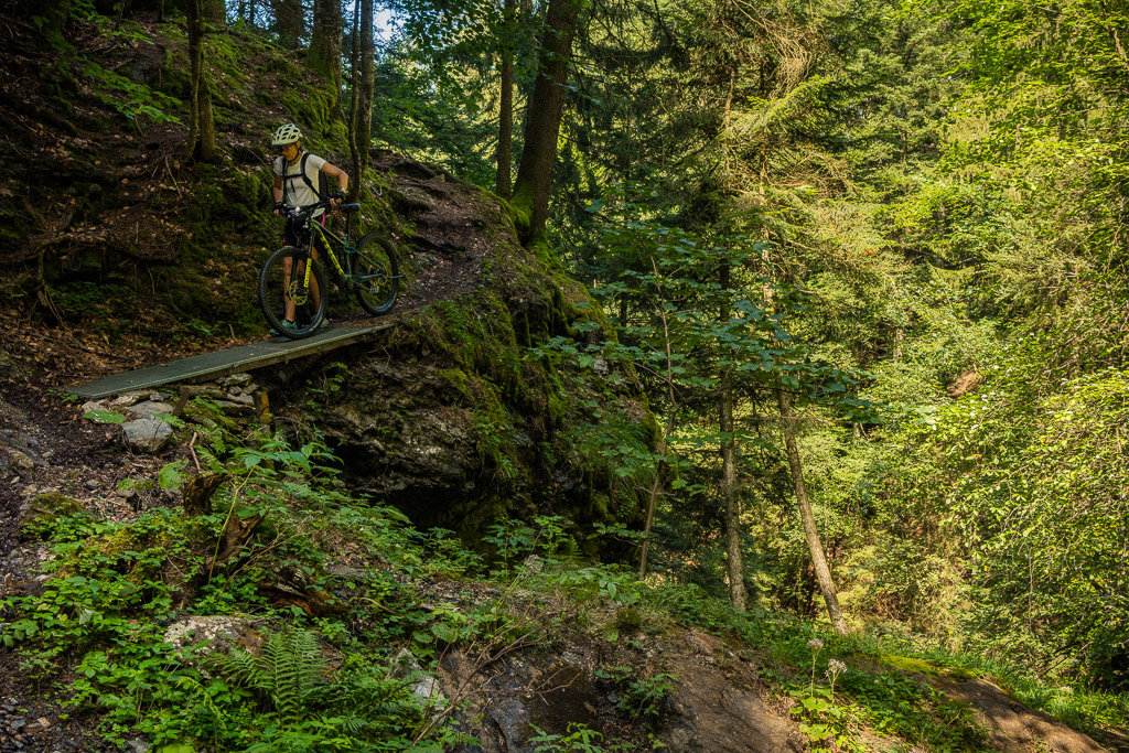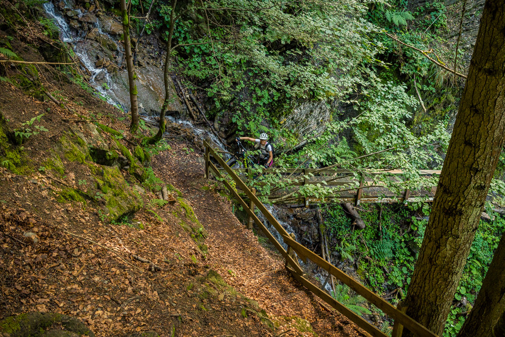 Hinter Schönbüel begann ein abenteuerlicher Singletrail, der wohl den technisch anspruchsvollsten Teil der Tour darstellte. Er führte im Steilwald hangabwärts und während es schon in den geraden Passagen nicht ratsam war, auf die falsche Seite zu fallen, galt dies erst recht bei den zahlreichen Bachrinnen, die zu überqueren waren. Hier machte der Trail regelmässig einen fast rechtwinkligen Knick über glitschige Wasserläufe, die auf der linken Wegseite sehr steil in die Tiefe stürzten. Wir schoben aus Sicherheitsgründen an zahlreichen Stellen und erreichten schlussendlich eine Brücke über den Vilterser Bach, auf deren anderen Seite wieder ein Fahrweg begann. Von hier aus fuhren wir weiter durch den Wald bis nach Narrenberg.