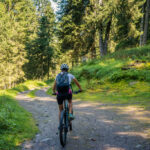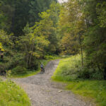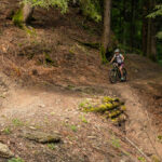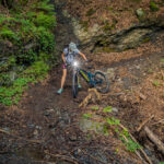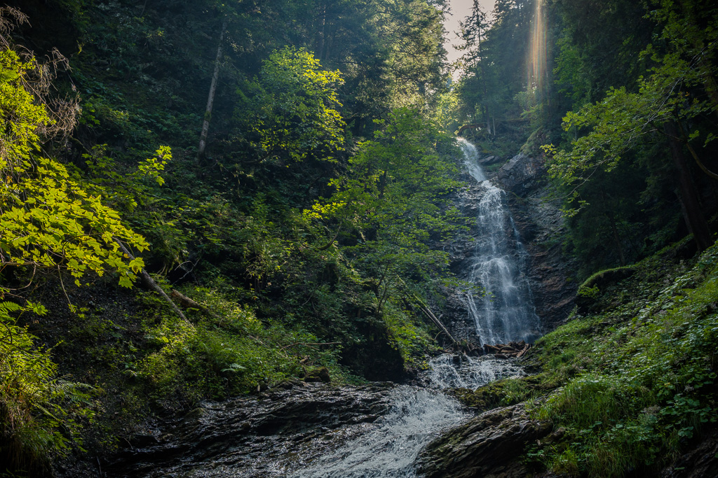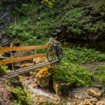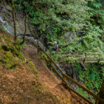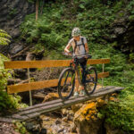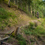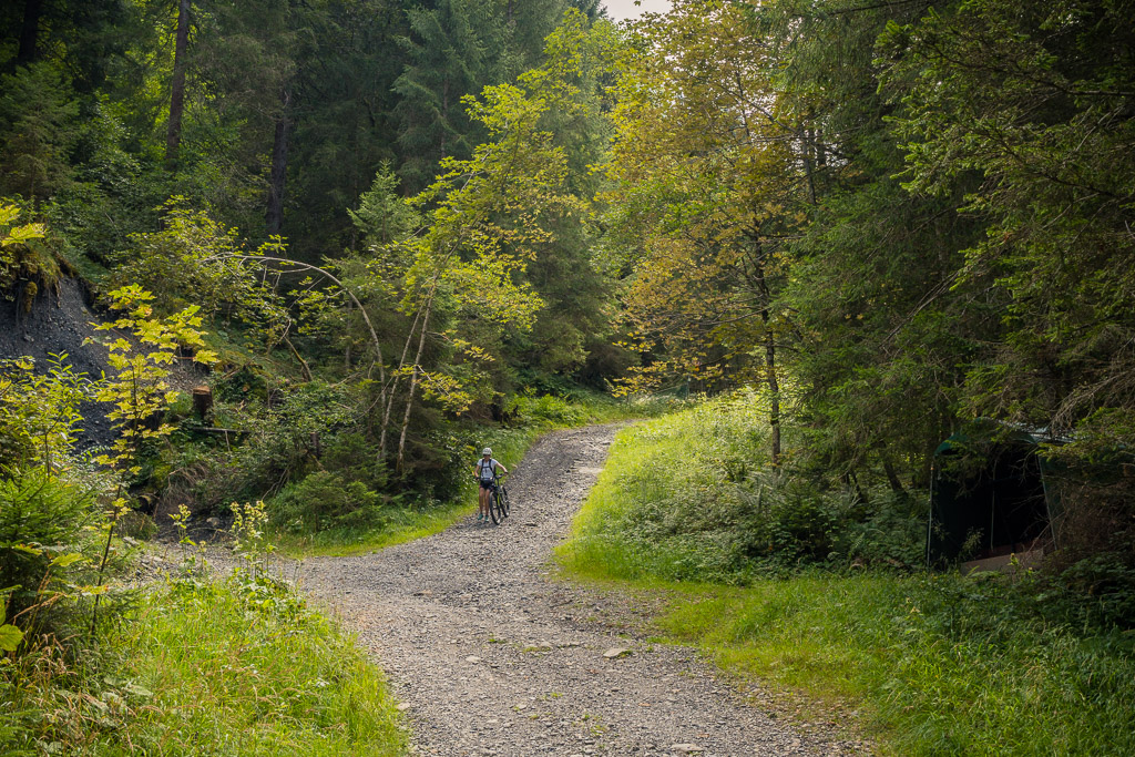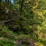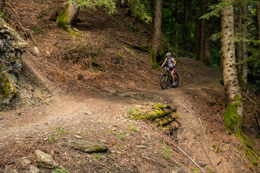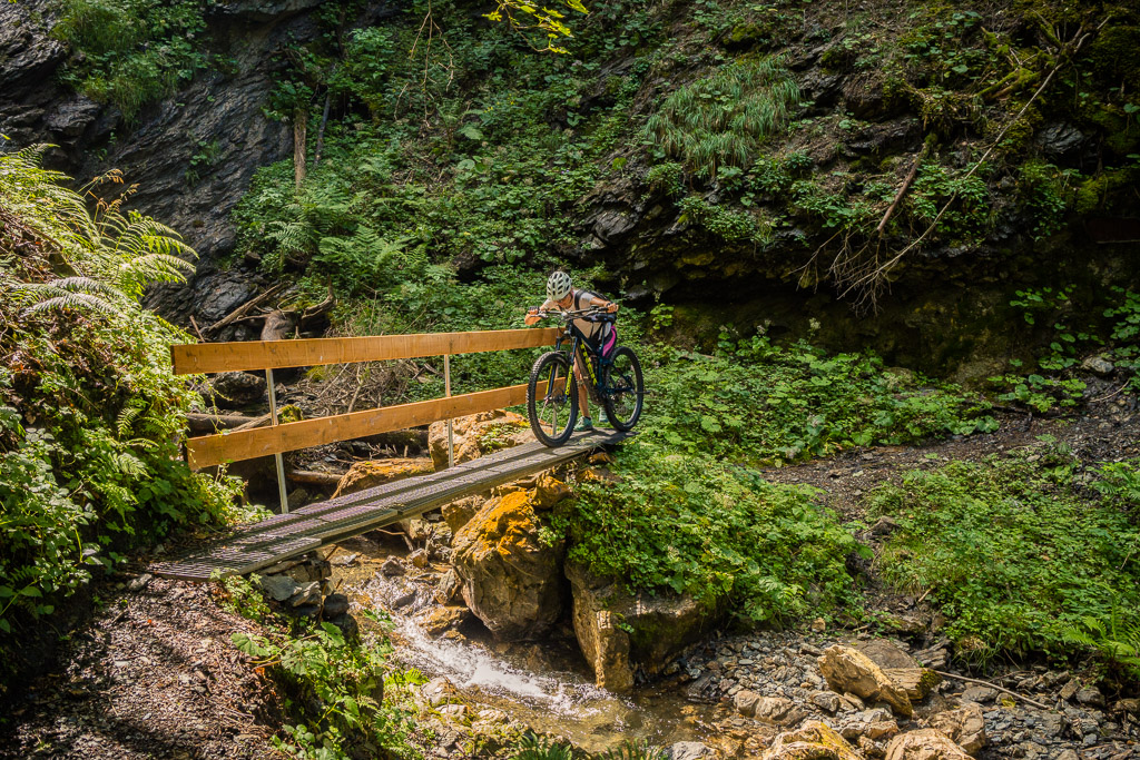 Hinter Schönbüel begann ein abenteuerlicher Singletrail, der wohl den technisch anspruchsvollsten Teil der Tour darstellte. Er führte im Steilwald hangabwärts und während es schon in den geraden Passagen nicht ratsam war, auf die falsche Seite zu fallen, galt dies erst recht bei den zahlreichen Bachrinnen, die zu überqueren waren. Hier machte der Trail regelmässig einen fast rechtwinkligen Knick über glitschige Wasserläufe, die auf der linken Wegseite sehr steil in die Tiefe stürzten. Wir schoben aus Sicherheitsgründen an zahlreichen Stellen und erreichten schlussendlich eine Brücke über den Vilterser Bach, auf deren anderen Seite wieder ein Fahrweg begann. Von hier aus fuhren wir weiter durch den Wald bis nach Narrenberg.