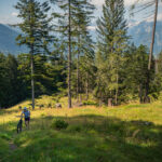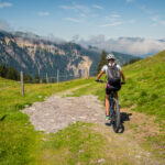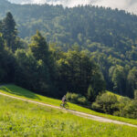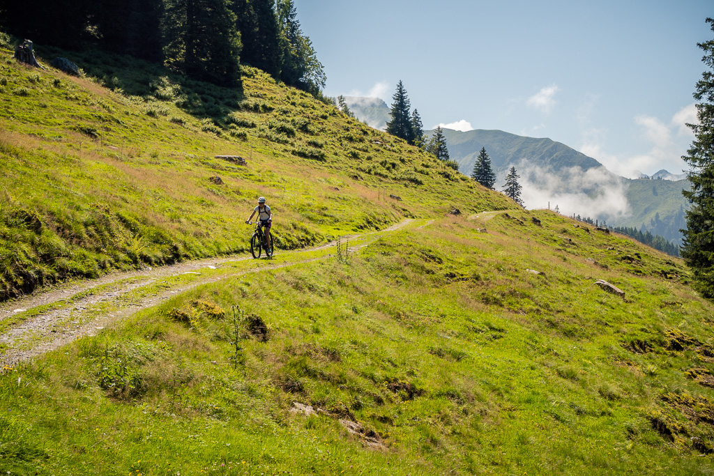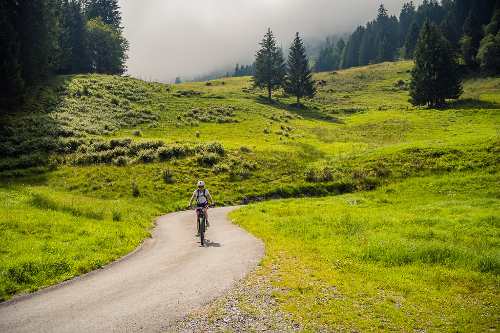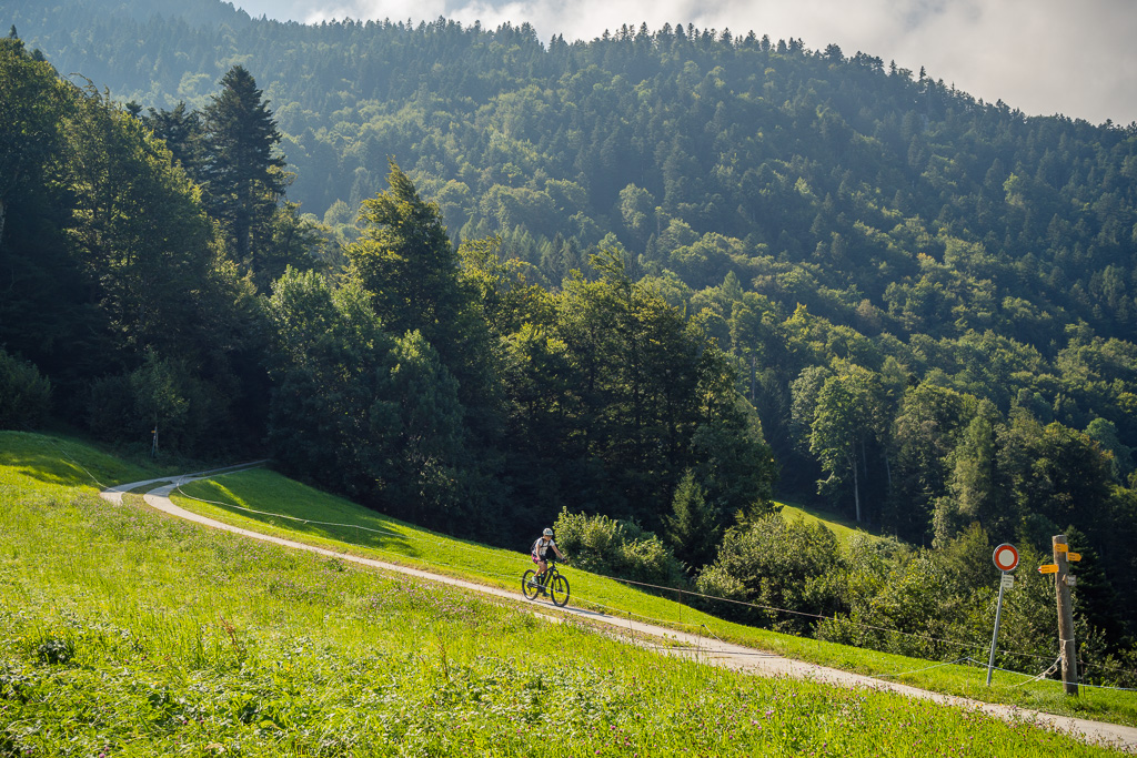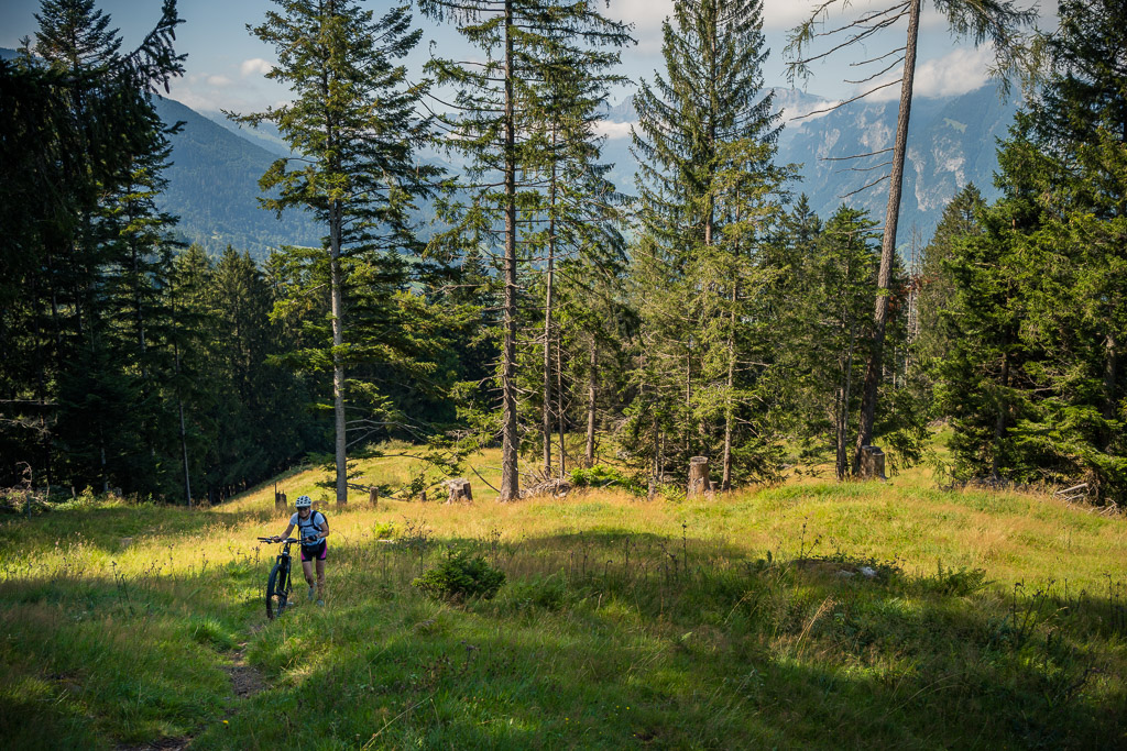 Vor Ort stellte sich allerdings heraus, dass dieser kleine Zwischenabschnitt ein enger und feuchter Wurzelpfad in einem steilen Waldhang war. Das Mountainbike konnte ich mit Müh und Not über die exponierte Passagen und Wegkehren in etwas flacheres Gelände weiter oben befördern, beim E-Bike wäre man allein hingegen chancenlos geblieben. Zu zweit zerrten wir das schwere Gefährt an Vorder- und Hinterrad nach oben und wankten erschöpft zu einem Weidegatter am Waldrand. Dann mussten wir die Bikes nochmals ein gutes Stück über die holprige Weide hinaufschieben, bis wir endlich in einer Kurve den Fahrweg zur Alp Halden erreichten.