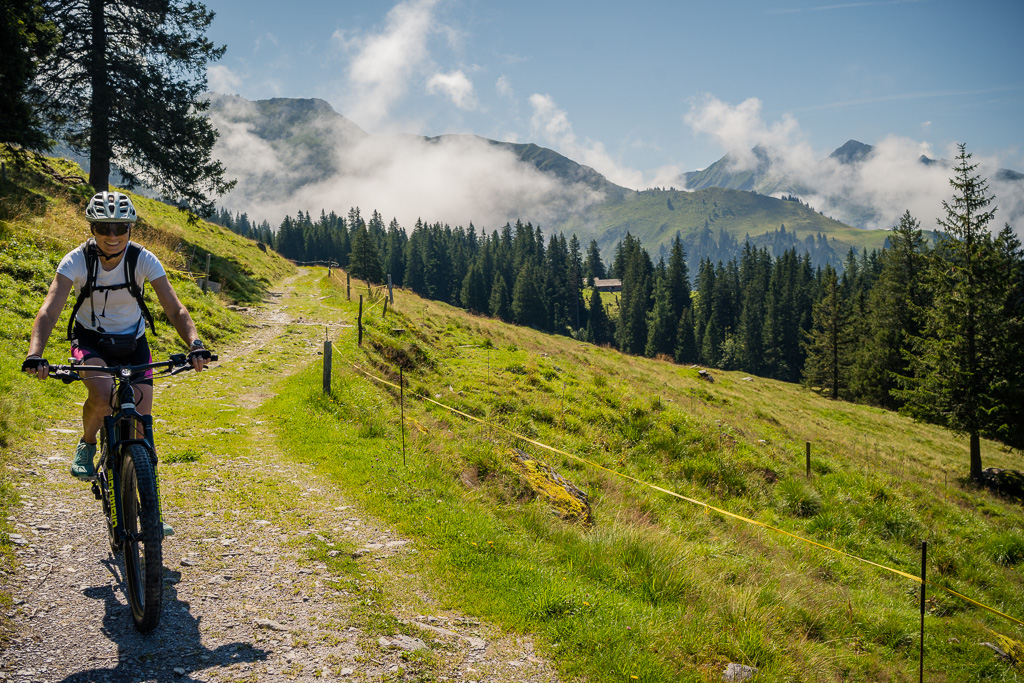 Umso grösser dann die böse Überraschung für mich, dass sich dieses Stück so kurz vor Schluss tatsächlich noch als die heftigste Steigung des ganzen Tages entpuppte. Auf einer losen und zusätzlich kraftraubenden Kiesunterlage ging es sehr steil nach oben. Nach der hinter uns liegenden Abfahrt kam dies wieder einem Kaltstart aus dem Stand gleich, und ziemlich ausser Atem erreichte ich schwitzend und im Schneckentempo kurbelnd den Wendepunkt, von wo aus der Weg wieder bergab nach Wildboden führte.