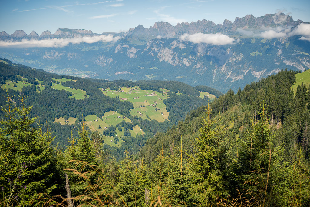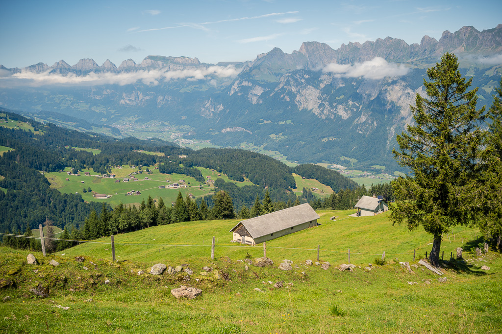 Nun folgte eine lange Abfahrt auf Alpwegen über Hinterwald und Gampidells bis zum Gasthof bei Schönbüel. Von der Aussicht her war dies der schönste Teil der Strecke mit einem eindrücklichen Blick auf die Churfirsten, die dichtbesiedelte Region um Sargans und auf das Rheintal, das sich bis zum Horizont hin erstreckte.